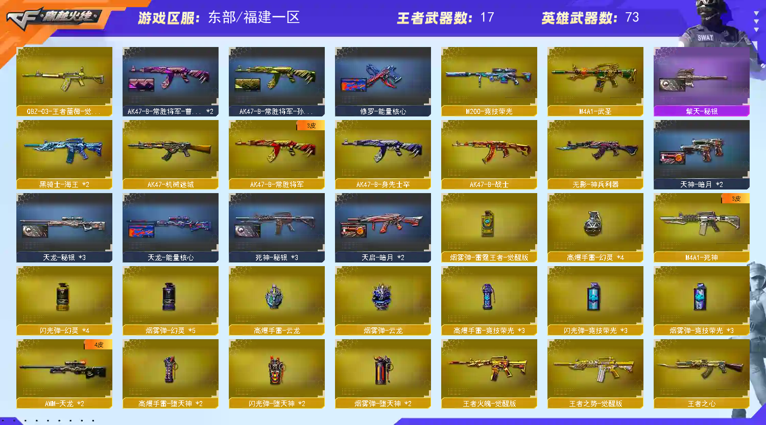 【m200幻神+幻神音效卡+宠儿 】【m200竞技荣光套+usp雷暴+四防云悠悠】【qbz金色蔷薇+卡】【火麒麟】【黑龙】【雷神+卡+宠儿+n9皮肤】【毁灭+卡+cfs2018+荣耀之怒】【极光】【武器:武圣 王者之势 王者火魄 海王 qbz王者蔷薇 炼狱 烈龙*4】【10手枪:修罗*4 天神 雷暴 幻灵 竞技荣光 雷霆王者 】【12刀具:屠龙*3 擎天 堕天神 幻灵之峰 竞技荣光 王者之啸*4 王者之击】【8雷套:堕天神*2 幻灵雷*4 竞技荣光雷*3】【音效卡:雷神音效卡 幻神音效卡 金色蔷薇音效卡 毁灭音效卡 】【四防角色:云悠悠 王者葵貂蝉 王者玲珑小乔 职业经理 】;USP-雷暴,电竞教官-云悠悠,QBZ03-金色蔷薇,M200-幻神,