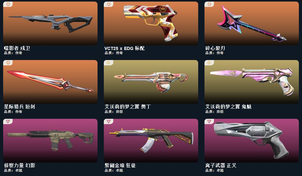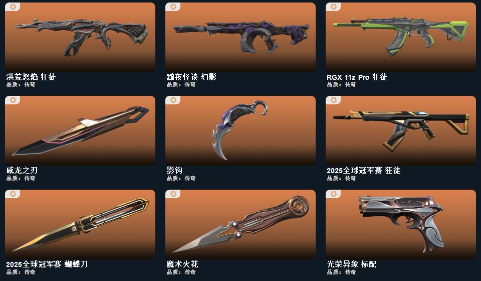 wegame无畏契约★碎心裂刃,威龙之刃,2025全球冠军赛 蝴蝶刀,星际猎兵 短剑,影钩,魔术火花,幻心猎手 鬼魅,紫阙金琅 狂徒,诛心猎手 冥驹,诛心猎手 奥丁