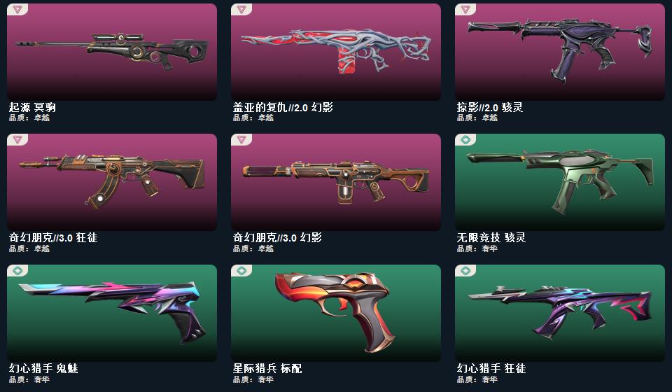 wegame无畏契约★武器皮肤数量:47,碎心裂刃,威龙之刃,2025全球冠军赛 蝴蝶刀,星际猎兵 短剑,影钩,魔术火花,幻心猎手 鬼魅,紫阙金琅 狂徒,诛心猎手 冥驹,诛心猎手 奥丁