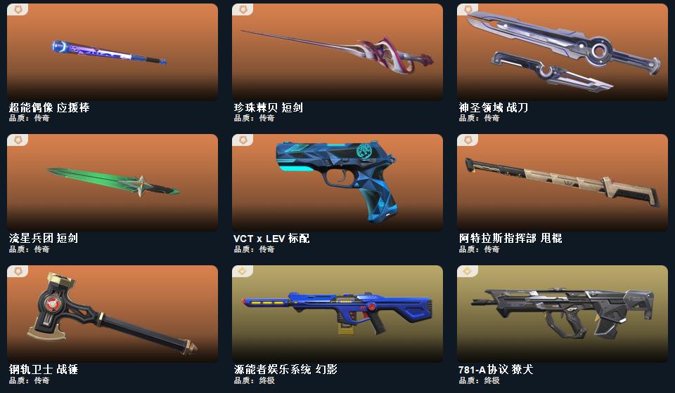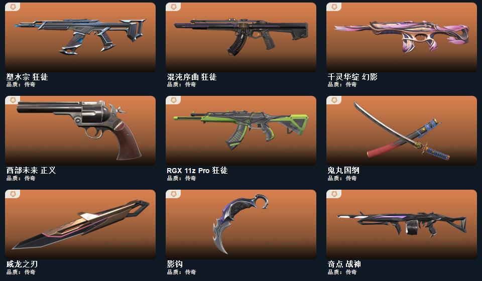 wegame无畏契约★武器皮肤数量:119,影钩,VCT 2025 爪刀,神圣领域 战刀,鬼丸国纲,超能偶像 应援棒,流星兵团 短剑,珍珠棘贝 短剑,钢轨卫士 战锤,威龙之刃,幻心猎手 鬼魅,悠闲猫生 幻影,特拉斯指挥部 莽侠