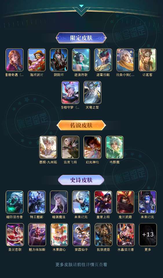 v10、537皮6水4无双、安琪拉-颠倒童话·魔镜、朵莉亚-神骥、遇见神鼓、齐天大圣、白虎志、韩信荣耀典藏、73传说、时之魔女、瑶无双、青丘、九尾、神器明辉仪