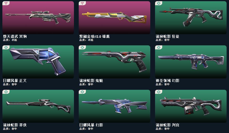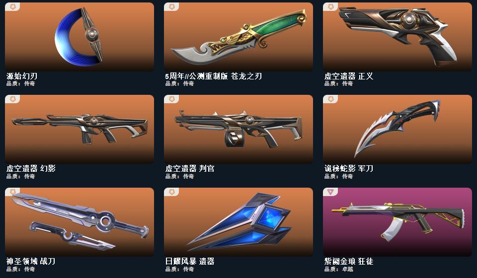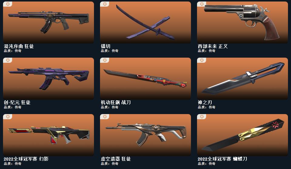wegame无畏契约★2022全球冠军赛 蝴蝶刀,5周年//公测重制版 苍龙之刃,日耀风暴 遗器,神之刃,诡秘蛇影 军刀,源始幻刃,机动狂飙 战刀,神圣领域 战刀,镭切,火线狂怒,日耀风暴 骇灵,2022全球冠军赛 幻影,甜蜜战术 冥驹,日耀风暴 奥丁