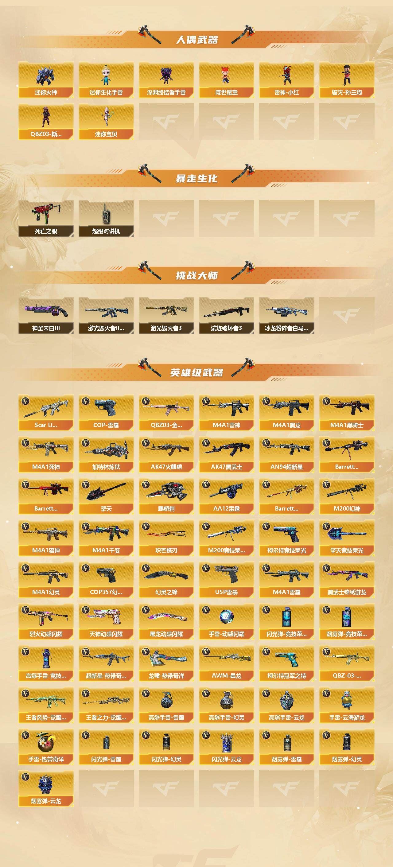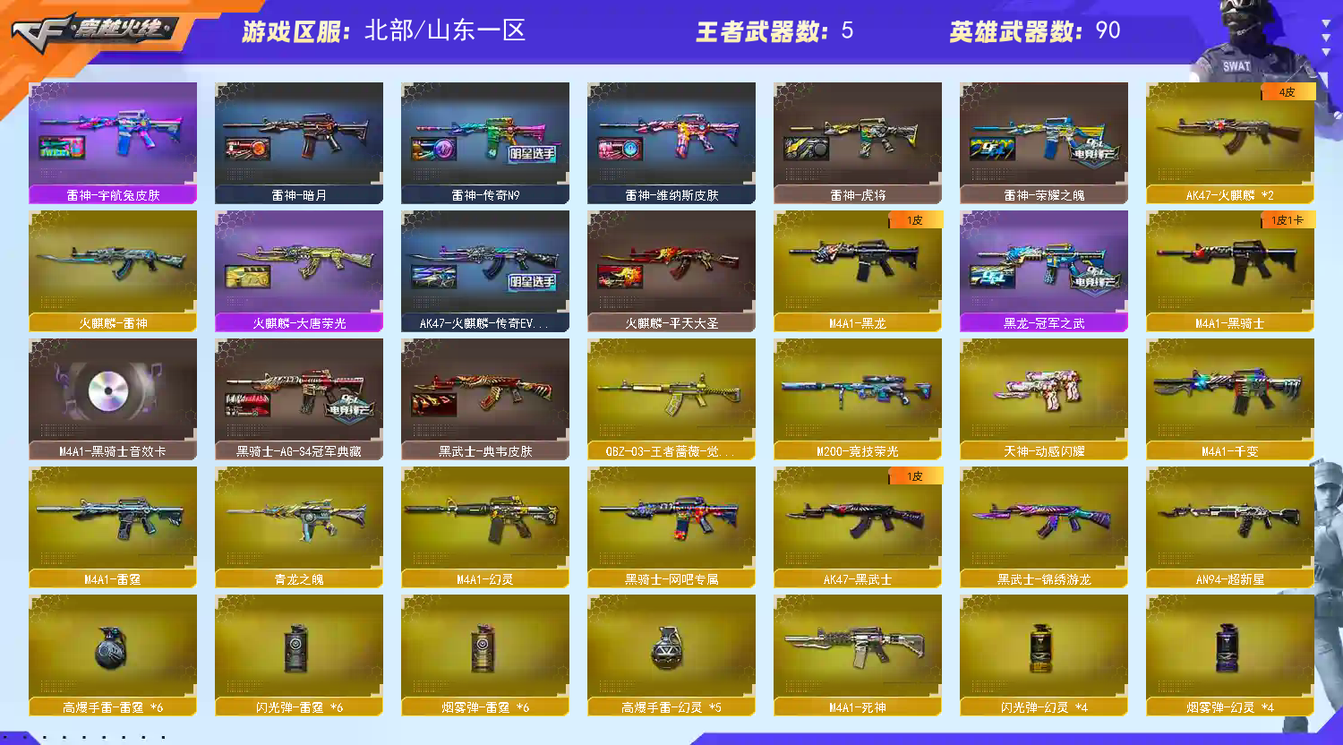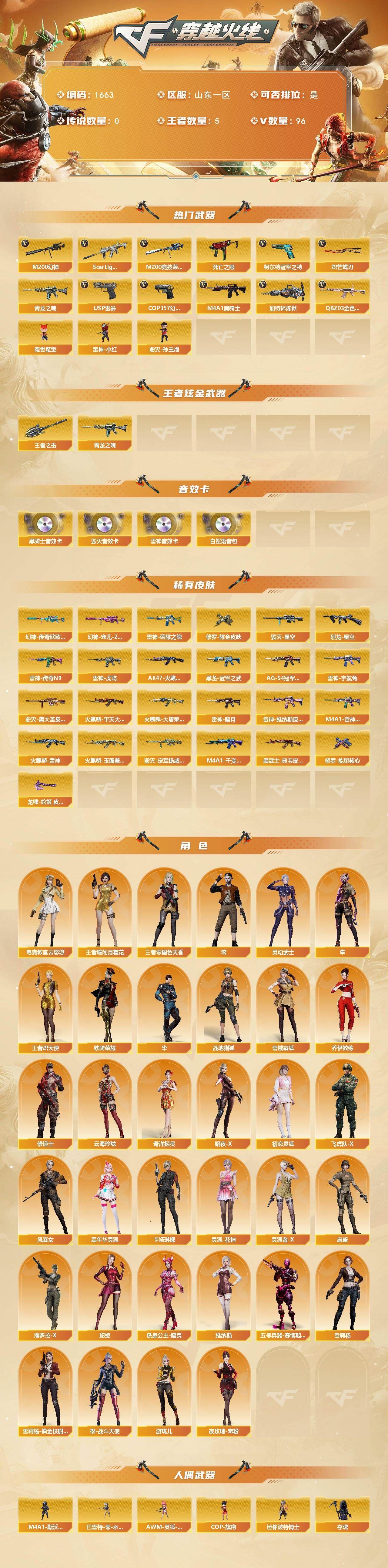 【热门武器】:QBZ03-金色蔷薇,Scar Light-白虎,M200-幻神,M200-竞技荣光,死亡之眼,青龙之魄,柯尔特-冠军之特,M4A1-黑骑士,加特林-炼狱,降世魔童,雷神-小红,毁灭-孙三炮,USP-雷暴,COP 357-幻灵,炽芒蝶刃【王者炫金武器】:青龙之魄,王者之击【音效卡】:M4A1-雷神音效卡,M4A1-黑骑士音效卡,Barrett-毁灭音效卡,白鲨语音包【皮肤】:幻神-宠儿-2021MVP,幻神-传奇欧欧 皮肤,烈龙-星空,雷神-暗月,雷神-荣耀之魄,雷神-虎将,雷神-传奇N9,雷神-宇航兔皮肤,雷神-维纳斯皮肤,M4A1-雷神-巅峰荣耀皮肤,火麒麟-雷神*2,AK47-火麒麟-传奇EVEN,火麒麟-平天大圣,火麒麟-大唐荣光,火麒麟-玉面羞花 皮肤,毁灭-星空,毁灭-黑大圣皮肤,毁灭-定军扬威 皮肤,M4A1-千变-孔明皮肤,黑龙-冠军之武,黑骑士-AG-S4冠军典藏,黑武士-典韦皮肤,修罗-能量核心,修罗耀金皮肤,龙啸-蛇姬 皮肤【角色】:炫,电竞教官-云悠悠,隼,华,战地猎狐,王者-瞳-闭月羞花,王者-零-国色天香,王者炽天使,雪域霜狐,奇洋探员,乔伊教练,修道士,云海玲珑,暗夜-X,初恋灵狐,飞虎队-X,风暴女*2,嘉年华灵狐,卡塔琳娜,灵动武士,灵狐-花神,灵狐者-X,麻雀,潘多拉-X,蛇姬,铁骑荣耀,铁扇公主-暗灵,维纳斯,五号兵器-赛博朋克,雪莉杨,雪莉杨-摸金校尉,夜玫瑰-宠粉,樱-战斗天使,游珑儿【人偶武器】:雷神-小红,毁灭-孙三炮,迷你宝贝,巴雷特-零-水下丽影,AWM-灵狐-15周年嘉年华,COP-旗袍*3,迷你波特博士,夺魂,迷你火种,迷你生化手雷,深渊终结者手雷,M4A1-斯沃特,QBZ03-斯沃特,降世魔童【暴走生化】:死亡之眼,超级对讲机【挑战大师】:冰龙粉碎者-白马银枪,激光毁灭者III-白马银枪,激光毁灭者III*2,试炼破坏者III,神圣爆裂者-末日III【英雄级武器】:M4A1-千变,AK47-火麒麟*2,M4A1-黑龙,M4A1-雷神*4,M4A1-黑骑士,M4A1-死神,AK47-黑武士,AN94-超新星,M4A1-雷霆,Scar Light-白虎,M4A1-幻灵,黑武士-锦绣游龙,超新星-热带奇洋,QBZ03-金色蔷薇,M4A1-猎神,烈火-动感闪耀,QBZ-03-王者蔷薇-觉醒版,王者风势-觉醒版,Barrett-毁灭,Barrett-极光,M200-幻神,Barrett-朱雀,M200-竞技荣光,王者之力-觉醒版,加特林-炼狱,AA-12-雷霆,USP-雷暴,COP-雷霆,COP 357-幻灵,柯尔特-冠军之特,柯尔特-竞技荣光,天神-动感闪耀,擎天,麒麟刺*2,幻灵之锋,擎天-竞技荣光,炽芒蝶刃,屠龙-动感闪耀,龙啸-热带奇洋,高爆手雷-雷霆*6,高爆手雷-幻灵*5,高爆手雷-竞技荣光*2,手雷-动感闪耀,高爆手雷-云龙,手雷-云海游龙,手雷-热带奇洋,闪光弹-雷霆*6,闪光弹-幻灵*4,闪光弹-竞技荣光*5,闪光弹-云龙,烟雾弹-雷霆*6,烟雾弹-幻灵*4,烟雾弹-竞技荣光*2,烟雾弹-云龙,AWM-昌龙【道具】:全能枪王背包,奇洋探员-海龟背包,炫彩背包,热带奇洋炫彩背包,臻选金狐背包,超级背包,雪域霜狐炫彩背包,哔哩哔哩名片,救世主-黑桃战神,绿色巨人,灵魂忍者*2,变异宝贝,迷雾幽灵*2,生化弹匣,夺命之镰,防化服*2,金色流光-枪王排位*2,星辰流光-枪王排位,流光-再燃火线,枪王排位28赛季金色流光,语音特效-怀旧,语音特效-生化,雪域霜狐表情,热带奇洋表情,动感闪耀表情,EP战队收纳包,EP战队名片,防弹头盔*2,防弹衣*2,C4工具钳*2,手雷包*2【特殊枪械】:1白虎,1黑骑士,1炼狱】;USP-雷暴,柯尔特-冠军之特,炽芒蝶刃,隼,电竞教官-云悠悠,QBZ03-金色蔷薇,M200-幻神,