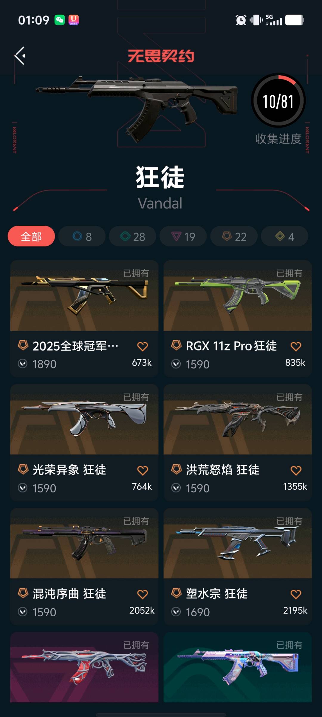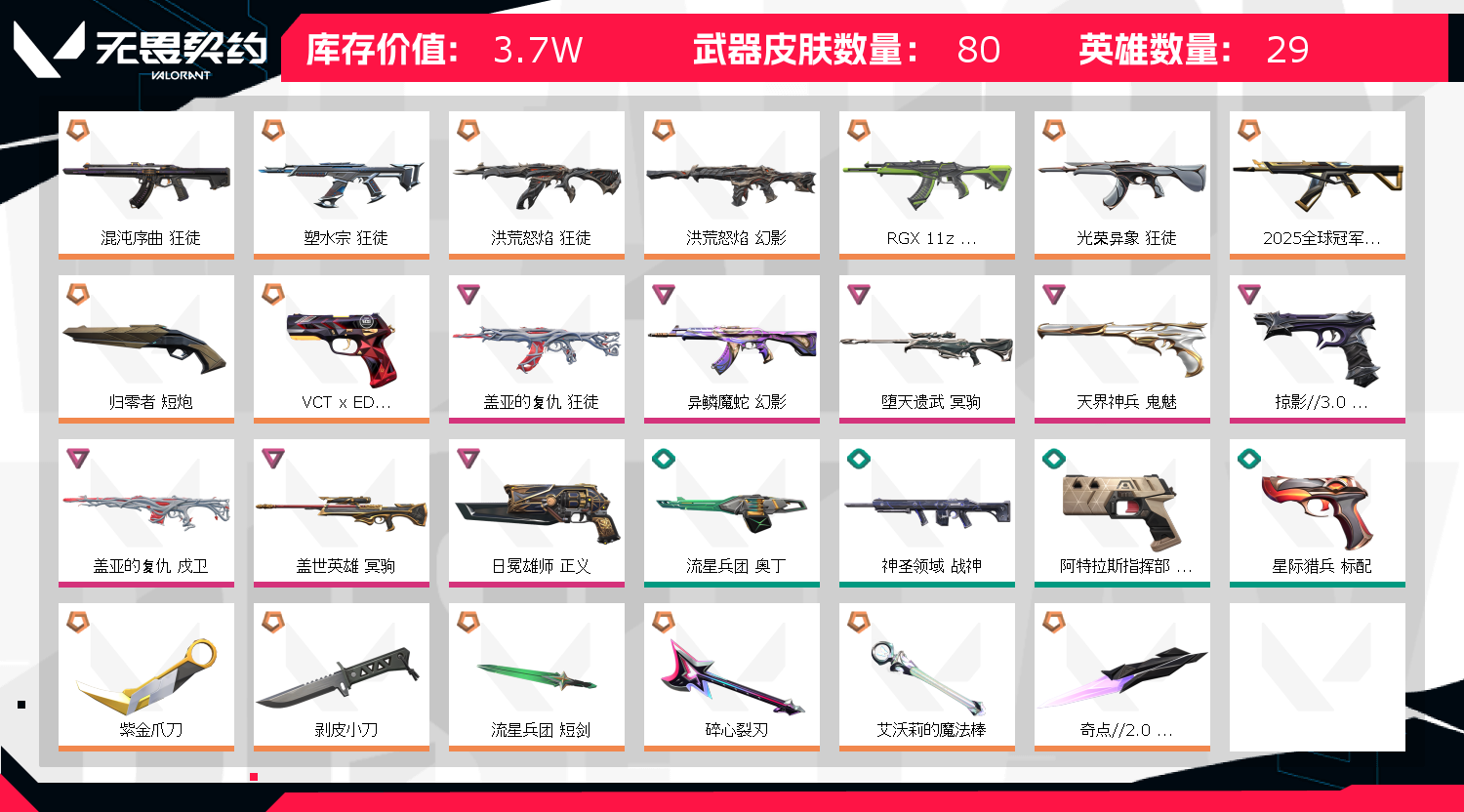 允许 英雄28 武器皮肤数量78;紫金爪刀,剥皮小刀,盖亚的复仇 狂徒,洪荒怒焰 狂徒,异鳞魔蛇 幻影,洪荒怒焰 幻影,RGX 11z Pro 狂徒,