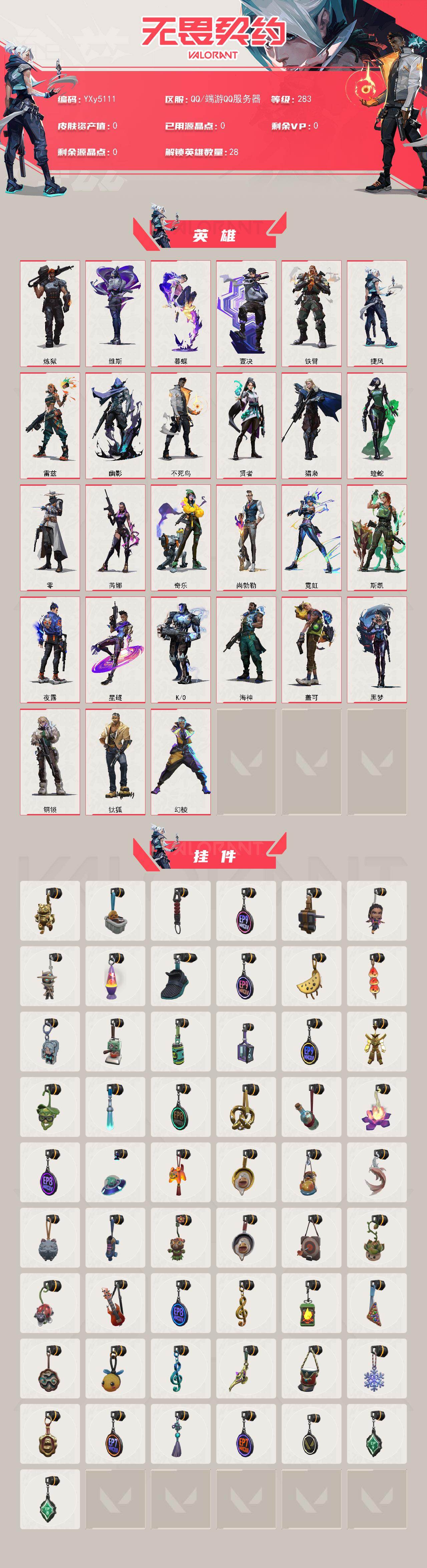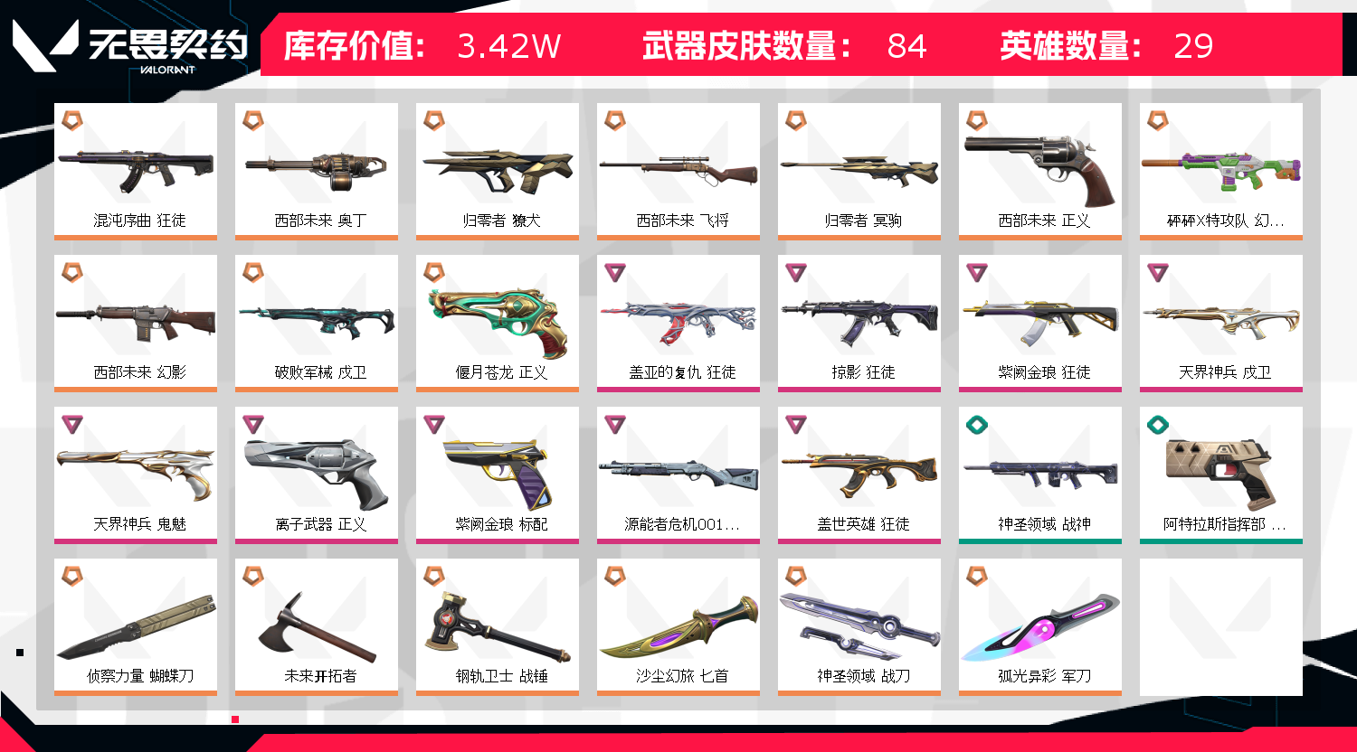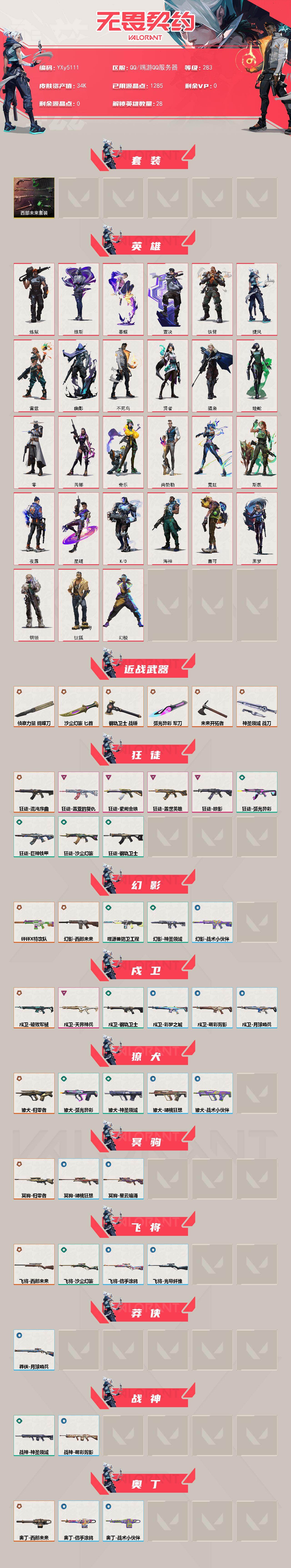 【套装】:西部未来套装 【英雄】:幻棱,炼狱,维斯,暮蝶,钛狐,壹决,铁臂,捷风,雷兹,幽影,不死鸟,贤者,猎枭,蝰蛇,零,芮娜,奇乐,尚勃勒,霓虹,斯凯,夜露,星礈,K/O,海神,盖可,黑梦,钢锁 【近战武器】:近战武器-侦察力量 蝴蝶刀,近战武器-未来开拓者,近战武器-钢轨卫士 战锤,近战武器-弧光异彩 军刀,近战武器-沙尘幻旅 匕首,近战武器-神圣领域 战刀 【狂徒】:狂徒-混沌序曲,狂徒-掠影,狂徒-盖世英雄,狂徒-盖亚的复仇,狂徒-紫阙金琅,狂徒-钢轨卫士,狂徒-弧光异彩,狂徒-巨神铁甲,狂徒-沙尘幻旅 【幻影】:幻影-砰砰X特攻队,幻影-西部未来,幻影-噬源兽防卫工程,幻影-神圣领域,幻影-战术小伙伴,幻影-西部未来 【戍卫】:戍卫-破败军械,戍卫-天界神兵,戍卫-钢轨卫士,戍卫-彩梦之城,戍卫-萌彩剪影,戍卫-月球哨兵 【獠犬】:獠犬-归零者,獠犬-弧光异彩,獠犬-神圣领域,獠犬-胡桃狂想,獠犬-战术小伙伴 【冥驹】:冥驹-归零者,冥驹-胡桃狂想,冥驹-星云暗涌 【飞将】:飞将-西部未来,飞将-沙尘幻旅,飞将-信手涂鸦,飞将-光导纤维 【莽侠】:莽侠-月球哨兵 【战神】:战神-神圣领域,战神-萌彩剪影 【奥丁】:奥丁-西部未来,奥丁-信手涂鸦,奥丁-战术小伙伴 【判官】:判官-萌彩剪影 【雄鹿】:雄鹿-源能者危机001,雄鹿-彩梦之城,雄鹿-月球哨兵 【骇灵】:骇灵-沙尘幻旅,骇灵-无限竞技,骇灵-光导纤维,骇灵-信手涂鸦,骇灵-星云暗涌 【蜂刺】:蜂刺-弧光异彩,蜂刺-胡桃狂想,蜂刺-战术小伙伴,蜂刺-星云暗涌 【标配】:标配-紫阙金琅,标配-超能偶像,标配-彩梦之城,标配-光导纤维 【正义】:正义-偃月苍龙,正义-西部未来,正义-离子武器,正义-超限闪存,正义-沙尘幻旅,正义-复古浪潮,正义-纳米击,正义-月球哨兵 【鬼魅】:鬼魅-天界神兵,鬼魅-流星兵团,鬼魅-诡秘蛇影,鬼魅-光导纤维,鬼魅-胡桃狂想,鬼魅-信手涂鸦,鬼魅-星云暗涌 【狂怒】:狂怒-钢轨卫士,狂怒-神圣领域,狂怒-萌彩剪影 【短炮】:短炮-钢轨卫士,短炮-弧光异彩 【卡面】:终章:激斗汉堡 卡面,进入射程 卡面,精灵大战 卡面,欢迎来到底城 卡面,南瓜盛典 卡面,VCT CN首冠 卡面,战术桌游 卡面,修车达人 卡面,热舞环节 卡面,正义的化身 卡面,终章:生意人麦宝 卡面,铁之华 卡面,时间到 卡面,最高舞台 卡面,树懒大作战 卡面,声感陷阱设计图 卡面,红鳞松叶 卡面,Clutch 卡面,霓帧牛蛙 卡面,钢锁工牌 卡面,采蜜小蜂队 卡面,梦幻奶茶 卡面,终章:打造专属狂徒 卡面,趁热吃 卡面,源能反应 卡面,暂别喧嚣 卡面,零点嗅探设计图 卡面,终章:瓦娃雪糕 卡面,表象之下 卡面,沙雕爆能器 卡面,无畏契约GO!一卷:芮娜 卡面,清除名单 卡面,无畏契约GO!一卷:零 卡面,终章:同步耍酷 卡面,龍记 卡面,化茧成蝶 卡面,比比看谁快? 卡面,无垠星环 卡面,《双城之战》金克丝 卡面,蝰蛇vs幽影 卡面,势不可挡//盖可 卡面,逆向独行 卡面 ,同步耍酷 卡面,完美调谐 卡面 ,有什么能逃过我的眼睛 卡面,光导纤维 卡面,战术小伙伴 卡面,钢轨卫士 卡面,暗枪 卡面,无畏契约GO!一卷:贤者 卡面,终章:黑影先生的咖啡! 卡面,铁臂vs雷兹 卡面,纪念照 P2 卡面,钢锁vs盖可 卡面,别冒尖 卡面,一击全倒 卡面,黑影先生的咖啡! 卡面,天台狂欢 卡面,胡桃狂想 卡面,沙尘幻旅 卡面,壹决工牌 卡面,萌彩剪影 卡面,势不可挡//K/O 卡面,夯实根基 卡面,"Luie" 卡面,热烈欢迎 卡面,铁臂设计图 卡面,代号红色 卡面,冰淇淋店 卡面,新兵报到 卡面,友军火力 卡面,V契约 卡面,无畏契约 卡面 【喷漆】:嗨宝南瓜灯 喷漆,控场勿近 喷漆,小丑猫 喷漆,熊抱 喷漆,蛋糕还是爆能器? 喷漆,超级粉丝 喷漆,捷风差距 喷漆,惊声尖叫 喷漆,拼一枪 喷漆,我觉得不行 喷漆,我的刀呢? 喷漆,UWU 喷漆,新潮流 喷漆,双人比心 喷漆,双击点赞 喷漆,买装还是存钱 喷漆,醒狮贺春 喷漆,关门放狗 喷漆,萌化了 喷漆,辣得好下饭 喷漆,飓刃涂鸦 喷漆 ,旅行小熊 喷漆,战术小伙伴 喷漆,又一个梦幻组合 喷漆,是大风刮来的 喷漆 ,静电火花 喷漆 ,今天的潮声甚是喧嚣 喷漆 ,请你冷静点 喷漆 ,蕊形灯 喷漆,这是你掉的吗? 喷漆,省钱大师 喷漆 ,皇冠拉花 喷漆,该转点了 喷漆,这招不行了 喷漆,放下武器 喷漆,真相只有一个 喷漆,自信满满 喷漆,凌空惊吓 喷漆,再吃最后一口 喷漆,我一个滑铲 喷漆,放手一搏 喷漆,沙尘幻旅 喷漆,萌彩剪影 喷漆,电烫 喷漆,暗中偷瞄 喷漆,胡桃狂想 喷漆,红牌退场 喷漆,爆泉领域 喷漆,老铁困了 喷漆,口袋贤者 喷漆,胜利属于无畏契约 喷漆,GLHF 喷漆,无畏契约 喷漆 【挂饰】:V25第六幕:神话 挂饰,第九季:超凡 挂饰,第八季:超凡 挂饰,终章:猫猫木乃伊 挂饰,悠闲鸡块 挂饰,伞绳 挂饰,第九季//第三幕 纪念币 挂饰,工具腰带 挂饰,无畏契约GO!一卷 芮娜 挂饰,无畏契约GO!第卷 零 挂饰,熔岩灯 挂饰,瞬云履 挂饰,第九季//第二幕 纪念币 挂饰,终章:这瓜保熟 挂饰,糖葫芦 挂饰,袖珍捷风 挂饰,迷你浓缩 挂饰,Z世代特饮 挂饰,动力机箱 挂饰,第九季//一幕 纪念币 挂饰,终章:迷你机甲 挂饰,战术河童 挂饰,荧光棒 挂饰,第八季//第三幕 纪念币 挂饰,终章:扭结饼干 挂饰 ,瓶中信 挂饰,传世莲华 挂饰,第八季//第二幕 纪念币 挂饰 ,天外飞客 挂饰,好运福爪 挂饰,终章:晒出笑 挂饰,悠闲鸭 挂饰,红鳞松叶 挂饰,《双城之战》魄罗 挂饰,酷闪轮滑 挂一幕 纪念币 挂饰,终章:高音谱号 挂饰,再烧一会 挂饰,彩糖面包 挂饰,萌彩剪影 挂饰,针织蜜蜂 挂