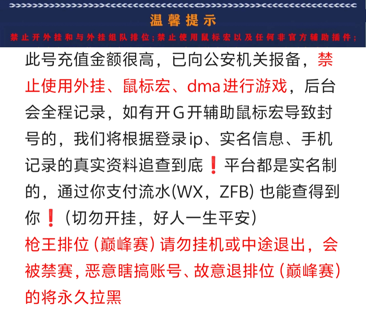 租客必看 此号充值金额很高,已向公安机关报备,禁止使用外挂、鼠标宏、dma进行游戏,后台会全程记录,如有开G开辅助鼠标宏导致封号的,我们将根据登录ip、实名信息、手机记录的真实资料追查到底❗️平台都是实名制的,通过你支付流水(WX,ZFB) 也能查得到你❗️(切勿开挂,好人一生平安) 枪王排位(巅峰赛)请勿挂机或中途退出,会被禁赛,恶意瞎搞账号、故意退排位(巅峰赛)的将永久拉黑 【订单时间快到了请不要再开排位】;USP-雷暴王者,传说星骇,M200-幻神,