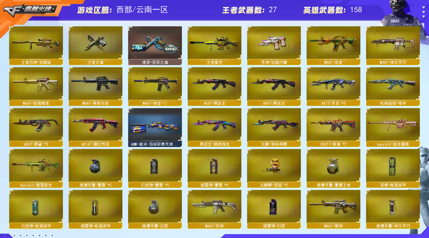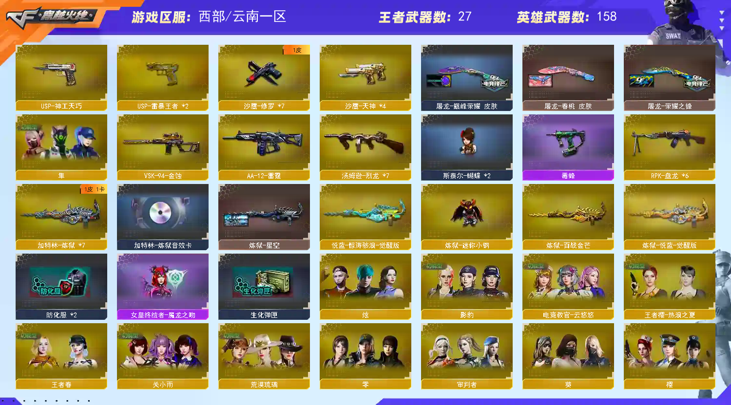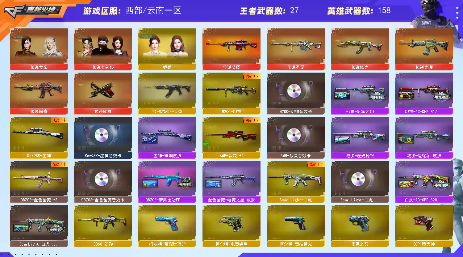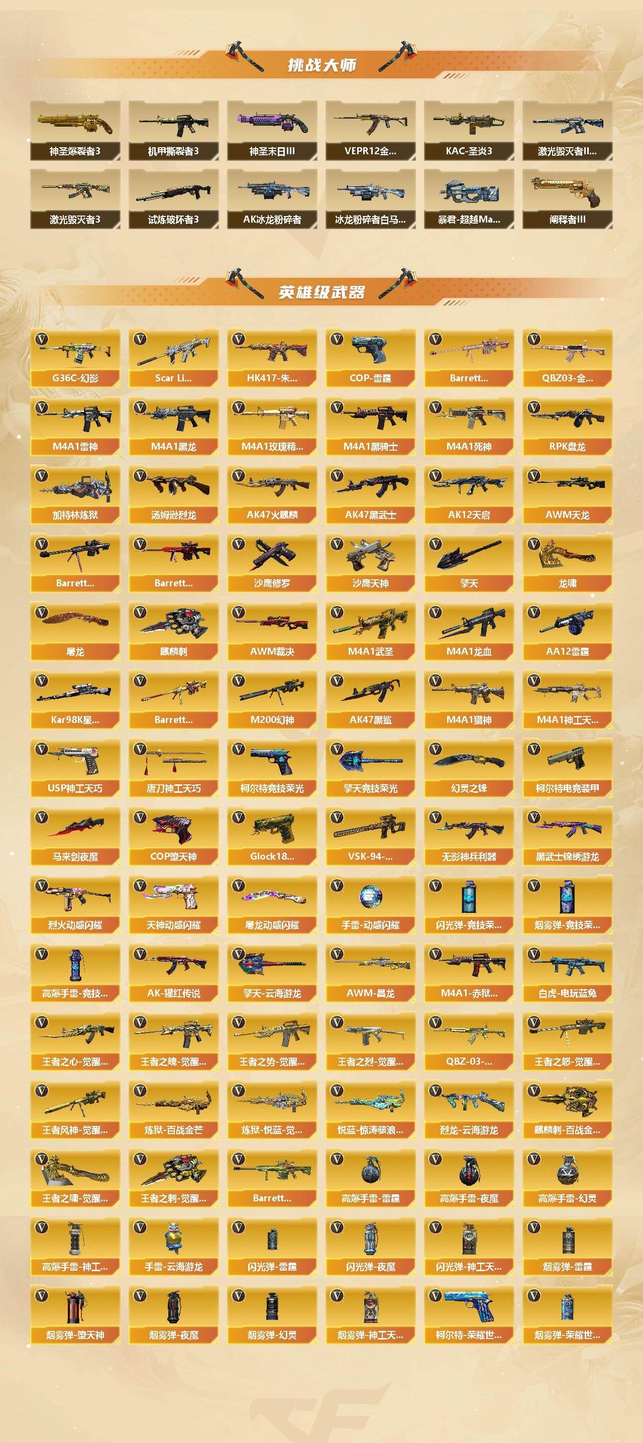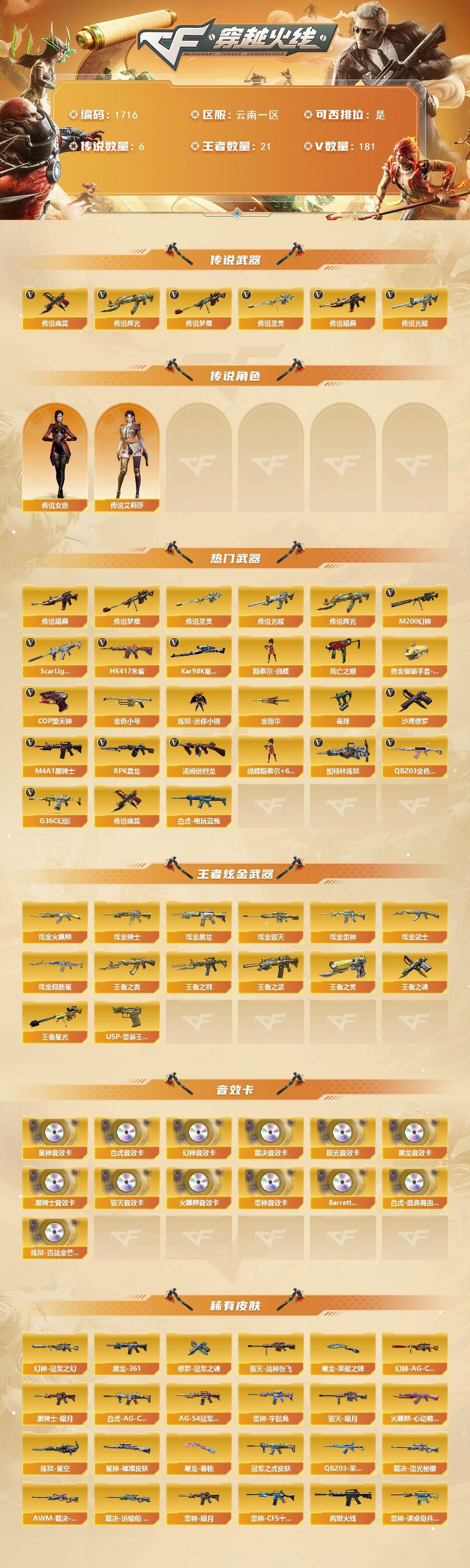 【传说武器】:传说光耀,传说暗裔,传说辉光,传说圣灵,传说梦魇,传说幽冥【传说角色】:传说女帝四防,传说艾莉莎四防【热门武器】:传说光耀,传说暗裔,传说梦魇,传说圣灵,传说辉光,传说幽冥,G36C-幻影,QBZ03-金色蔷薇*2,Scar Light-白虎,HK417-朱雀*2,M200-幻神,死亡之眼*5,白虎-电玩蓝兔*2,Kar98K-星神,金色小号,炼狱-迷你小钢,毒蜂,M4A1-黑骑士*4,汤姆逊-烈龙*7,RPK-盘龙*6,加特林-炼狱*7,斯泰尔-蝴蝶*2,COP-堕天神,沙鹰-修罗*7,黄金猫猫手套-白鲨,金刚伞【王者炫金武器】:王者之戮,王者之翼,王者之武,王者星光,王者之灵,王者之魂,USP-雷暴王者*2,炫金火麒麟,炫金骑士,炫金黑龙,炫金雷神,炫金武士*2,炫金超新星*2,炫金毁灭【音效卡】:M200-幻神音效卡,AK47-火麒麟音效卡,M4A1-雷神音效卡,M4A1-黑龙音效卡,M4A1-黑骑士音效卡,Barrett-毁灭音效卡,Barrett-极光音效卡,AWM-裁决音效卡,Scar Light-白虎音效卡,Kar98K-星神音效卡,Barrett-碧霄极光音效卡,白虎-盛典舞曲音效卡,炼狱-百战金芒-庆典舞曲音效卡【皮肤】:幻神-冠军之幻,幻神-AG-CFPLS17冠军,白虎-AG-CFPLS20冠军,ScarLight-白虎-冠军之虎皮肤,QBZ03-荣耀世冠EP 皮肤,金色蔷薇-电竞之星 皮肤,裁决-流光秘银,AWM-裁决-百城联赛天津皮肤,裁决-运输船 皮肤,裁决-胜者为王 皮肤,星神-璀璨皮肤,雷神-暗月,雷神-宇航兔皮肤,雷神-CFS十周年纪念版 皮肤,M4A1-再燃火线,雷神-课桌奇兵 皮肤,雷神-神秘按键 皮肤,火麒麟-雷神,火麒麟-心动糖果,毁灭-暗月,毁灭-战神张飞,毁灭-魔灵皮肤,毁灭-航天科技皮肤,毁灭-虹光风暴 皮肤,毁灭-英雄计划 皮肤,M4A1-千变-孔明皮肤,黑龙-暗月,M4A1-黑龙-361,黑骑士-暗月,黑骑士-AG-S4冠军典藏,黑骑士-破浪10年皮肤,战神-粉色甜心皮肤,战神-紫绶金章皮肤*2,战神-流金岁月皮肤*2,AK47-B-常胜将军-曹操,AK47-B-常胜将军-刘备,极光-能量核心,炼狱-星空,修罗-冠军之魂,天神-春花弄影 皮肤,屠龙-荣耀之锋,屠龙-春桃 皮肤,屠龙-巅峰荣耀 皮肤,轻型军用手斧-再燃火线,龙啸-青青莓果 皮肤,麒麟刺-甜蜜糖果 皮肤,炽芒蝶刃-巅峰荣耀 皮肤【角色】:零,葵,樱,瞳,炫,影豹,电竞教官-云悠悠,鹰,荒漠琉璃,关小雨,隼四防,机械姬,迅捷虹喵,审判者,妮妮,战地猎狐,王者-瞳-闭月羞花,王者樱-热浪之夏,王者葵-惊若翩鸿四防,王者春四防,王者-魅影四防,乔伊教练,修道士,云海玲珑,炽天使,暗夜-X,初恋灵狐,风暴女,嘉年华灵狐,兰-海滩派对,灵狐者-职业经理四防,龙儿,曼陀罗-X,潘多拉-甜心教官,铁骑-乘风破浪,铁骑荣耀,维纳斯,新娜塔莎,雪莉杨-摸金校尉,夜玫瑰-幻能朋克,幽,职业选手,雅典娜【人偶武器】:白虎-迷你小艾,火麒麟-灵狐*2,M4A1-雷神-精英刀锋,炼狱-迷你小钢,斯泰尔-蝴蝶*2,AWM-灵狐-15周年嘉年华*2,黄金迷你深渊冰龙*3,迷你深渊冰龙,迷你裂空之翼,黄金迷你裂空之翼,迷你波特博士,迷你曼提柯尔,夺魂,迷你牛牛,迷你火种*2,迷你生化手雷*3,深渊终结者手雷,迷你深渊冰龙-王绿豆*2,M200-夜玫瑰,迷你艾比,迷你超能女侍【暴走生化】:毒蜂,死亡之眼*5,超级对讲机【特殊枪械】:蝴蝶斯泰尔+6烈龙,1白虎,4黑骑士,6烈龙,6盘龙,6炼狱,2蝴蝶斯泰尔【挑战大师】:暴君乱世-超越Max,神圣爆裂者III,AK47-冰龙粉碎者,冰龙粉碎者-白马银枪,激光毁灭者III-白马银枪*2,VEPR-12-金魔,激光毁灭者III,机甲撕裂者III,试炼破坏者III,KAC-圣炎切割者III,神圣爆裂者-末日III,阐释者III,防弹头盔*5,防弹衣*4,C4工具钳*3,手雷包*4,;USP-雷暴王者,传说幽冥,传说女帝,隼,电竞教官-云悠悠,传说艾莉莎,妮妮,