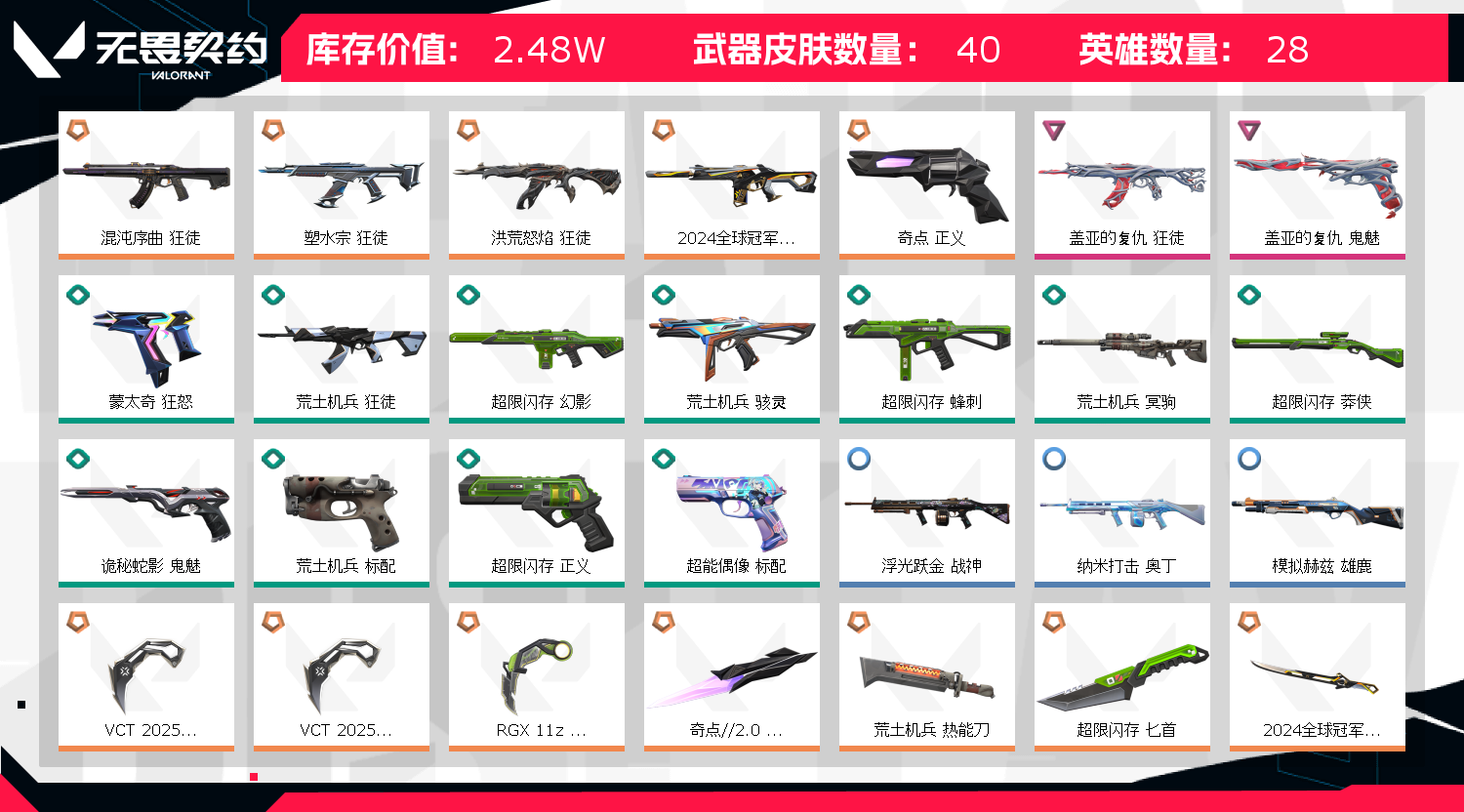 24冠军套 显卡爪 25vct爪 奇点蝴蝶刀 混沌ak 塑水宗ak 脓流ak 盖亚ak;VCT 2025 爪刀,盖亚的复仇 狂徒,洪荒怒焰 狂徒,混沌序曲 狂徒,塑水宗 狂徒,2024全球冠军赛 幻影,奇点 正义,