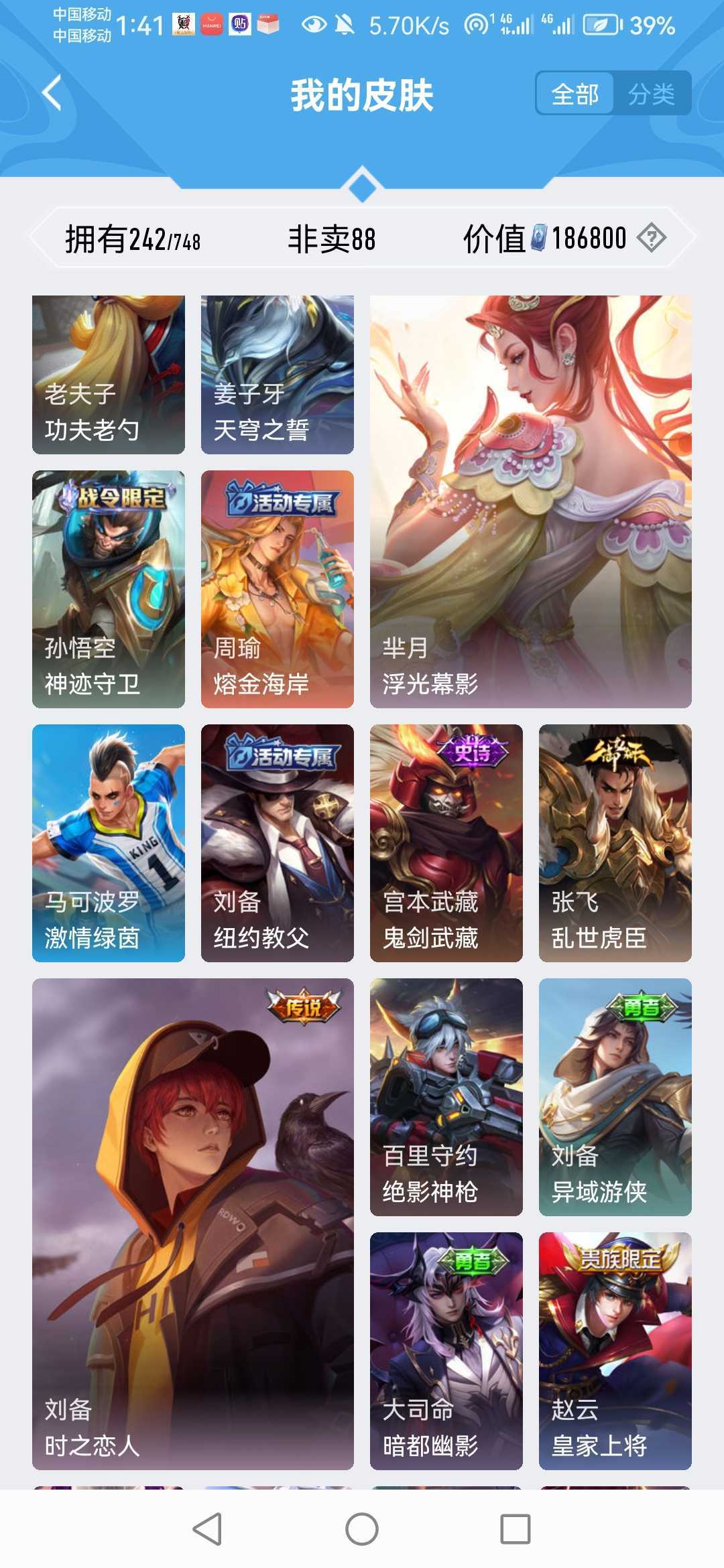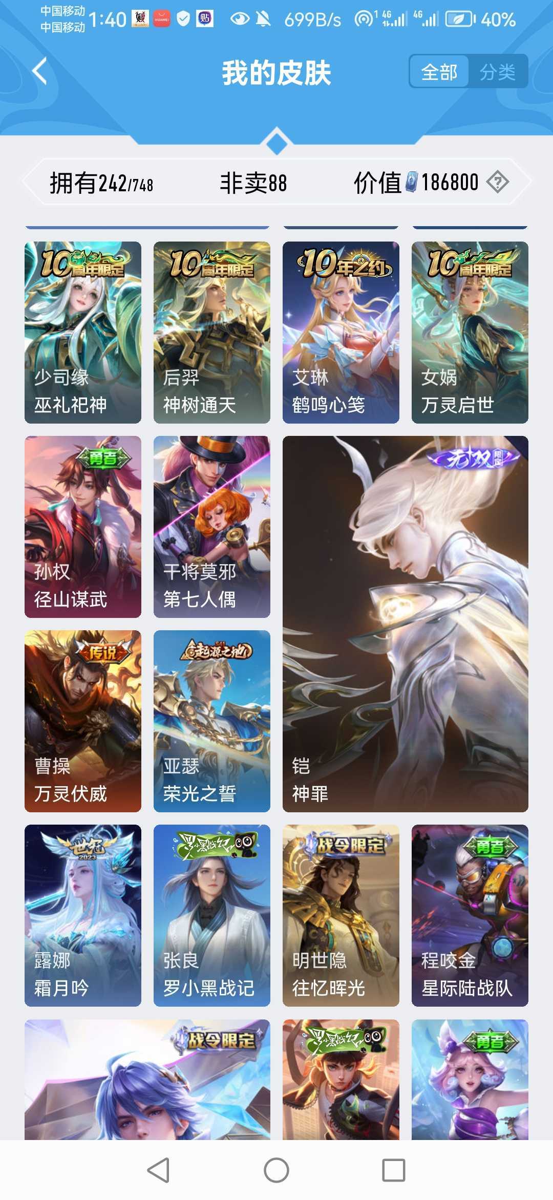 v10、537皮6水4无双、安琪拉-颠倒童话·魔镜、朵莉亚-神骥、遇见神鼓、齐天大圣、白虎志、韩信荣耀典藏、73传说、时之魔女、瑶无双、青丘、九尾、神器明辉仪