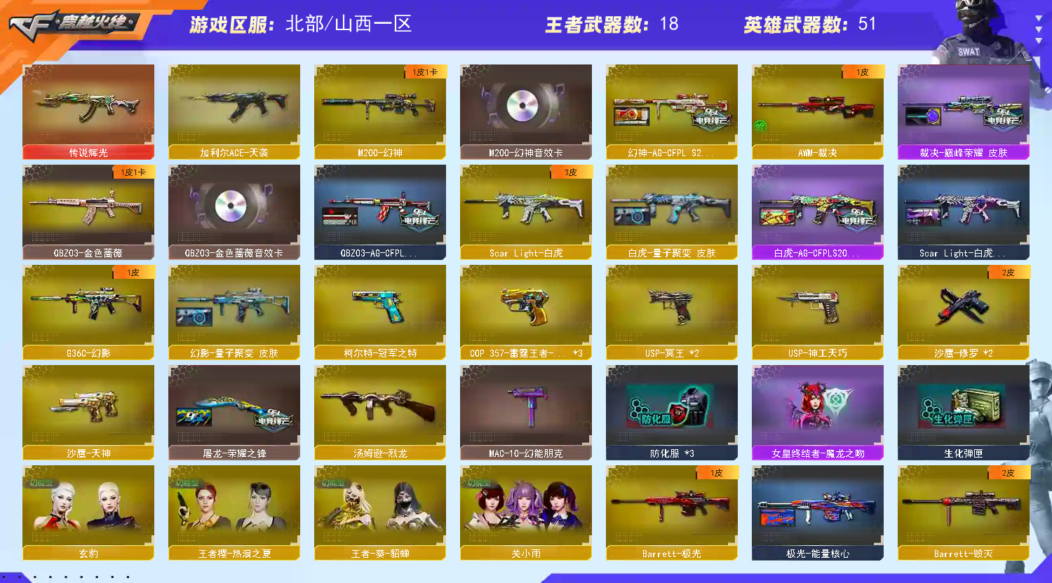 王者武器:烟雾弹-雷暴王者;高爆手雷-雷暴王者;王者凌虎;Barrett-雷霆王者-觉醒版;王者之武-觉醒版;M4A1-雷霆王者-觉醒版;COP 357-雷霆王者-觉醒版;闪光弹-雷霆王者-觉醒版;雷霆王者之锋;高爆手雷-雷霆王者;闪光弹-雷霆王者;烟雾弹-雷霆王者-觉醒版;王者之心-觉醒版 英雄武器:USP-神工天巧;加利尔ACE-天袭;M4A1-猎神;AK47-火麒麟;Barrett-碧霄极光;USP-冥王;9A91-烈火;闪光弹-玄豹;丛林匕首-玄豹;烟雾弹-玄豹;AWM-裁决;机械迷城-穹宇;手雷-热带奇洋;龙啸-热带奇洋;沙鹰-天神;烟雾弹-云龙;沙鹰-修罗;黑武士-锦绣游龙;Barrett-暗月传说;AK-47-猩红传说;AK47-B-战神;白虎-电玩蓝兔;传说辉光;屠龙;烟雾弹-幻灵;QBZ03-金色蔷薇;幻灵之锋;高爆手雷-幻灵;Scar Light-白虎;闪光弹-幻灵;M200-幻神;汤姆逊-烈龙;擎天;Barrett-极光;M4A1-雷神 角色:关小雨;猎狐者;刀锋;幻影;雷霆-β;复仇者;堕天使;活力灵狐;兰;G.E.M.邓紫棋;夜玫瑰;陈龙野-X;灵狐者;烈锋; 请看截图 喜欢请点收藏 方便下次租 可以当成自己号玩【感谢老板租此号】优质账号 如果有个别装备到期 影响不大的情况下请不要维权,如遇到账号密码错误 顶号 冻结 请直接维权即可, 科技大佬麻烦看了请绕道,出zu不易,给你跪下了!;柯尔特-冠军之特,QBZ03-金色蔷薇,G36C-幻影,M200-幻神,Scar Light-白虎,加利尔ACE-天袭,