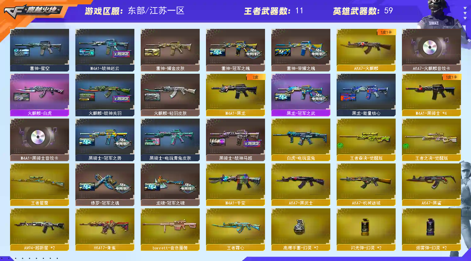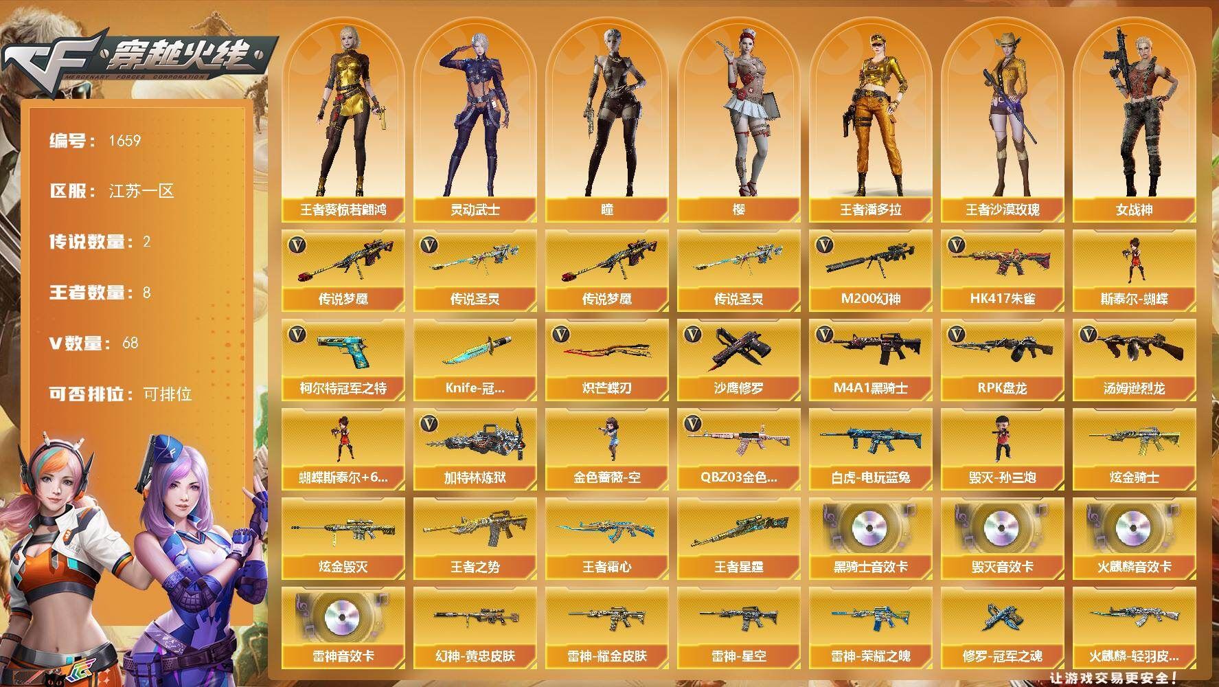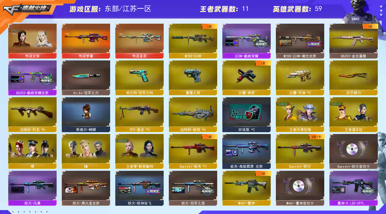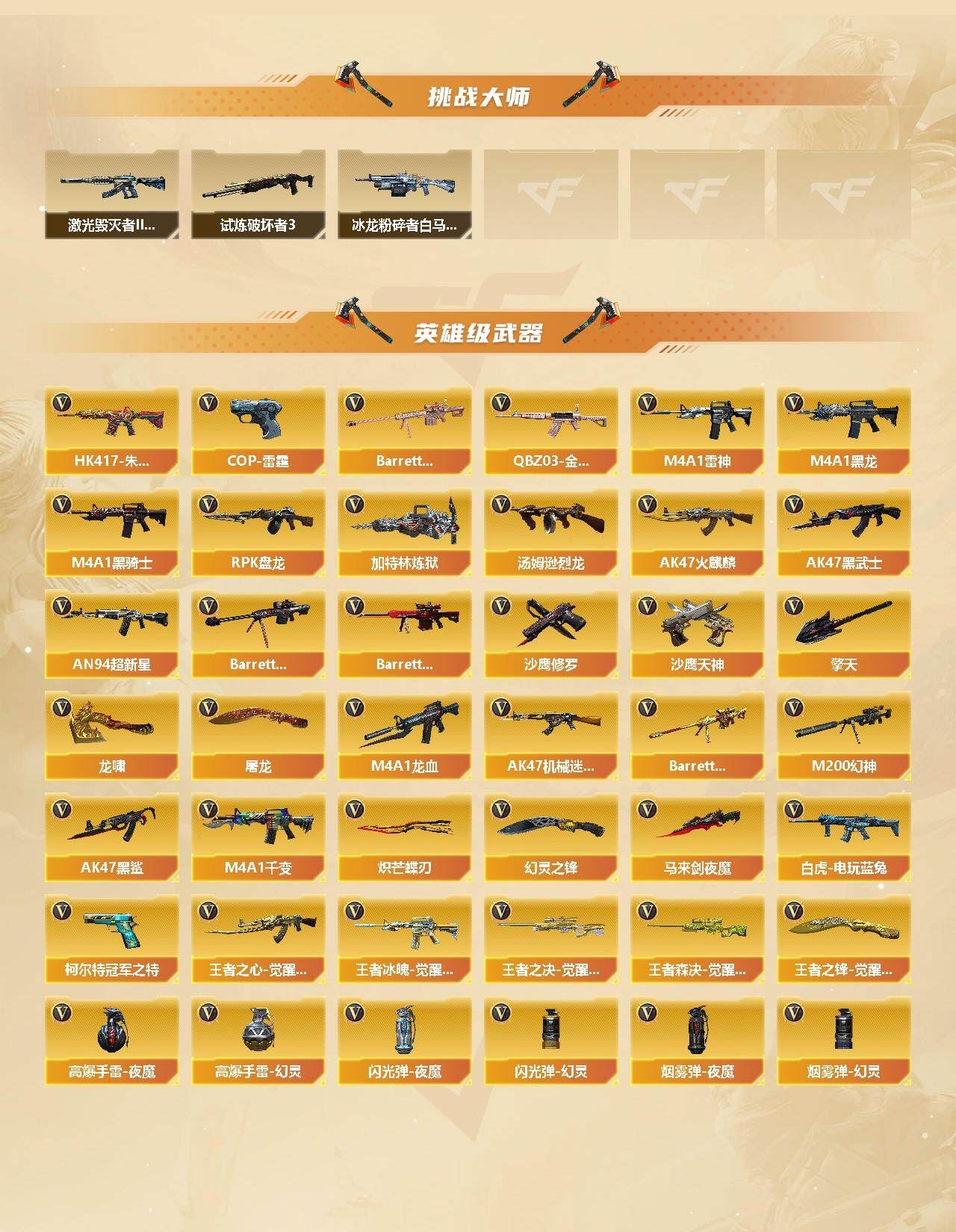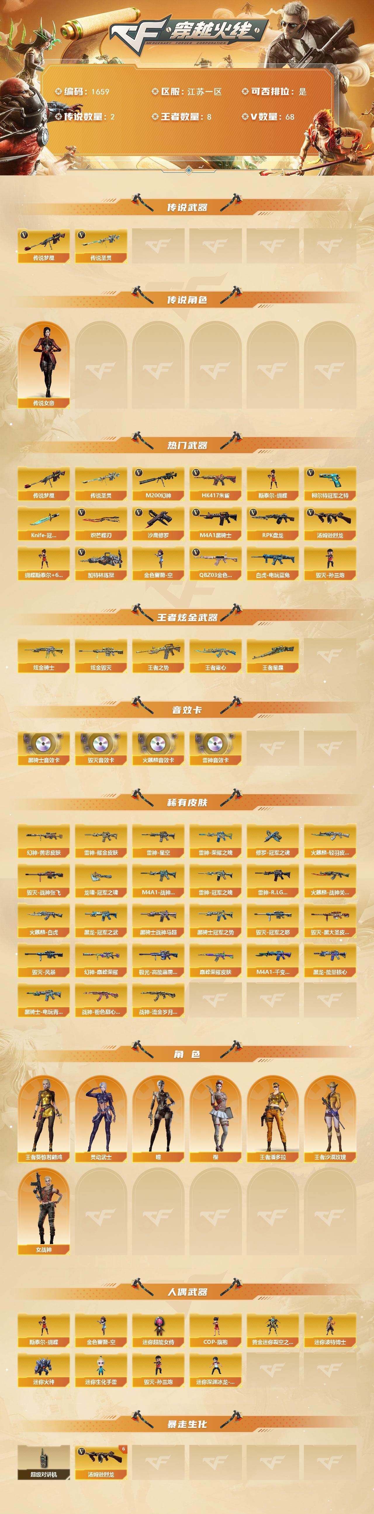 【传说武器】:传说圣灵,传说梦魇【传说角色】:传说女帝【热门武器】:传说梦魇,传说圣灵,QBZ03-金色蔷薇,HK417-朱雀,M200-幻神,白虎-电玩蓝兔,柯尔特-冠军之特,M4A1-黑骑士*4,汤姆逊-烈龙*6,RPK-盘龙*3,加特林-炼狱*4,金色蔷薇-空,斯泰尔-蝴蝶,毁灭-孙三炮,沙鹰-修罗,Knife-冠军之刃,炽芒蝶刃【王者炫金武器】:王者之势,王者霜心,王者星霆,炫金骑士,炫金毁灭【音效卡】:AK47-火麒麟音效卡,M4A1-雷神音效卡,M4A1-黑骑士音效卡,Barrett-毁灭音效卡【皮肤】:M200-幻神-黄忠皮肤,幻神-巅峰荣耀,QBZ03-巅峰荣耀皮肤,雷神-荣耀之魄,雷神-星空,雷神-耀金皮肤,雷神-冠军之魄,M4A1-战神赵云,雷神-R.LGD-CFPLS18冠军,火麒麟-轻羽皮肤,火麒麟-战神关羽,火麒麟-白虎,毁灭-冠军之怒,毁灭-战神张飞,毁灭-黑大圣皮肤,毁灭-风暴,M4A1-千变-孔明皮肤,黑龙-能量核心,黑龙-冠军之武,黑骑士-冠军之势,黑骑士-战神马超,黑骑士-电玩青兔皮肤,战神-粉色甜心皮肤*3,战神-流金岁月皮肤,极光-高能霹雳 皮肤,修罗-冠军之魂,龙啸-冠军之啸【角色】:樱,瞳,王者葵-惊若翩鸿四防,王者潘多拉四防,王者沙漠玫瑰四防,灵动武士,女战神【人偶武器】:毁灭-孙三炮,金色蔷薇-空,斯泰尔-蝴蝶,COP-旗袍,黄金迷你裂空之翼,迷你波特博士*3,迷你火种,迷你生化手雷,迷你深渊冰龙-王绿豆,迷你超能女侍【暴走生化】:超级对讲机【挑战大师】:冰龙粉碎者-白马银枪,激光毁灭者III-白马银枪,试炼破坏者III【英雄级武器】:M4A1-千变,AK47-火麒麟,M4A1-黑龙,M4A1-雷神,M4A1-黑骑士*4,AK47-黑武士,AN94-超新星*2,AK47-机械迷城,AK47-黑鲨,M4A1-龙血,HK417-朱雀,QBZ03-金色蔷薇,王者之心-觉醒版,王者冰魄-觉醒版,白虎-电玩蓝兔,Barrett-毁灭,Barrett-极光*2,M200-幻神,Barrett-朱雀,Barrett-金色蔷薇,王者之决-觉醒版,王者森决-觉醒版,RPK-盘龙*3,加特林-炼狱*4,汤姆逊-烈龙*6,沙鹰-修罗,沙鹰-天神*2,COP-雷霆,柯尔特-冠军之特,屠龙*2,龙啸,马来剑-夜魔,擎天,幻灵之锋,炽芒蝶刃,王者之锋-觉醒版,高爆手雷-夜魔,高爆手雷-幻灵*2,闪光弹-夜魔,闪光弹-幻灵*2,烟雾弹-夜魔,烟雾弹-幻灵*2【道具】:AG战队炫彩背包,次元之矛-黄金背包*2,救世主-黑桃战神,绿色巨人,灵魂忍者,迷雾幽灵,夺命之镰,防化服*2,金色流光-枪王排位,星辰流光-枪王排位,枪王排位28赛季金色流光,电玩兔兔表情,C4-红龙,防弹头盔*4,防弹衣*4,C4工具钳*4,手雷包*4【特殊枪械】:蝴蝶斯泰尔+6烈龙,4黑骑士,6烈龙,3盘龙,4炼狱,1蝴蝶斯泰尔;柯尔特-冠军之特,炽芒蝶刃,Knife-冠军之刃,传说女帝,王者沙漠玫瑰,RPK-盘龙,QBZ03-金色蔷薇,