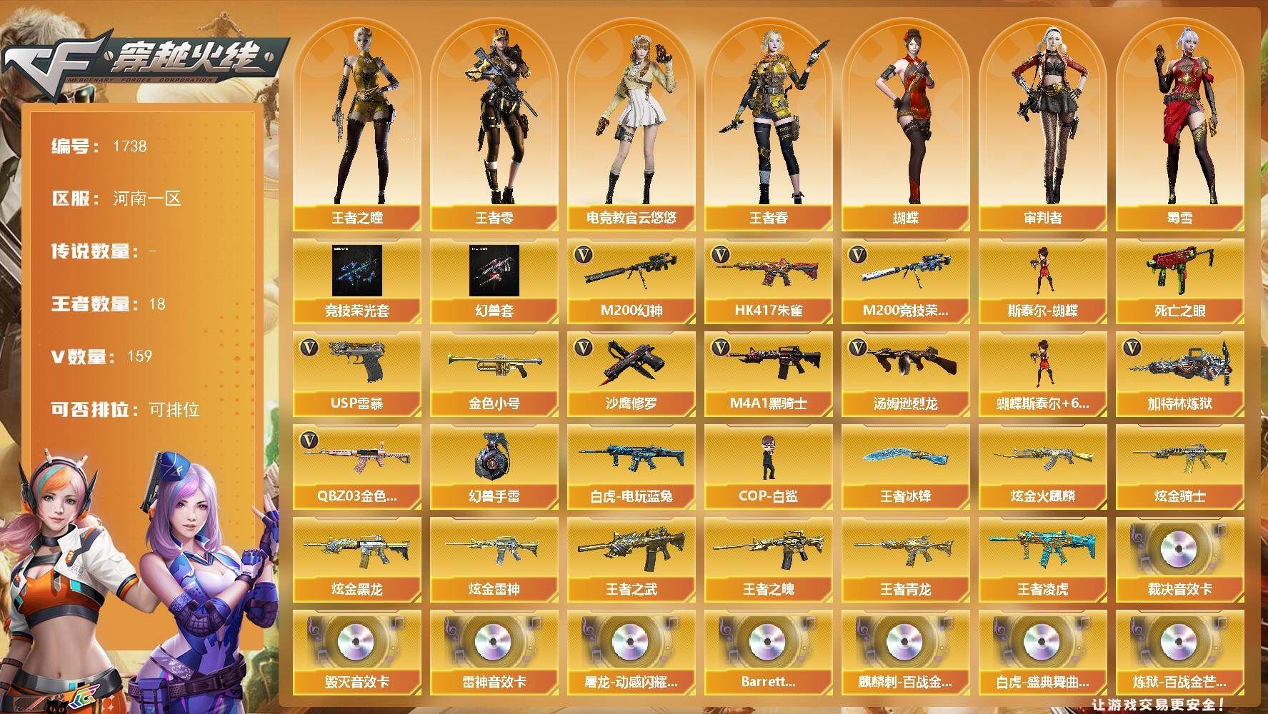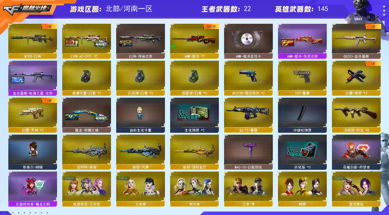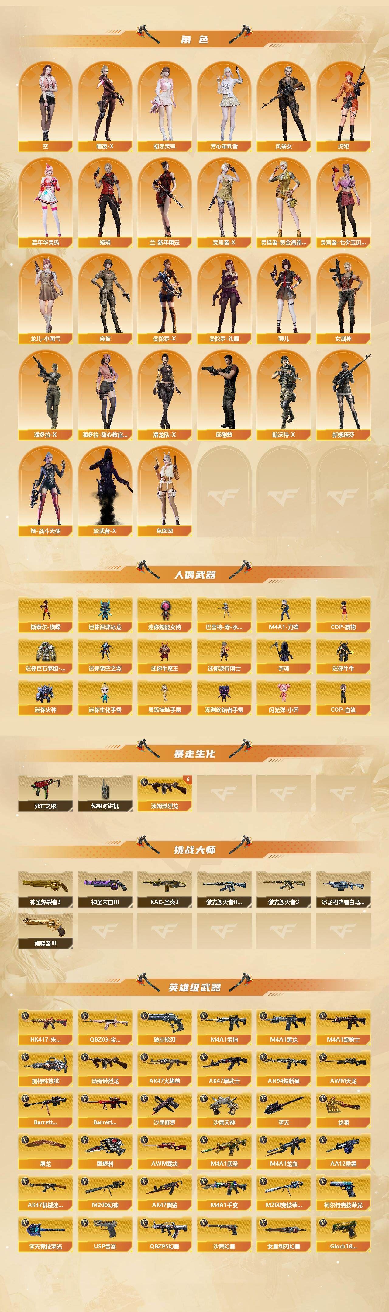 热门武器】:QBZ03-金色蔷薇,HK417-朱雀,M200-幻神,M200-竞技荣光,死亡之眼,白虎-电玩蓝兔,金色小号,M4A1-黑骑士*2,汤姆逊-烈龙*8,加特林-炼狱,斯泰尔-蝴蝶,COP-白鲨*2,USP-雷暴,沙鹰-修罗*3,高爆手雷-幻兽*5【稀有套装】:竞技荣光套,幻兽套【王者炫金武器】:王者之武,王者之魄,王者青龙,王者凌虎,王者冰锋,炫金火麒麟,炫金骑士,炫金黑龙,炫金雷神【音效卡】:屠龙-动感闪耀 音效卡,M4A1-雷神音效卡,Barrett-毁灭音效卡*3,AWM-裁决音效卡,Barrett-碧霄极光音效卡,麒麟刺-百战金芒-盛典舞曲音效卡,白虎-盛典舞曲音效卡,炼狱-百战金芒-庆典舞曲音效卡,死神-雪域霜狐-怀旧音效卡,AWM-昌龙-怀旧音效卡【皮肤】:幻神-周瑜皮肤,幻神-AG-CFPL S24冠军 皮肤,金色蔷薇-电竞之星 皮肤,AWM-裁决-凤灵皮肤,雷神-荣耀之魄,雷神-虎将,雷神-传奇N9,雷神-宠儿-2019MVP,雷神-R.LGD-CFPLS18冠军,雷神-源计划2.0专属 皮肤,M4A1-再燃火线,火麒麟-雷神,毁灭-冠军之怒,毁灭-黑大圣皮肤*2,毁灭-风暴,毁灭-魔灵皮肤,黑龙-冠军之武,屠龙-荣耀之锋,轻型军用手斧-再燃火线,麒麟刺-萌杀皮肤【角色】:蝴蝶,四防电竞教官-云悠悠,审判者,战地猎狐,王者-零,王者之瞳,四防王者春,雪域霜狐,乔伊教练,修道士,空,暗夜-X,初恋灵狐,芳心审判者,风暴女,虎妞,嘉年华灵狐,娟娟,【人偶武器】:COP-白鲨*2,斯泰尔-蝴蝶,巴雷特-零-水下丽影,COP-旗袍,M4A1-刀锋,迷你深渊冰龙,迷你裂空之翼,迷你牛魔王,迷你波特博士*2,夺魂,迷你牛牛,迷你火种,迷你生化手雷,深渊终结者手雷*4,闪光弹-小乔,迷你超能女侍,迷你巨石泰坦-魔花研究所,灵狐娃娃手雷【暴走生化】:死亡之眼,超级对讲机【挑战大师】:神圣爆裂者III,冰龙粉碎者-白马银枪*2,激光毁灭者III-白马银枪*2,激光毁灭者III,KAC-圣炎切割者III,神圣爆裂者-末日III*2,阐释者III【英雄级武器】:HK417-朱雀,无影-神兵利器,QBZ95-幻兽,QBZ03-金色蔷薇,烈火-动感闪耀,白虎-电玩蓝兔,AWM-裁决*2,M200-幻神,M200-竞技荣光,王者之怒-觉醒版,王者之光-觉醒版,加特林-炼狱,炼狱-百战金芒,炼狱-风暴,汤姆逊-烈龙*8,【道具】:BS战队炫彩背包,EP战队炫彩背包,EDG炫彩背包,亚洲杯纪念炫彩背包,全能枪王背包,炫彩背包,百战金芒炫彩背包,老虎背包*2,背包-洛丽塔,虎牙炫彩背包,超级背包*2,雪域霜狐炫彩背包,黑桃战神背包,女皇终结者-魔龙之吻,救世主-黑桃战神,妩媚妖姬,绿色巨人,灵魂忍者*4,变异宝贝,妖姬*2,迷雾幽灵*2,生化弹匣,夺命之镰,防化服*3,金色流光-枪王排位,流光-鎏金之域,枪王排位29赛季金色流光,语音特效-盛典烟火,雪域霜狐表情,萌萌小葵表情,电玩兔兔表情,动感闪耀表情,EP战队名片,EP战队击杀图标,C4-再燃火线,防弹头盔*11,防弹衣*11,C4工具钳*9,手雷包*7【特殊枪械】:蝴蝶斯泰尔+6烈龙,2黑骑士,6烈龙,1炼狱,1蝴蝶斯泰尔;USP-雷暴,电竞教官-云悠悠,QBZ03-金色蔷薇,M200-幻神,