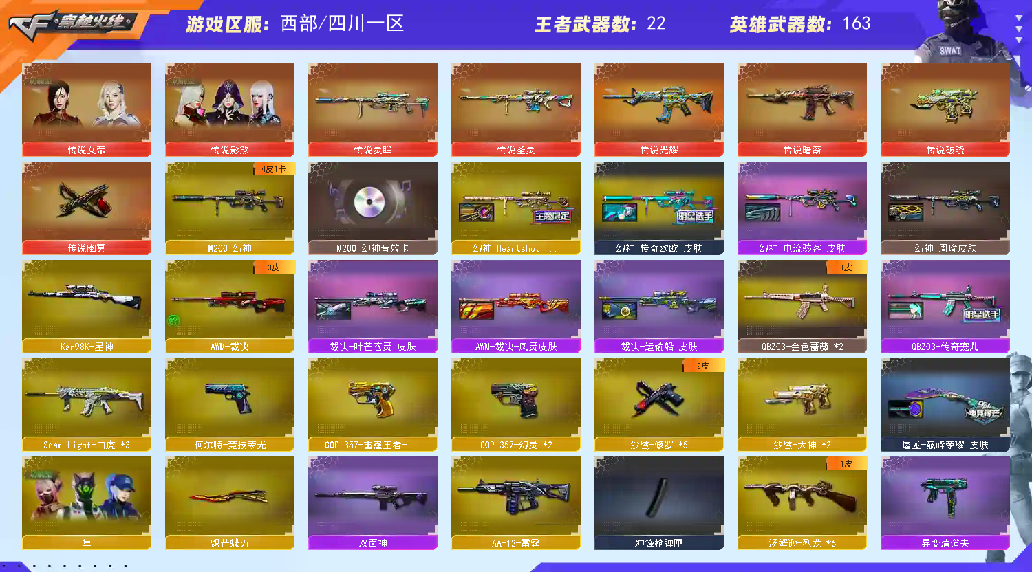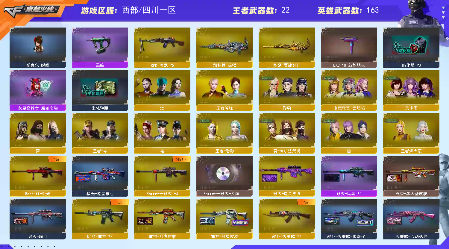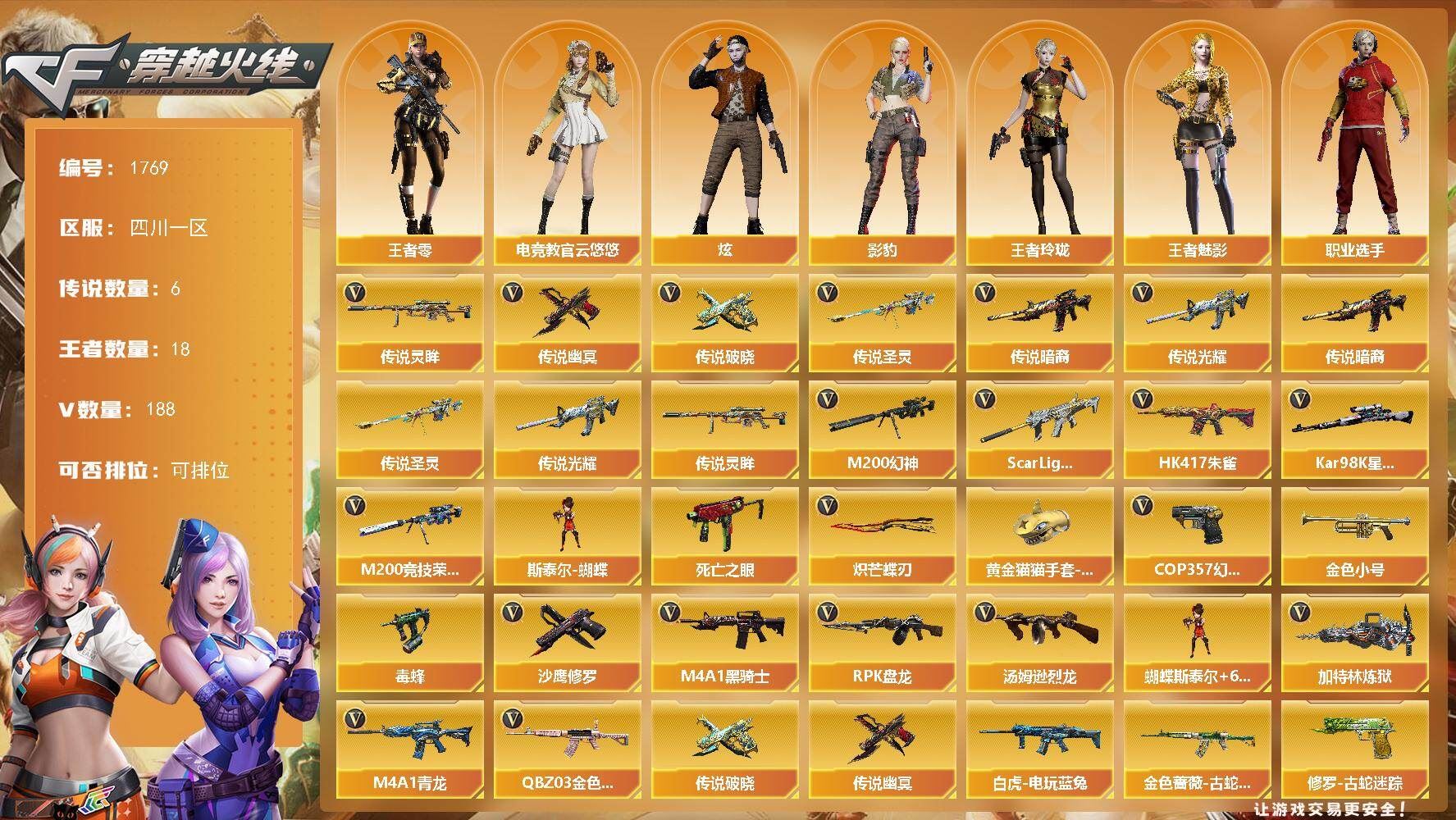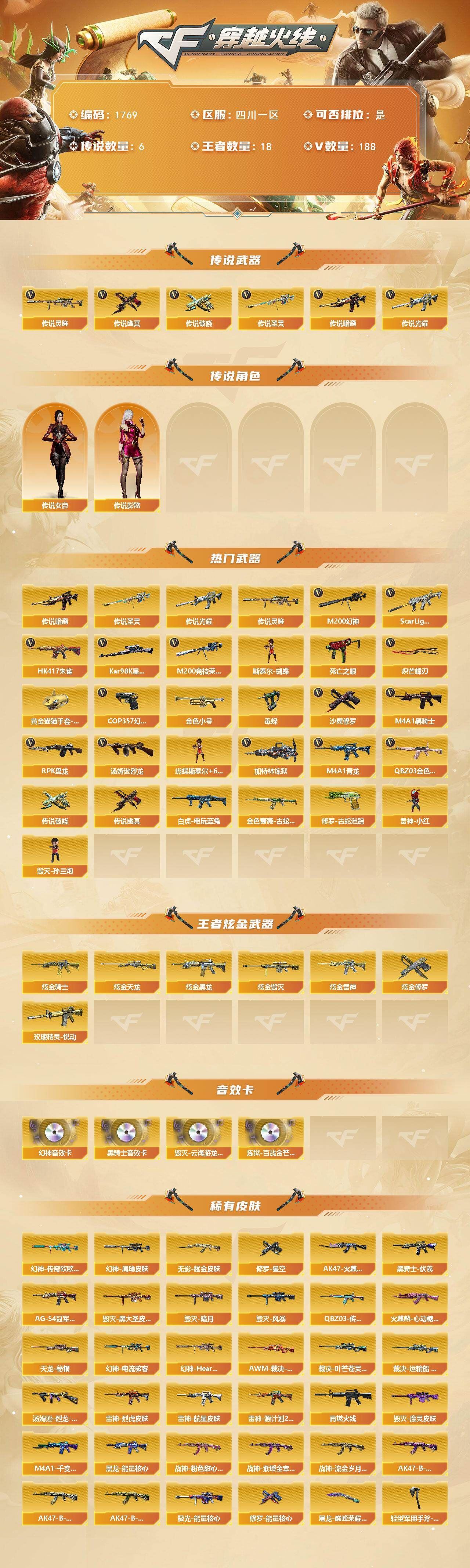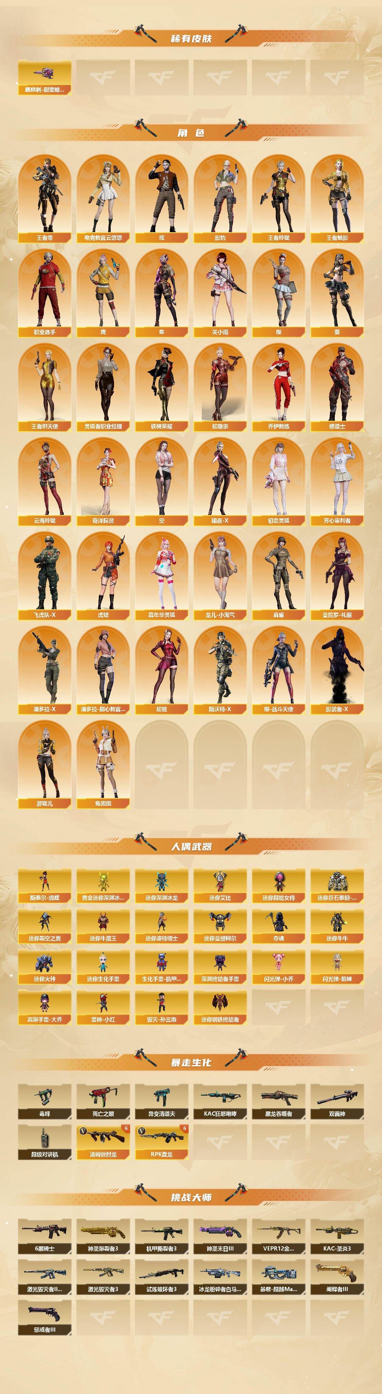 【传说武器】:传说光耀,传说暗裔,传说圣灵,传说灵眸,传说破晓,传说幽冥【传说角色】:传说女帝四防,传说影煞四防【热门武器】:传说光耀,传说暗裔,传说圣灵,传说灵眸,传说破晓,传说幽冥,QBZ03-金色蔷薇*2,Scar Light-白虎*3,HK417-朱雀,M4A1-青龙,M200-幻神,金色蔷薇-古蛇迷踪,修罗-古蛇迷踪,M200-竞技荣光,死亡之眼*2,白虎-电玩蓝兔,Kar98K-星神,金色小号,毒蜂,M4A1-黑骑士*6,汤姆逊-烈龙*6,RPK-盘龙*6,加特林-炼狱,斯泰尔-蝴蝶,雷神-小红,毁灭-孙三炮,COP 357-幻灵*2,沙鹰-修罗*5,炽芒蝶刃,黄金猫猫手套-白鲨【王者炫金武器】:玫瑰精灵-悦动,炫金骑士,炫金黑龙,炫金雷神,炫金毁灭,炫金天龙,炫金修罗【音效卡】:M200-幻神音效卡,M4A1-黑骑士音效卡,Barrett-毁灭-云海游龙音效卡,炼狱-百战金芒-庆典舞曲音效卡【皮肤】:幻神-周瑜皮肤,幻神-电流骇客 皮肤,幻神-Heartshot 皮肤,幻神-传奇欧欧 皮肤,QBZ03-传奇宠儿,AWM-裁决-凤灵皮肤,裁决-叶芒苍灵 皮肤,裁决-运输船 皮肤,汤姆逊-烈龙-末日皮肤,雷神-烈虎皮肤,雷神-航星皮肤,雷神-源计划2.0专属 皮肤,M4A1-再燃火线,AK47-火麒麟-传奇EVEN,火麒麟-心动糖果,毁灭-暗月,毁灭-黑大圣皮肤,毁灭-风暴*2,毁灭-魔灵皮肤,M4A1-千变-孔明皮肤,黑龙-能量核心,黑骑士-伏羲,黑骑士-AG-S4冠军典藏,无影耀金皮肤,战神-粉色甜心皮肤,战神-紫绶金章皮肤*4,战神-流金岁月皮肤*2,AK47-B-常胜将军-曹操*2,AK47-B-常胜将军-刘备*2,AK47-B-常胜将军-孙权,天龙-秘银,极光-能量核心,修罗-能量核心,修罗-星空,屠龙-巅峰荣耀 皮肤,轻型军用手斧-再燃火线,麒麟刺-甜蜜糖果 皮肤【角色】:葵,樱,炫,影豹四防,电竞教官-云悠悠,鹰四防,关小雨,隼四防,王者-零,王者玲珑,王者-魅影四防,王者炽天使四防,蛇隐宗,奇洋探员,乔伊教练,修道士,云海玲珑,空,暗夜-X,初恋灵狐,芳心审判者,飞虎队-X,虎妞,嘉年华灵狐,灵狐者-职业经理四防,龙儿-小淘气,麻雀,曼陀罗-礼服,潘多拉-X,潘多拉-甜心教官,蛇姬,斯沃特-X,铁骑荣耀,兔囡囡,樱-战斗天使,影武者-X,游珑儿,职业选手【人偶武器】:雷神-小红,毁灭-孙三炮,迷你钢铁终结者,斯泰尔-蝴蝶,黄金迷你深渊冰龙,迷你深渊冰龙,迷你裂空之翼*2,迷你牛魔王,迷你波特博士,迷你曼提柯尔,夺魂,迷你牛牛,迷你火种,迷你生化手雷*3,生化手雷-机甲核心,深渊终结者手雷*3,闪光弹-小乔,闪光弹-貂蝉,高爆手雷-大乔,迷你艾比,迷你超能女侍,迷你巨石泰坦-魔花研究所【暴走生化】:毒蜂,异变清道夫,KAC-狂怒咆哮,黑龙吞噬者,双面神,死亡之眼*2,超级对讲机【挑战大师】:暴君乱世-超越Max,【英雄级武器】:M4A1-千变,AK47-火麒麟*6,AK47-麒麟,M4A1-黑龙*3,M4A1-雷神*7,M4A1-黑骑士*6,AK47-无影,M4A1-死神,AK47-黑武士*2,AK12-天启,AN94-超新星,M4A1-武圣,AK47-机械迷城,AK47-黑鲨,M4A1-龙血,M4A1-青龙,HK417-朱雀,Scar Light-白虎*3,M4A1-幻灵,QBZ03-天罚,M4A1-神工天巧,无影-神兵利器,黑武士-锦绣游龙,超新星-热带奇洋,金色蔷薇-古蛇迷踪,M4A1-玫瑰精灵*2,QBZ03-金色蔷薇*2,M4A1-猎神,烈火-动感闪耀,王者之心-觉醒版*2,王者之影-觉醒版,王者之势-觉醒版,超新星-悦享-觉醒版,王者炎心-觉醒版,王者火魄-觉醒版,黑骑士-海王,M4A1-雷霆王者-觉醒版,白虎-电玩蓝兔,黑武士-CF网剧冠军,AWM-天龙,Barrett-毁灭*4,Barrett-极光,AWM-裁决,M200-幻神,Barrett-朱雀,Kar98K-星神,M200-竞技荣光,Barrett-金色蔷薇*3,王者幻神-觉醒版,王者风神-觉醒版,C4工具钳*6,手雷包*5【特殊枪械】:蝴蝶斯泰尔+6烈龙,3白虎,6黑骑士,6烈龙,6盘龙,1炼狱,1蝴蝶斯泰尔;传说幽冥,炽芒蝶刃,传说影煞,传说女帝,隼,电竞教官-云悠悠,RPK-盘龙,