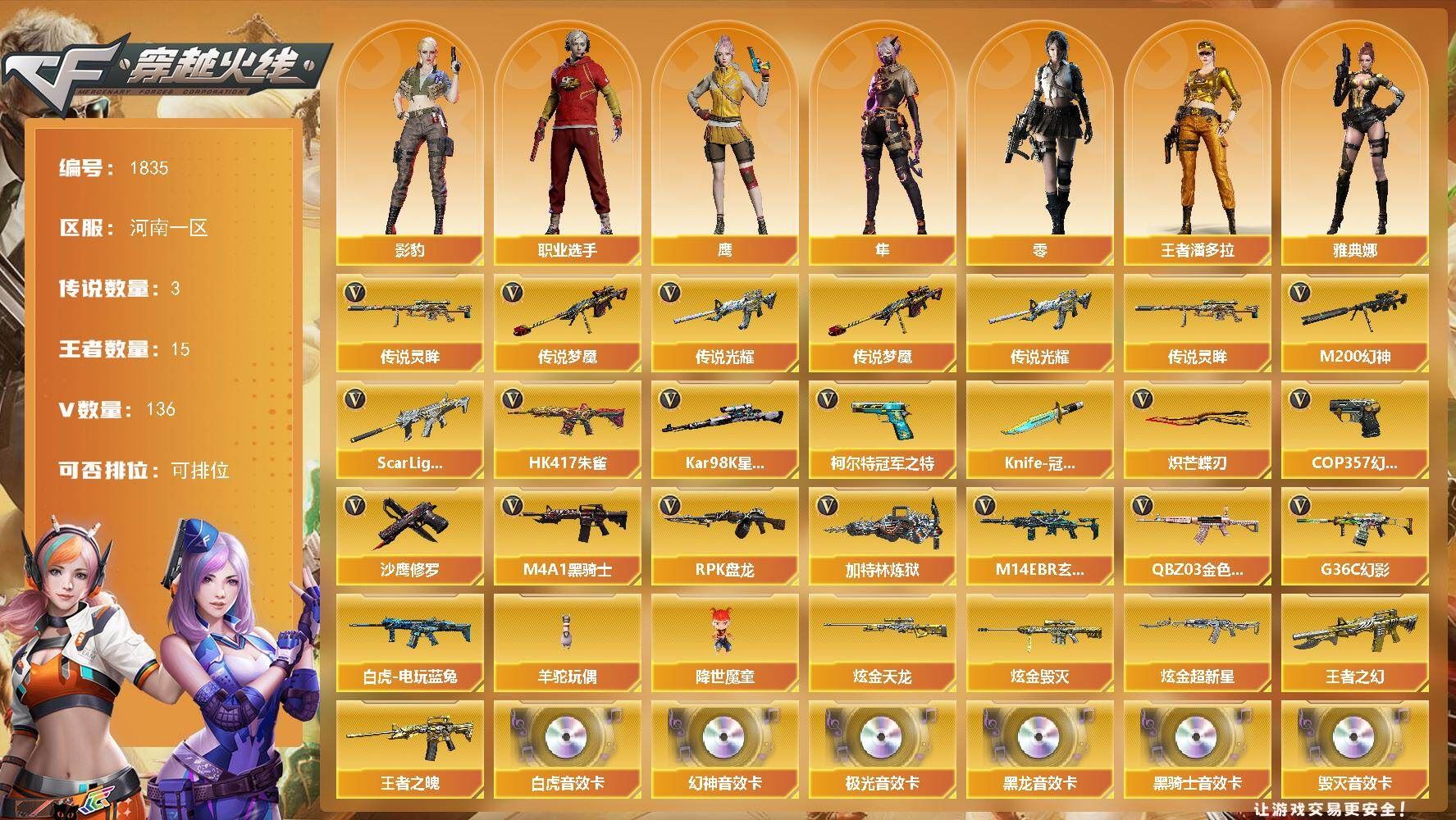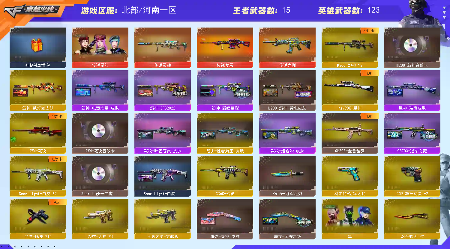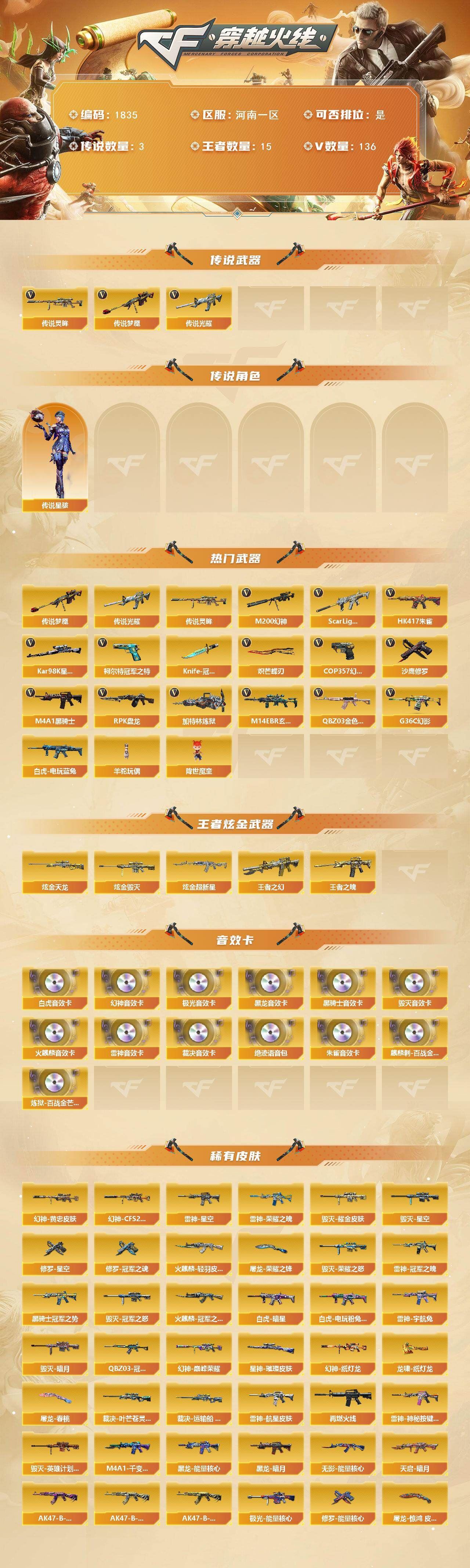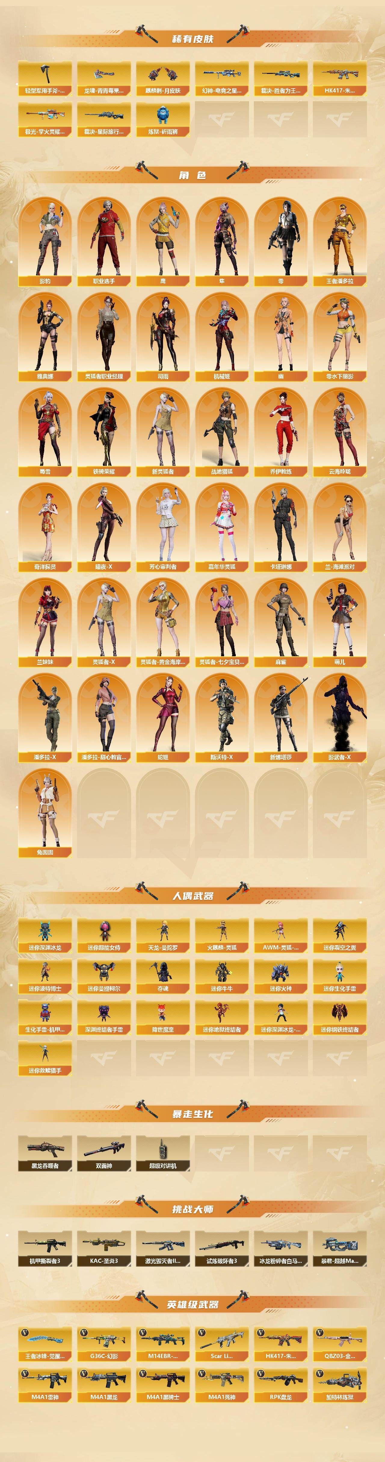 【传说武器】:传说光耀,传说梦魇,传说灵眸【传说角色】:传说星骇【热门武器】:传说光耀,传说梦魇,传说灵眸,G36C-幻影,QBZ03-金色蔷薇,M14EBR-玄武,Scar Light-白虎*2,HK417-朱雀,M200-幻神*2,白虎-电玩蓝兔,柯尔特-冠军之特,Kar98K-星神,M4A1-黑骑士*4,RPK-盘龙*4,加特林-炼狱,羊驼玩偶,降世魔童,COP 357-幻灵*2,沙鹰-修罗*13,Knife-冠军之刃,炽芒蝶刃*2【王者炫金武器】:王者之幻*2,王者之魄,炫金超新星,炫金毁灭,炫金天龙*2【音效卡】:M200-幻神音效卡,AK47-火麒麟音效卡,M4A1-雷神音效卡,M4A1-黑龙音效卡,M4A1-黑骑士音效卡,Barrett-毁灭音效卡,Barrett-极光音效卡,AWM-裁决音效卡,Scar Light-白虎音效卡,绝迹语音包,HK417-朱雀音效卡,麒麟刺-百战金芒-盛典舞曲音效卡,炼狱-百战金芒-庆典舞曲音效卡【皮肤】:M200-幻神-黄忠皮肤,幻神-巅峰荣耀,幻神-CFS2022,幻神-纸灯龙皮肤,幻神-电竞之星 皮肤,Scar Light-白虎-暗星,白虎-电玩粉兔皮肤,QBZ03-冠军之薇,裁决-叶芒苍灵 皮肤,裁决-运输船 皮肤,裁决-胜者为王 皮肤,裁决-星际旅行 皮肤,星神-璀璨皮肤,雷神-荣耀之魄,雷神-星空,雷神-冠军之魄,雷神-宇航兔皮肤,雷神-航星皮肤,M4A1-再燃火线,雷神-神秘按键 皮肤,火麒麟-冠军之心,火麒麟-轻羽皮肤,毁灭-暗月,毁灭-荣耀之怒,毁灭-冠军之怒【角色】:零,影豹,鹰,隼,机械姬,司雨,战地猎狐,王者潘多拉,奇洋探员,乔伊教练,云海玲珑,卡塔琳娜,兰-海滩派对,灵狐者-职业经理,麻雀,萌儿,潘多拉-X,潘多拉-甜心教官,职业选手,雅典娜【人偶武器】:天龙-曼陀罗,火麒麟-灵狐,迷你钢铁终结者,迷你救赎猎手,迷你地狱终结者,AWM-灵狐-15周年嘉年华*2,迷你深渊冰龙*3,迷你裂空之翼*2,迷你波特博士*4,迷你曼提柯尔,夺魂*5,迷你牛牛,迷你火种*4,迷你生化手雷*5,生化手雷-机甲核心,深渊终结者手雷*2,迷你深渊冰龙-王绿豆,迷你超能女侍,降世魔童【暴走生化】:黑龙吞噬者,双面神,超级对讲机【挑战大师】:暴君乱世-超越Max,冰龙粉碎者-白马银枪*2,激光毁灭者III-白马银枪,机甲撕裂者III,试炼破坏者III,KAC-圣炎切割者III【英雄级武器】:AK47-火麒麟,M4A1-黑龙*2,M4A1-雷神*6,M4A1-黑骑士*4,AK47-无影,M4A1-死神,AK12-天启,AN94-超新星,AK47-黑鲨,M4A1-龙血*2,HK417-朱雀,Scar Light-白虎*2,M14EBR-玄武,G36C-幻影,QBZ03-金色蔷薇,M4A1-猎神,王者之翼-觉醒版,王者之武-觉醒版,王者之魄-觉醒版,AK-47-猩红传说,AK47-B-战神,王者炎心-觉醒版,白虎-电玩蓝兔,王者芳薇-觉醒版,AWM-天龙,Barrett-毁灭*3,Barrett-极光*2,AWM-裁决,M200-幻神*2,Kar98K-星神,王者之光-觉醒版,王者星神-觉醒版,王者风神-觉醒版,RPK-盘龙*4,加特林-炼狱,炼狱-百战金芒,炼狱-悦蓝-觉醒版,【道具】:圣拳猎手-炽雪,终极猎手-荒漠刀客,女皇终结者-魔龙之吻,救世主-黑桃战神,黄金生化钩,绿色巨人,灵魂忍者,变异宝贝,迷雾幽灵,夺命之镰*2,防化服*3,C4-红龙,C4-再燃火线,防弹头盔*4,防弹衣*4,C4工具钳*4,手雷包*3【特殊枪械】:2白虎,4黑骑士,4盘龙,1炼狱;柯尔特-冠军之特,炽芒蝶刃,Knife-冠军之刃,传说星骇,隼,RPK-盘龙,QBZ03-金色蔷薇,