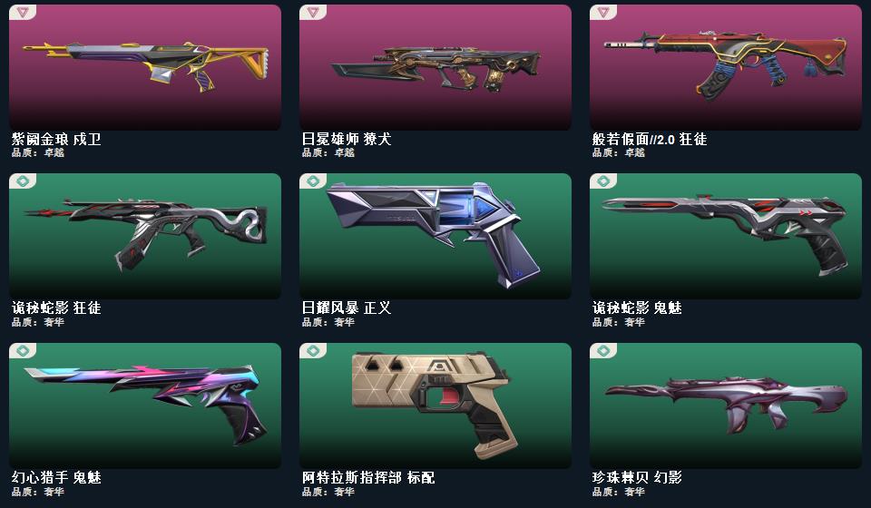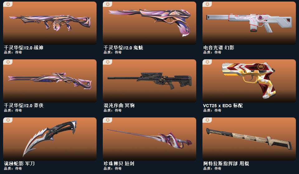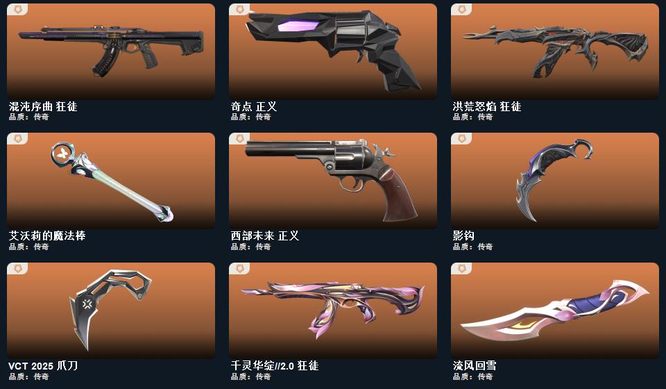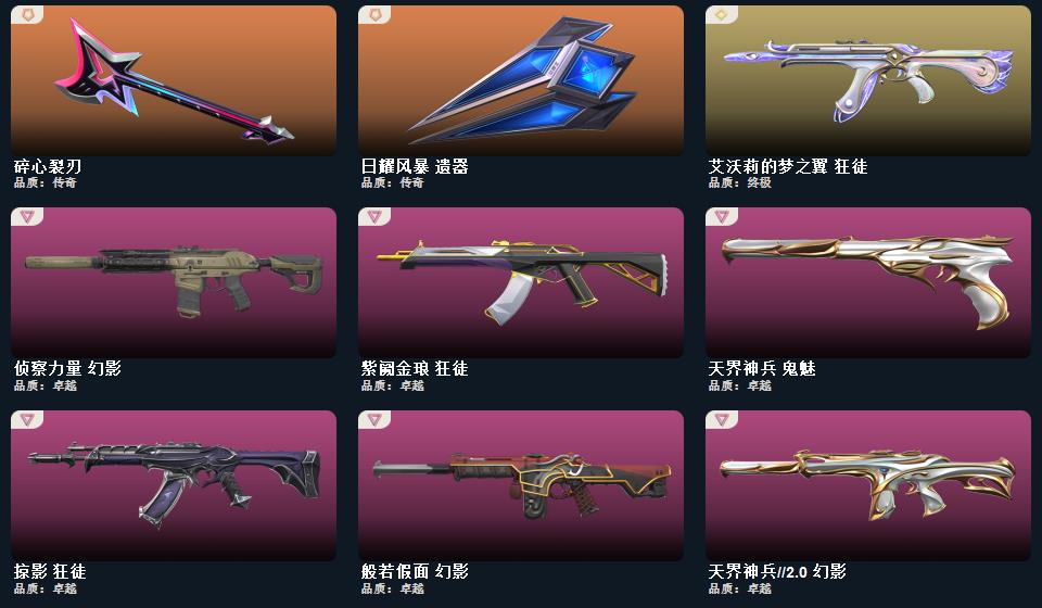 wegame无畏契约★武器皮肤数量:88,碎心裂刃,流风回雪,阿特拉斯指挥部 甩棍,影钩,艾沃莉的魔法棒,日耀风暴 遗器,诡秘蛇影 军刀,VCT 2025 爪刀,珍珠棘贝 短剑,甜心猎手 短炮,甜心猎手 幻影,诛心猎手 冥驹,诛心猎手 奥丁