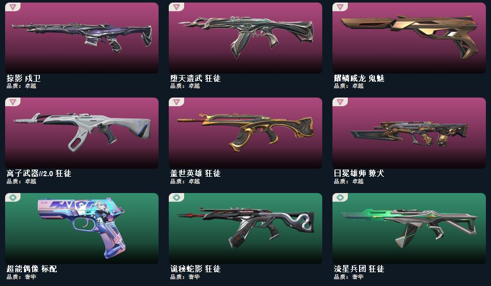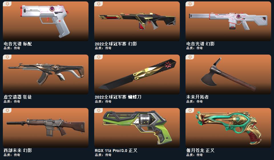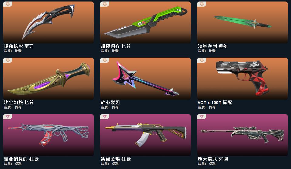 wegame无畏契约★镭切,星际猎兵 短剑,2025全球冠军赛 蝴蝶刀,阿特拉斯指挥部 甩棍,日耀风暴 遗器,2022全球冠军赛 蝴蝶刀,星际猎兵 标配,黯夜怪谈 幻影,光环序列 冥驹,星际猎兵 判官