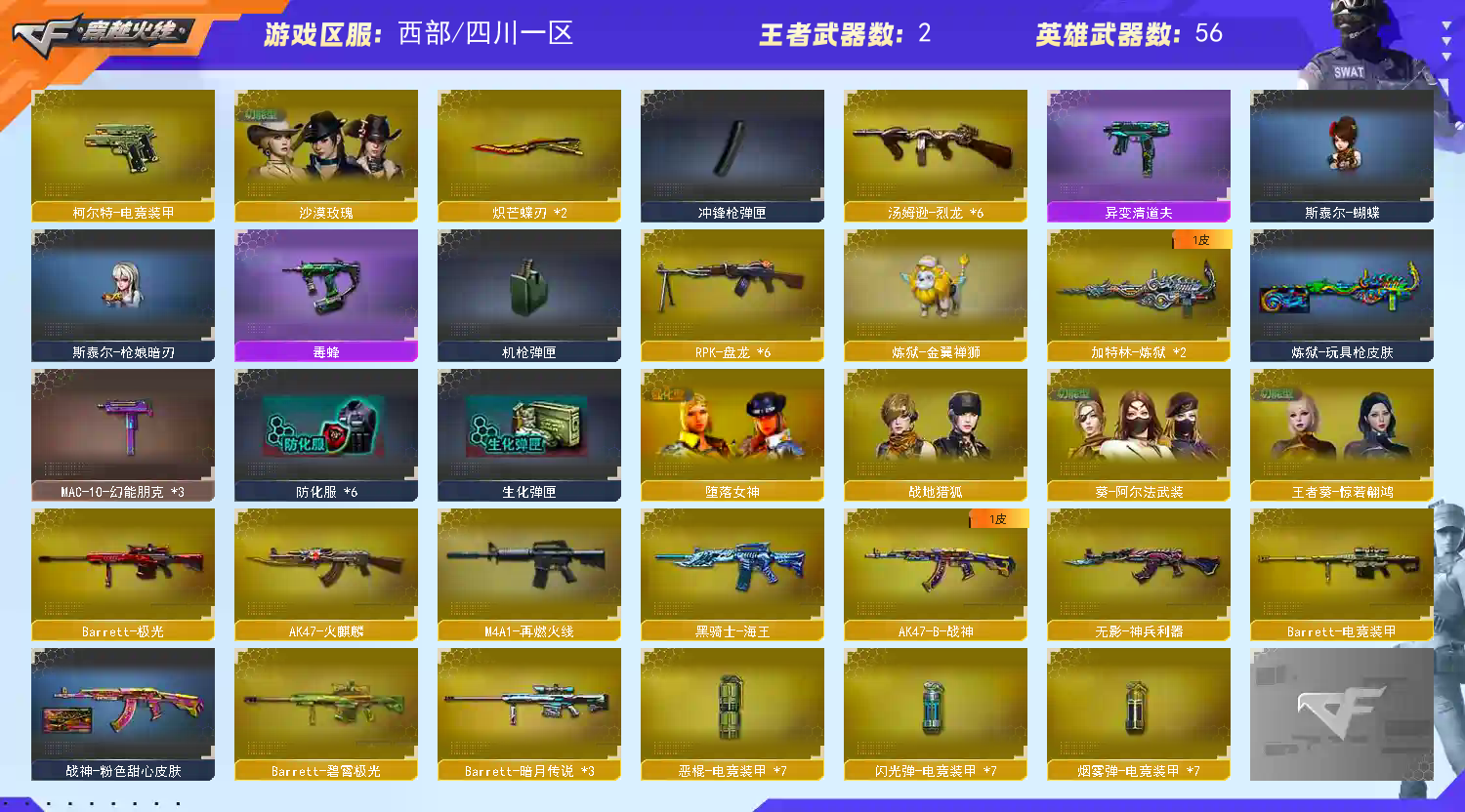 四防沙漠玫瑰,2把金翼禅狮带奇幻皮肤赋予卷,2蝴蝶刀,蝴蝶,枪娘,清道夫斯太尔,六烈六盘,两炼狱加特林,5妖姬手雷10黑桃手雷,弹夹齐全,科技玩家请绕道,开挂封号必追究;