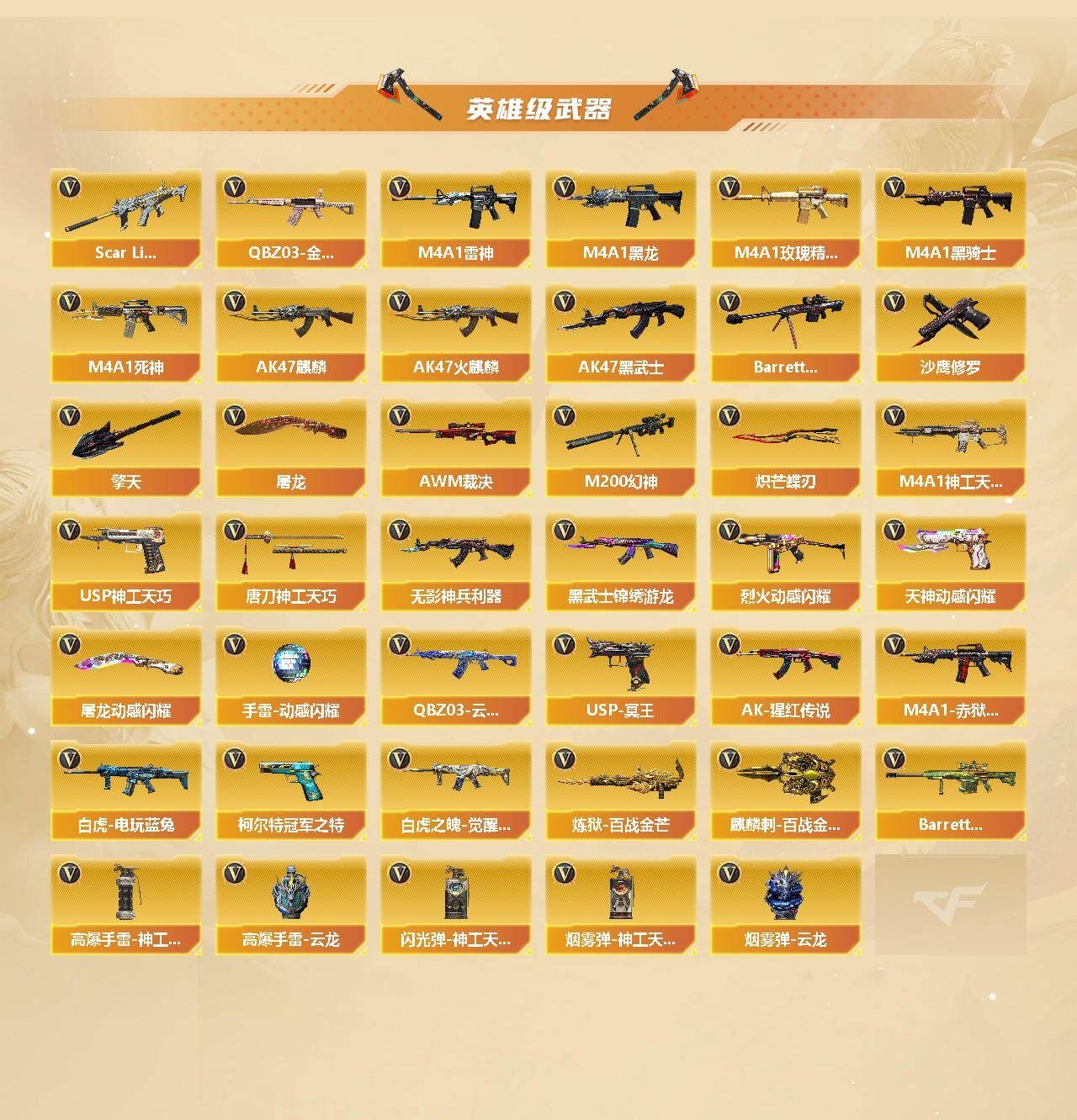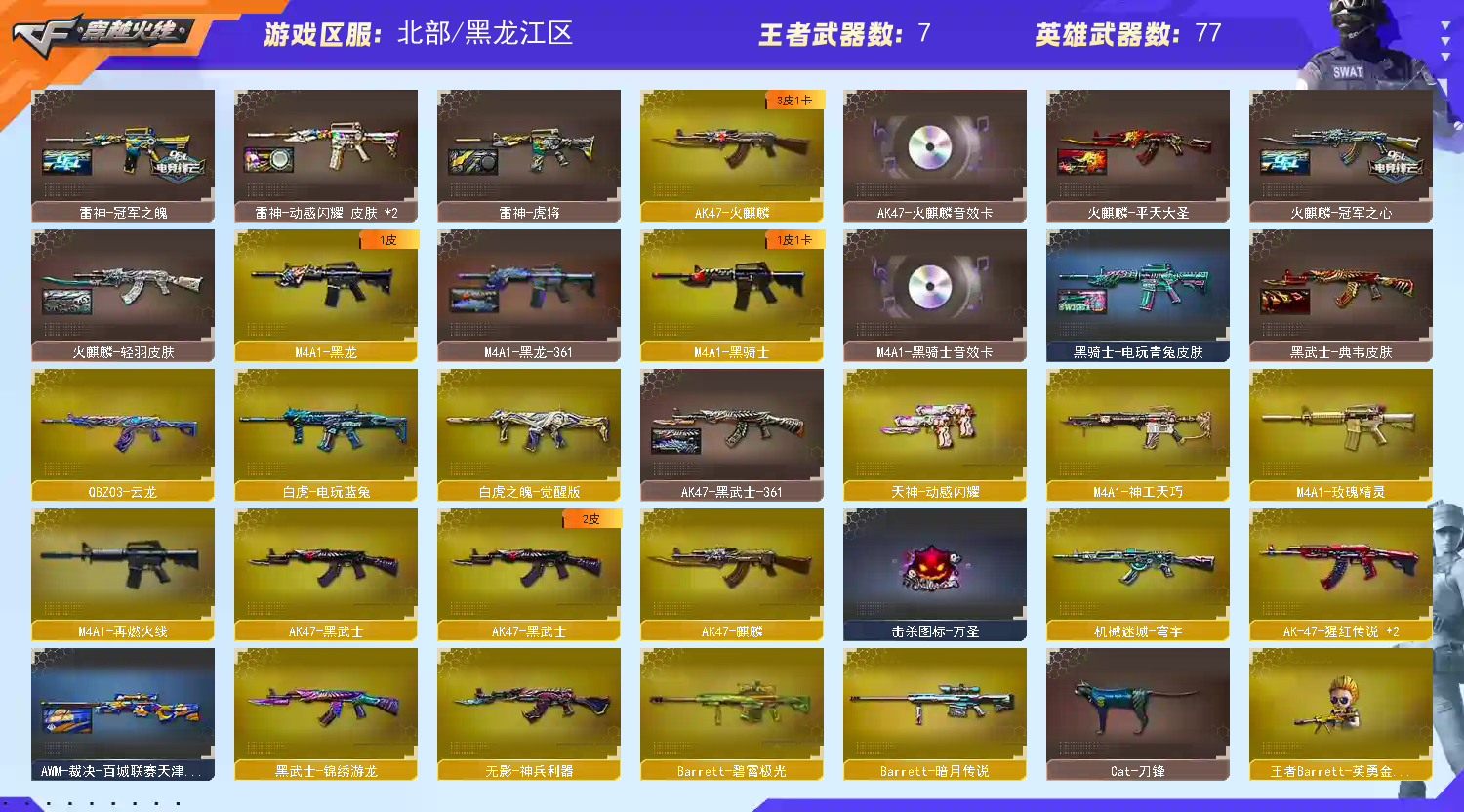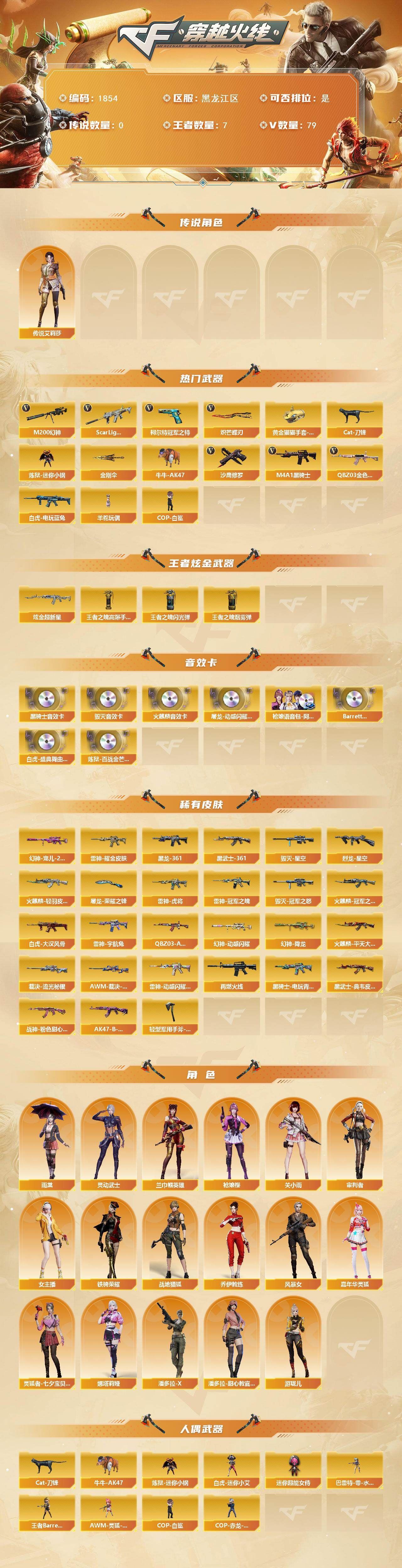 【传说角色】:传说艾莉莎【热门武器】:QBZ03-金色蔷薇,Scar Light-白虎,M200-幻神,白虎-电玩蓝兔,柯尔特-冠军之特*2,Cat-刀锋,炼狱-迷你小钢,牛牛-AK47,M4A1-黑骑士,羊驼玩偶,COP-白鲨,沙鹰-修罗*5,炽芒蝶刃,黄金猫猫手套-白鲨,金刚伞【王者炫金武器】:炫金超新星,王者之魄高爆手雷*2,王者之魄闪光弹*2,王者之魄烟雾弹*2【音效卡】:屠龙-动感闪耀 音效卡,AK47-火麒麟音效卡,M4A1-黑骑士音效卡,Barrett-毁灭音效卡,枪娘语音包-阿敏,Barrett-碧霄极光音效卡,白虎-盛典舞曲音效卡,炼狱-百战金芒-庆典舞曲音效卡【皮肤】:幻神-宠儿-2021MVP,幻神-降龙,幻神-动感闪耀 皮肤,白虎-大汉风骨,QBZ03-AG-CFPLS19冠军,裁决-流光秘银,AWM-裁决-百城联赛天津皮肤,烈龙-星空,雷神-虎将,雷神-耀金皮肤,雷神-冠军之魄,雷神-宇航兔皮肤,雷神-动感闪耀 皮肤*2,M4A1-再燃火线,火麒麟-冠军之心,火麒麟-轻羽皮肤,火麒麟-平天大圣,毁灭-星空,毁灭-冠军之怒,M4A1-黑龙-361,黑骑士-电玩青兔皮肤,AK47-黑武士-361,黑武士-典韦皮肤,战神-粉色甜心皮肤*2,AK47-B-常胜将军-曹操*2,屠龙-荣耀之锋,轻型军用手斧-再燃火线【角色】:雨棠,关小雨,枪娘樱,兰-巾帼英雄,审判者,战地猎狐,乔伊教练,风暴女,嘉年华灵狐,灵动武士,灵狐者-七夕宝贝,娜塔莉娅,女主播,潘多拉-X,潘多拉-甜心教官,铁骑荣耀,游珑儿【人偶武器】:COP-白鲨,白虎-迷你小艾,王者Barrett-英勇金戈,炼狱-迷你小钢,巴雷特-零-水下丽影,COP-赤龙-刀锋,AWM-灵狐-15周年嘉年华,Cat-刀锋,牛牛-AK47,迷你超能女侍【英雄级武器】:AK47-火麒麟,AK47-麒麟,M4A1-黑龙,M4A1-雷神,M4A1-黑骑士,M4A1-死神,AK47-黑武士,Scar Light-白虎,M4A1-神工天巧,无影-神兵利器,QBZ03-云龙,黑武士-锦绣游龙,M4A1-玫瑰精灵,QBZ03-金色蔷薇,烈火-动感闪耀,AK-47-猩红传说*2,白虎-电玩蓝兔,白虎之魄-觉醒版,Barrett-毁灭,AWM-裁决,M200-幻神,炼狱-百战金芒,沙鹰-修罗*5,柯尔特-冠军之特*2,USP-神工天巧,USP-冥王,天神-动感闪耀,屠龙,擎天,炽芒蝶刃,唐刀-神工天巧*2,屠龙-动感闪耀,麒麟刺-百战金芒,高爆手雷-神工天巧*9,手雷-动感闪耀,高爆手雷-云龙,闪光弹-神工天巧*8,烟雾弹-神工天巧*10,烟雾弹-云龙*2,M4A1-赤狱骑士,Barrett-碧霄极光【道具】:BS战队炫彩背包,CFS限定背包,EP战队炫彩背包,WE炫彩背包,云海游龙炫彩背包,炫彩背包,百战金芒炫彩背包,女皇终结者-魔龙之吻,救世主-黑桃战神,绿色巨人,灵魂忍者,变异宝贝,迷雾幽灵,夺命之镰,防化服*3,金色流光-枪王排位*2,星辰流光-枪王排位,巅峰赛先锋-金色流光,流光-鎏金之域,枪王排位28赛季金色流光,枪王排位29赛季金色流光,语音特效-盛典烟火,萌萌小葵表情,芳心审判者表情,电玩兔兔表情,动感闪耀表情,EP战队收纳包,EP战队击杀图标,防弹头盔*4,防弹衣*4,C4工具钳*4,手雷包*4【特殊枪械】:1白虎,1黑骑士】;柯尔特-冠军之特,炽芒蝶刃,传说艾莉莎,QBZ03-金色蔷薇,M200-幻神,Scar Light-白虎,