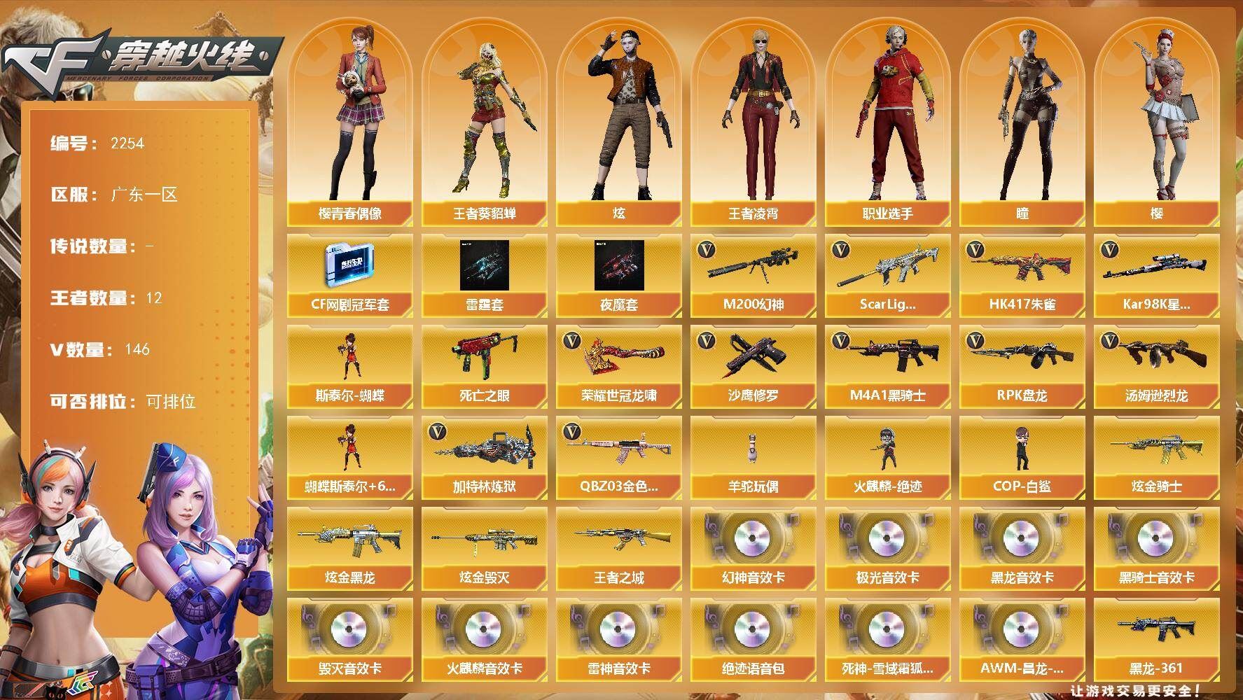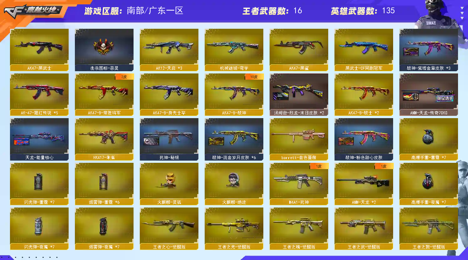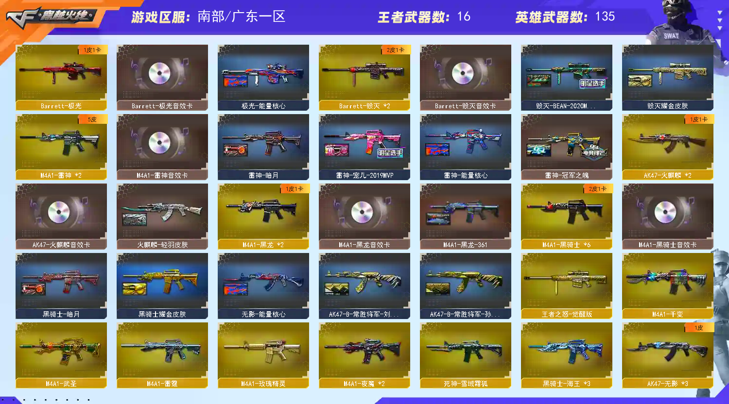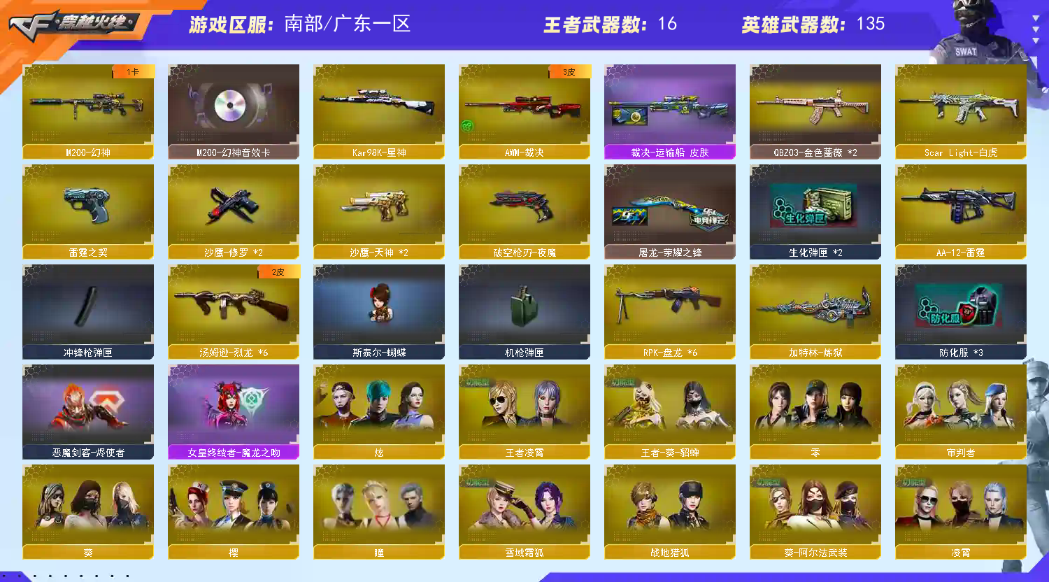 【热门武器】:QBZ03-金色蔷薇*2,Scar Light-白虎,HK417-朱雀,M200-幻神,死亡之眼,Kar98K-星神,M4A1-黑骑士*6,汤姆逊-烈龙*6,RPK-盘龙*6,加特林-炼狱,斯泰尔-蝴蝶,羊驼玩偶,火麒麟-绝迹,COP-白鲨,沙鹰-修罗*2,荣耀世冠-龙啸【稀有套装】:雷霆套,夜魔套,CF网剧冠军套【王者炫金武器】:王者之城,炫金骑士,炫金黑龙,炫金毁灭*2【音效卡】:M200-幻神音效卡,AK47-火麒麟音效卡,M4A1-雷神音效卡,M4A1-黑龙音效卡,M4A1-黑骑士音效卡,Barrett-毁灭音效卡,Barrett-极光音效卡,绝迹语音包,死神-雪域霜狐-怀旧音效卡,AWM-昌龙-怀旧音效卡【皮肤】:裁决-运输船 皮肤,裁决-胜者为王 皮肤,雷神-冠军之魄,雷神-宠儿-2019MVP,火麒麟-轻羽皮肤,毁灭耀金皮肤,毁灭-BEAN-2020MVP,黑龙-暗月,M4A1-黑龙-361,黑骑士-暗月,黑骑士耀金皮肤,屠龙-荣耀之锋,屠龙-惊鸿 皮肤,轻型军用手斧-再燃火线【角色】:凌霄,审判者,战地猎狐,四防王者-葵-貂蝉,王者凌霄,雪域霜狐,奇洋探员,乔伊教练,云海玲珑,樱-青春偶像,影武者-X,职业选手【人偶武器】:火麒麟-绝迹,COP-白鲨,火麒麟-灵狐,M4A1-雷神-精英刀锋,斯泰尔-蝴蝶,M37-葵,COP-旗袍,迷你深渊冰龙,迷你牛魔王,夺魂,深渊终结者手雷*2【暴走生化】:死亡之眼,超级对讲机【挑战大师】:火狱乱世-超越Max,神圣爆裂者III,VEPR-12-金魔,激光毁灭者III*2,神圣爆裂者-末日III,阐释者III【英雄级武器】:M4A1-千变,AK47-火麒麟*2,M4A1-黑龙*2,M4A1-雷神*2,M4A1-黑骑士*6,AK47-无影*3,M4A1-死神,AK47-黑武士,AK12-天启*3,M4A1-武圣,AK47-黑鲨,M4A1-雷霆,HK417-朱雀,Scar Light-白虎,M4A1-夜魔*2,死神-雪域霜狐,M4A1-玫瑰精灵,QBZ03-金色蔷薇*2,王者之心-觉醒版,王者之武-觉醒版,王者之魄-觉醒版,王者之戮-觉醒版,AK-47-猩红传说*5,AK47-B-战神,黑骑士-海王*3,AK47-B-常胜将军,黑武士-CF网剧冠军,AWM-天龙*2,Barrett-毁灭*2,Barrett-极光,AWM-裁决,M200-幻神,Kar98K-星神,Barrett-金色蔷薇,王者之怒-觉醒版,王者之光-觉醒版,RPK-盘龙*6,加特林-炼狱,汤姆逊-烈龙*6,AA-12-雷霆,沙鹰-修罗*2,沙鹰-天神*2,COP-雷霆,破空枪刃-夜魔,【道具】:BS战队炫彩背包,云山科技背包,亚洲杯纪念炫彩背包,冰冰背包-猛男专用,女皇终结者-背包,炫彩背包,白狐背包,百战金芒炫彩背包,超级背包*2,雪域霜狐炫彩背包,女皇终结者-魔龙之吻,救世主-黑桃战神,妩媚妖姬,绿色巨人,灵魂忍者,变异宝贝,迷雾幽灵,生化弹匣*2,夺命之镰,防化服*3,金色流光-枪王排位,流光-鎏金之域,流光-再燃火线,语音特效-怀旧,雪域霜狐表情,云海游龙表情,C4-高无钳,C4-红龙,C4-再燃火线,防弹头盔*7,防弹衣*9,C4工具钳*5,手雷包*4【特殊枪械】:蝴蝶斯泰尔+6烈龙,1白虎,6黑骑士,6烈龙,6盘龙,1炼狱,1蝴蝶斯泰尔;RPK-盘龙,QBZ03-金色蔷薇,M200-幻神,Scar Light-白虎,Kar98K-星神,
