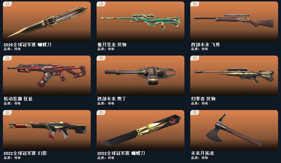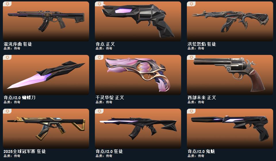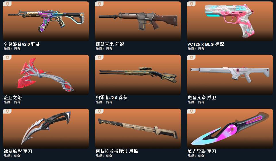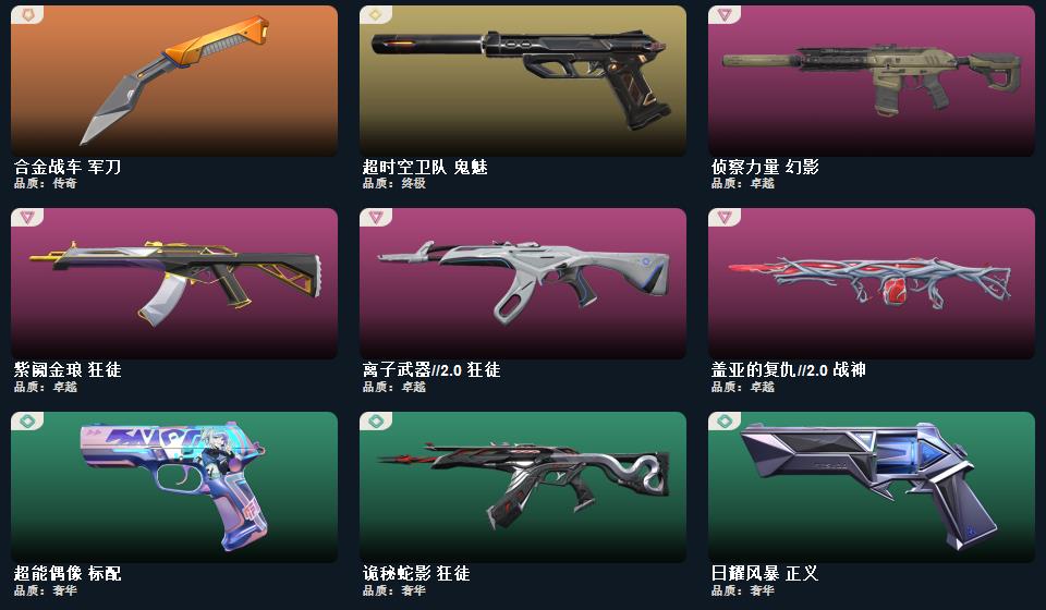 wegame无畏契约★武器皮肤数量:85,阿特拉斯指挥部 标配,太空穿梭 正义,悠闲猫生 短炮,超时空卫队 鬼魅,日耀风暴 正义,诡秘蛇影 鬼魅,折光棱晶 标配,末日之翼 短炮,VCT25 x BLG 标配,西部未来 正义,纳米打击 正义,超限闪存 正义,奇点 正义,奇点//2.0 鬼魅,超能偶像 标配,千灵华绽 正义,流星兵团 鬼魅,彩梦之城 标配,信手涂鸦 鬼魅,弧光异彩 短炮,数码咒术 鬼魅,合金战车 正义,花漾粉红 狂怒