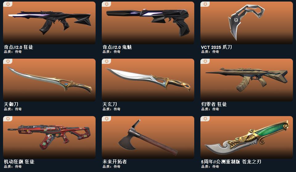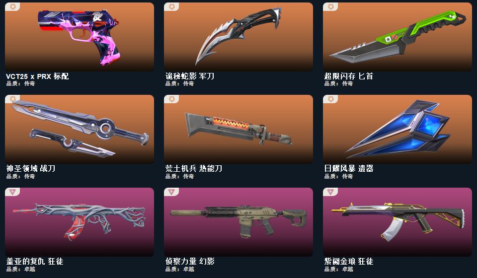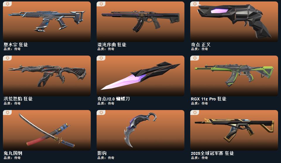 wegame无畏契约★武器皮肤数量:93,幻心猎手 鬼魅,星际猎兵 标配,阿特拉斯指挥部 标配,日耀风暴 正义,甜蜜战术 鬼魅,幻语魔咒 狂怒,诡秘蛇影 鬼魅,末日之翼 短炮,折光棱晶 标配,星云暗涌 鬼魅,VCT25 x PRX 标配,神圣领域 狂怒,月球哨兵 正义,纳米打击 正义,荒土机兵 标配,逆冲蛮牛 狂怒,天界神兵 鬼魅,奇点//2.0 鬼魅,超限闪存 正义,浮光跃金 标配,模拟赫兹 鬼魅,奇点 正义