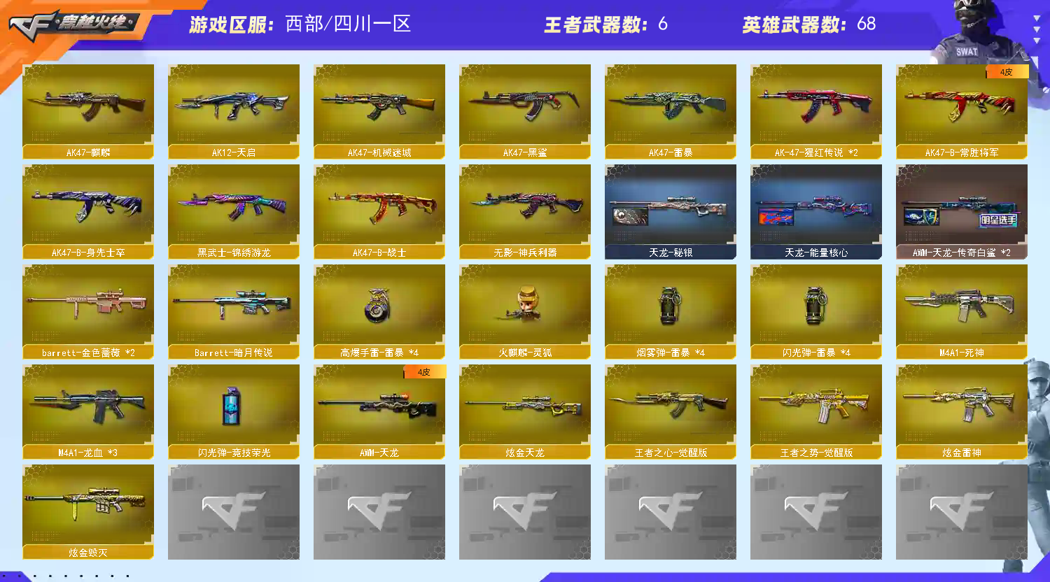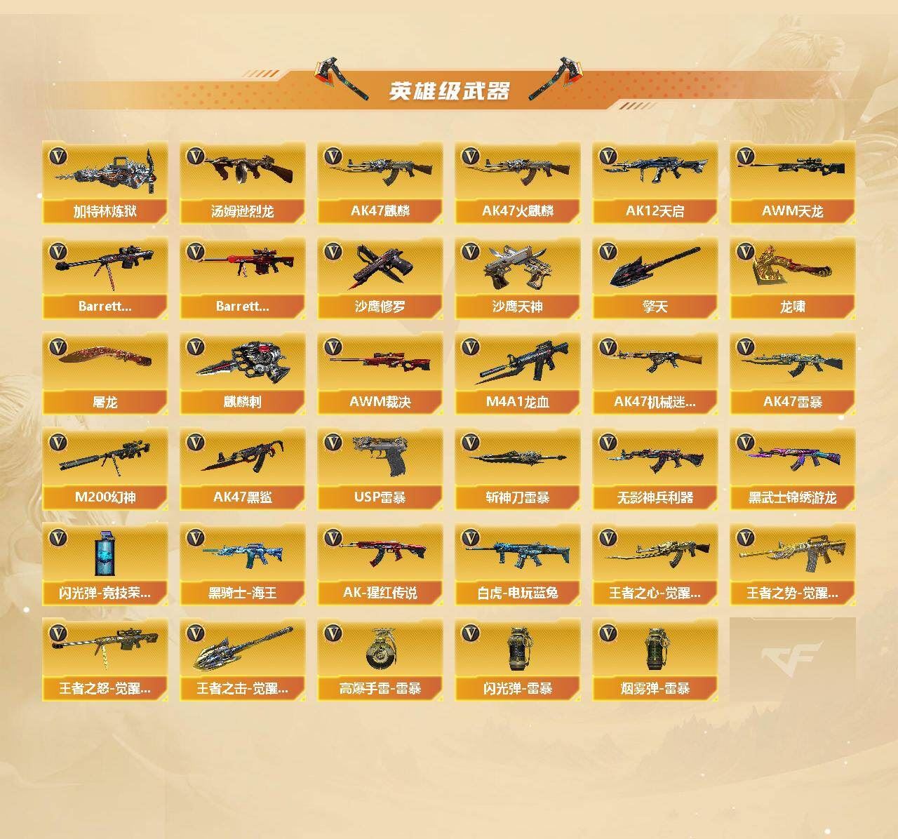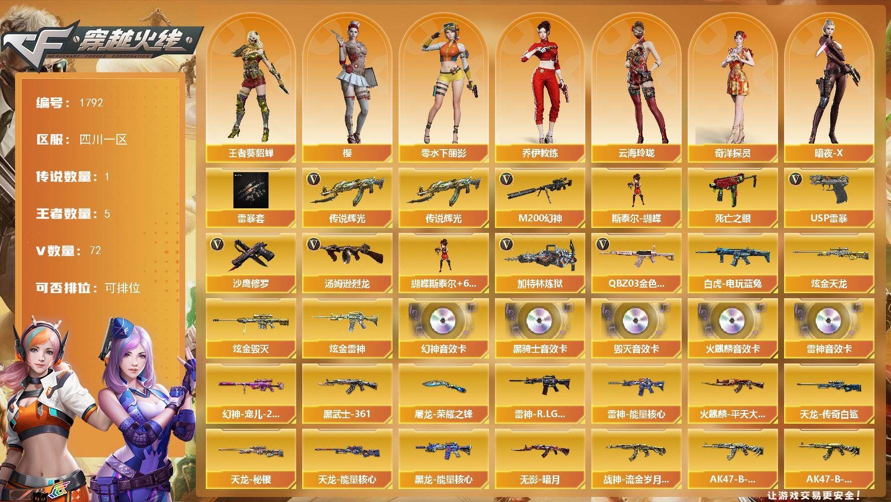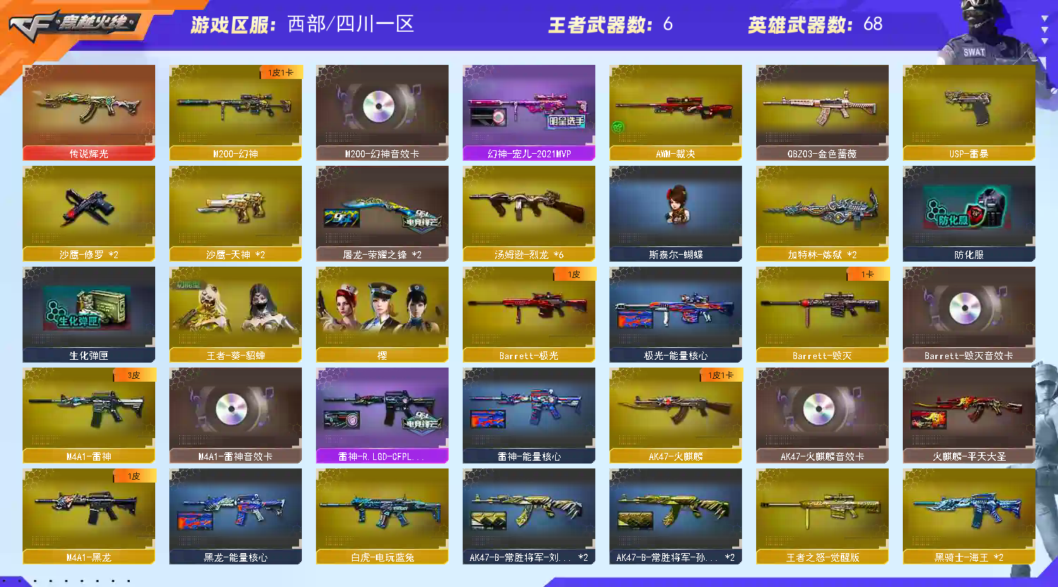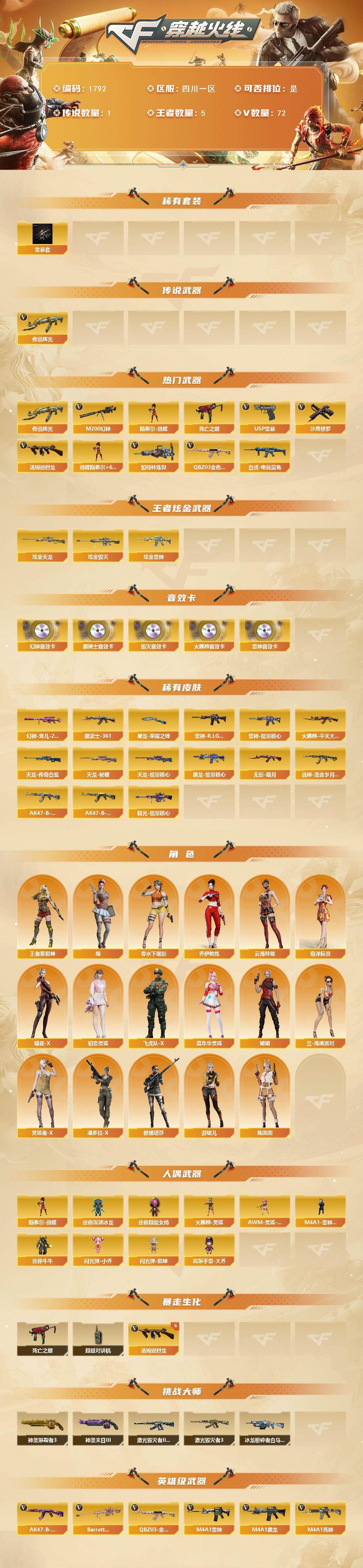 【传说武器】:传说辉光【热门武器】:传说辉光,QBZ03-金色蔷薇,M200-幻神,死亡之眼*2,白虎-电玩蓝兔,汤姆逊-烈龙*6,加特林-炼狱*2,斯泰尔-蝴蝶,USP-雷暴,沙鹰-修罗*2【稀有套装】:雷暴套【王者炫金武器】:炫金雷神,炫金毁灭,炫金天龙【音效卡】:M200-幻神音效卡,AK47-火麒麟音效卡,M4A1-雷神音效卡,M4A1-黑骑士音效卡,Barrett-毁灭音效卡【皮肤】:幻神-宠儿-2021MVP,雷神-能量核心,雷神-R.LGD-CFPLS18冠军,火麒麟-平天大圣,黑龙-能量核心,无影-暗月,AK47-黑武士-361,战神-流金岁月皮肤,AK47-B-常胜将军-刘备*2,AK47-B-常胜将军-孙权*2,天龙-秘银,天龙-能量核心,AWM-天龙-传奇白鲨*2,极光-能量核心,屠龙-荣耀之锋*2【角色】:樱,王者-葵-貂蝉,奇洋探员,乔伊教练,云海玲珑,暗夜-X,初恋灵狐,飞虎队-X,嘉年华灵狐,娟娟,兰-海滩派对,零-水下丽影,灵狐者-X,潘多拉-X,兔囡囡,新娜塔莎,游珑儿【人偶武器】:火麒麟-灵狐,M4A1-雷神-精英刀锋,斯泰尔-蝴蝶,AWM-灵狐-15周年嘉年华,迷你深渊冰龙,迷你牛牛,闪光弹-小乔,闪光弹-貂蝉,高爆手雷-大乔,迷你超能女侍【暴走生化】:死亡之眼*2,超级对讲机【挑战大师】:神圣爆裂者III,冰龙粉碎者-白马银枪,激光毁灭者III-白马银枪,激光毁灭者III,神圣爆裂者-末日III【英雄级武器】:AK47-火麒麟,AK47-麒麟,M4A1-黑龙,M4A1-雷神,M4A1-死神,AK12-天启,AK47-机械迷城,AK47-黑鲨,M4A1-龙血*3,AK47-雷暴,无影-神兵利器,黑武士-锦绣游龙,QBZ03-金色蔷薇,王者之心-觉醒版,王者之势-觉醒版,AK-47-猩红传说*2,黑骑士-海王*2,AK47-B-常胜将军,白虎-电玩蓝兔,AWM-天龙,Barrett-毁灭,Barrett-极光,AWM-裁决,M200-幻神,Barrett-金色蔷薇*2,王者之怒-觉醒版,加特林-炼狱*2,汤姆逊-烈龙*6,沙鹰-修罗*2,沙鹰-天神*2,USP-雷暴,屠龙*4,龙啸,擎天,麒麟刺,斩神刀-雷暴,王者之击-觉醒版*2,高爆手雷-雷暴*4,闪光弹-雷暴*4,闪光弹-竞技荣光,烟雾弹-雷暴*4【道具】:超级背包*2,救世主-黑桃战神,生化弹匣,夺命之镰,防化服,金色流光-枪王排位*2,星辰流光-枪王排位,枪王排位28赛季金色流光,枪王排位29赛季金色流光,电玩兔兔表情,防弹头盔*2,防弹衣,C4工具钳,手雷包【特殊枪械】:蝴蝶斯泰尔+6烈龙,6烈龙,2炼狱,1蝴蝶斯泰尔,;USP-雷暴,QBZ03-金色蔷薇,M200-幻神,