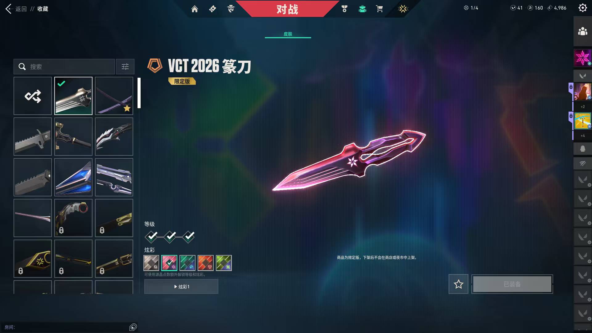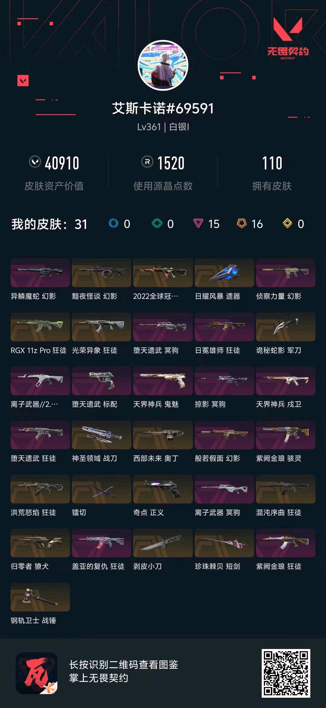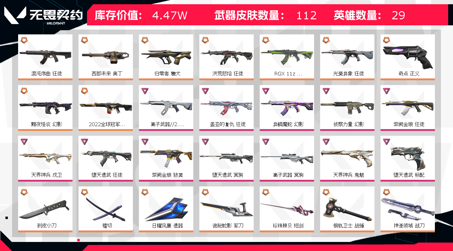 无畏契约账号出租 26vct篆刀,31皮肤含2022全球冠军/RGX/奇点 白银I可排位