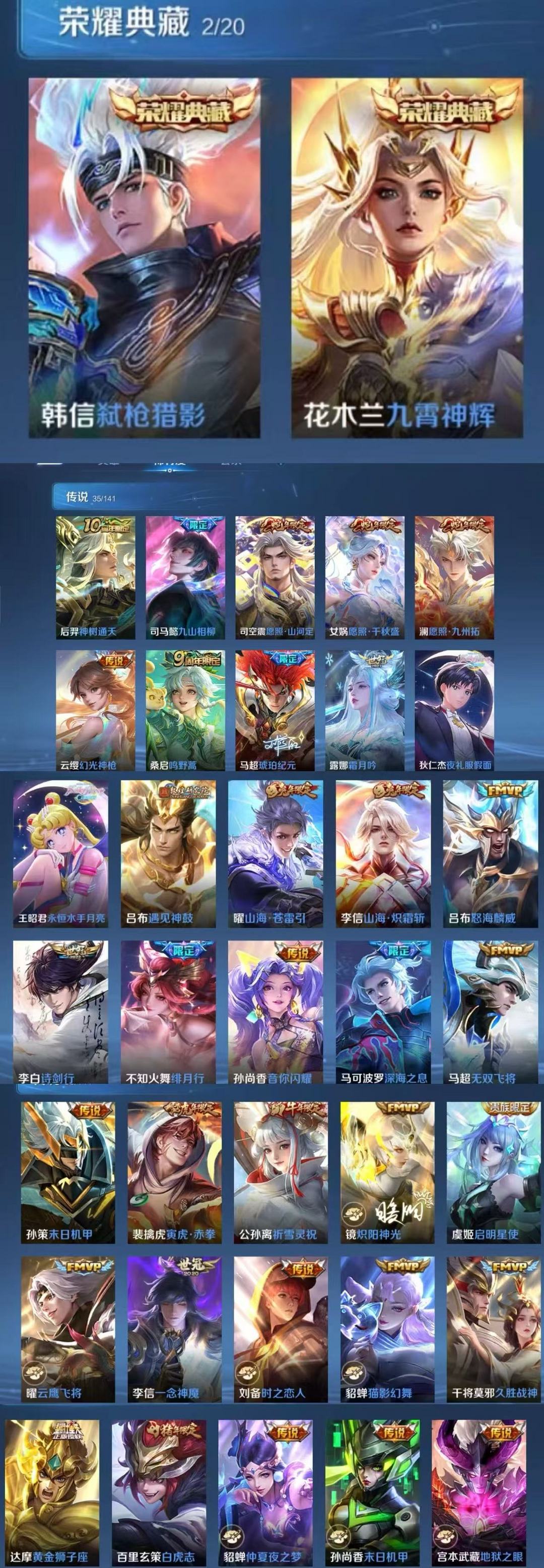 v10、537皮6水4无双、安琪拉-颠倒童话·魔镜、朵莉亚-神骥、遇见神鼓、齐天大圣、白虎志、韩信荣耀典藏、73传说、时之魔女、瑶无双、青丘、九尾、神器明辉仪