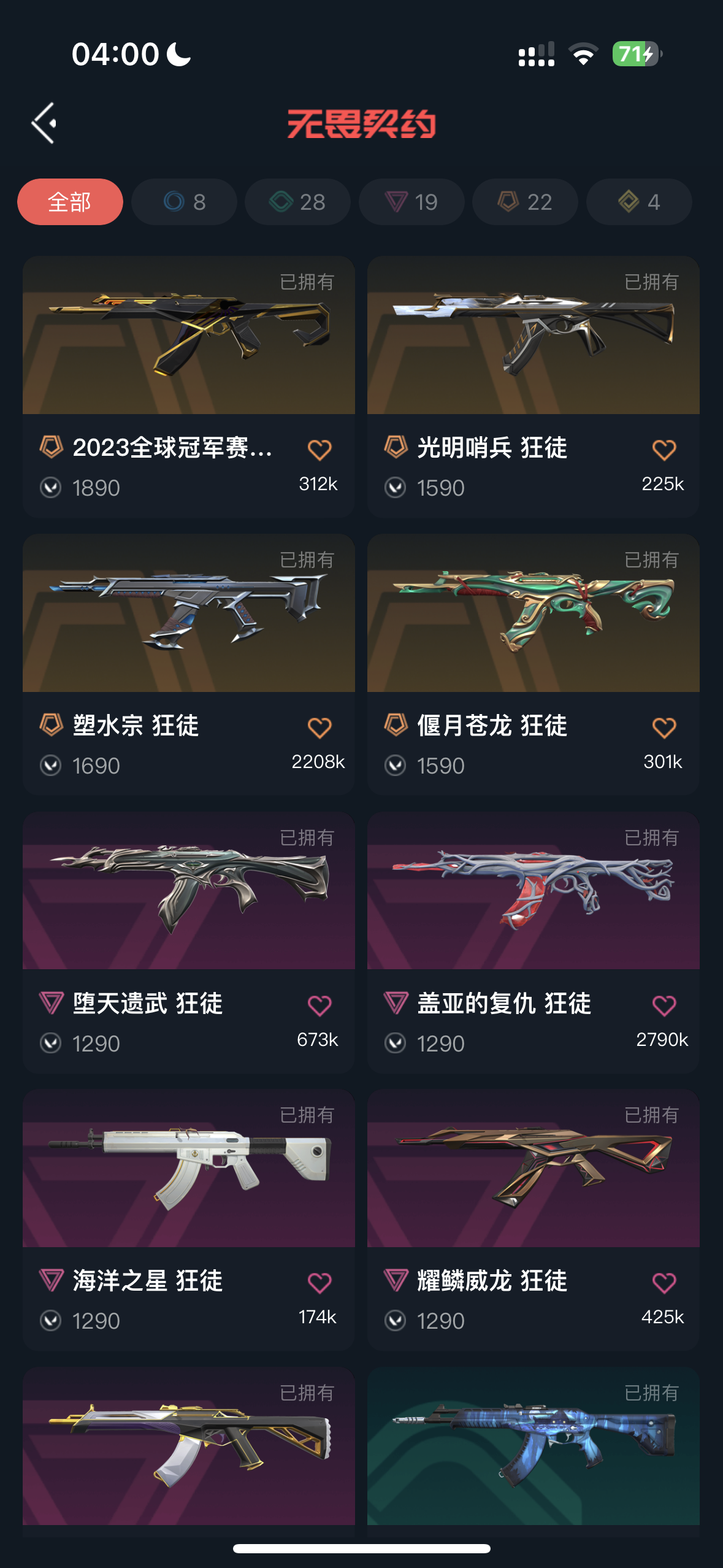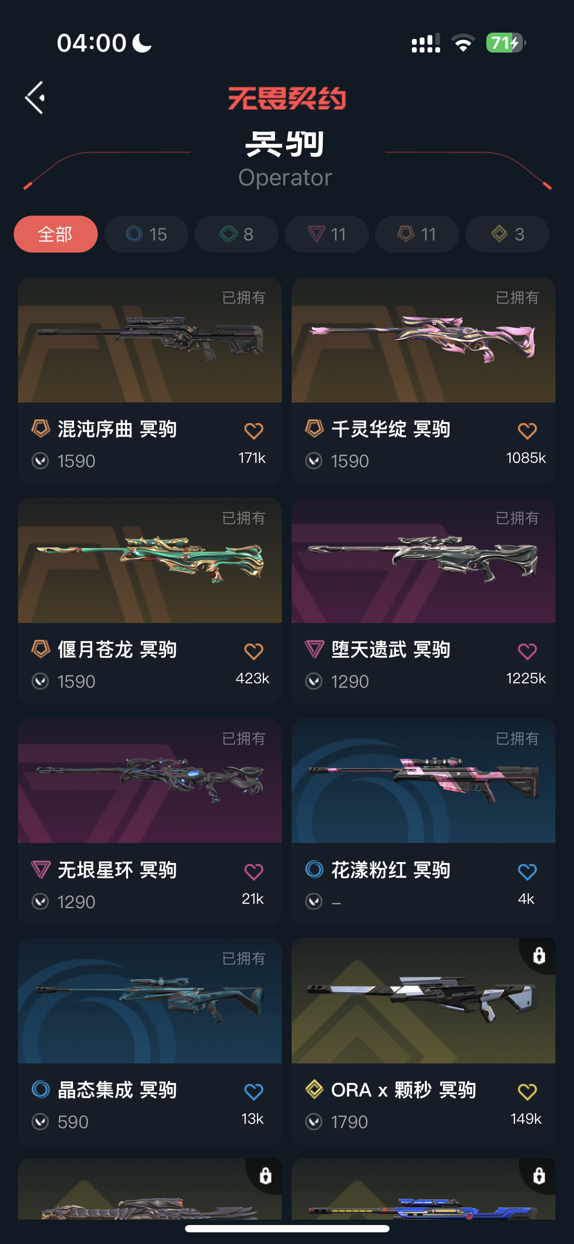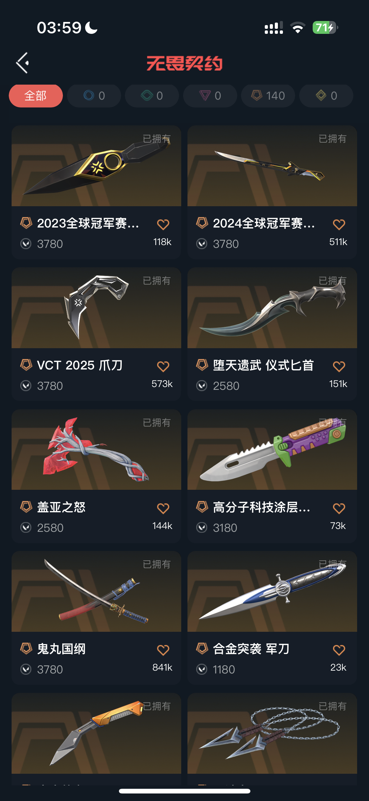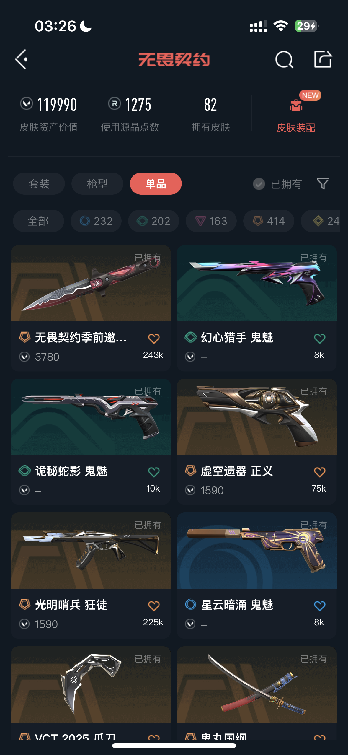 武器皮肤数量82 盖亚/紫金/塑水宗套/堕天遗武/偃月苍龙套/2023冠军套/光明哨兵/威龙套/显卡刀/离火刃/vct爪刀/2024冠军刀/鬼丸国纲;