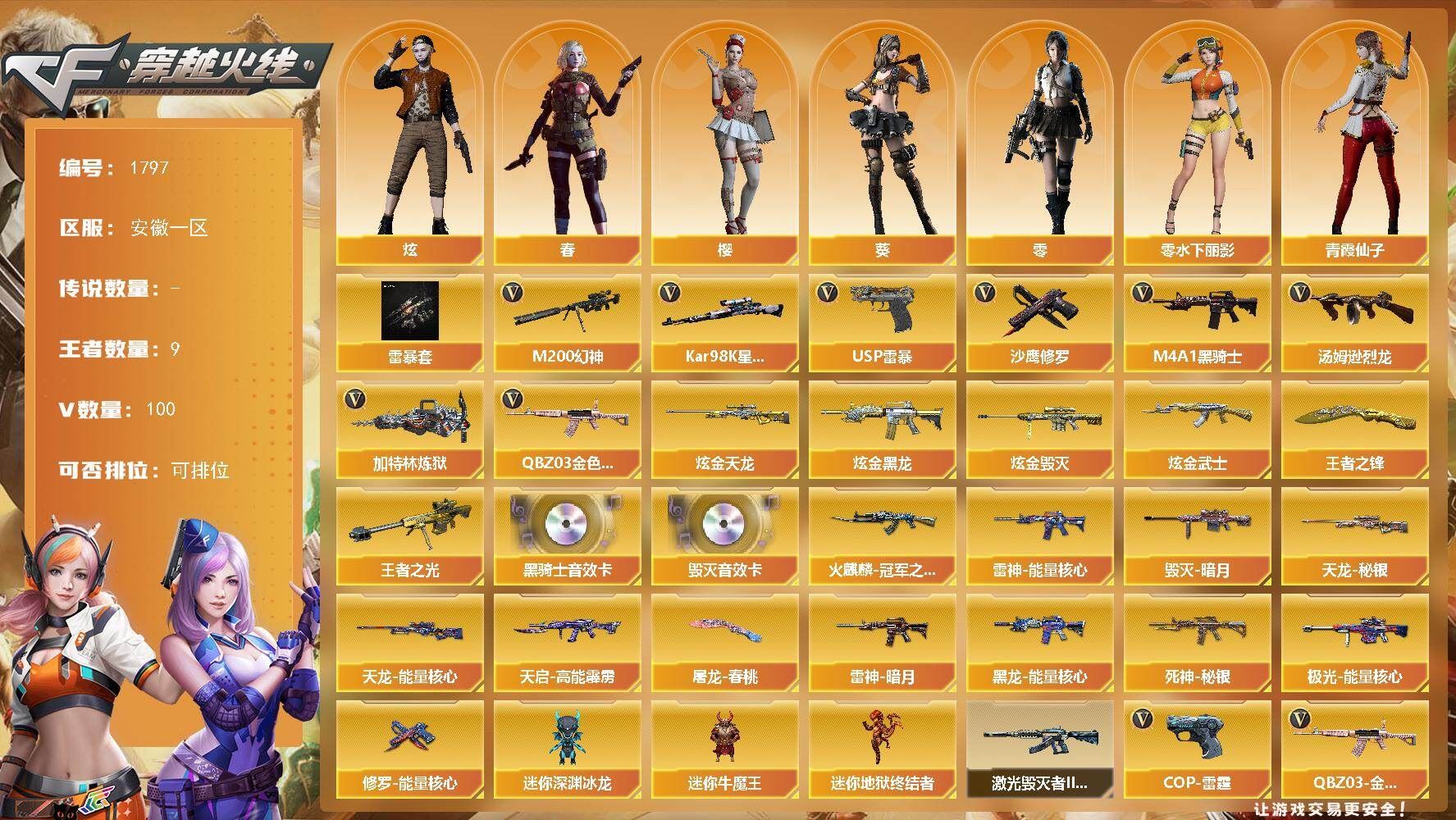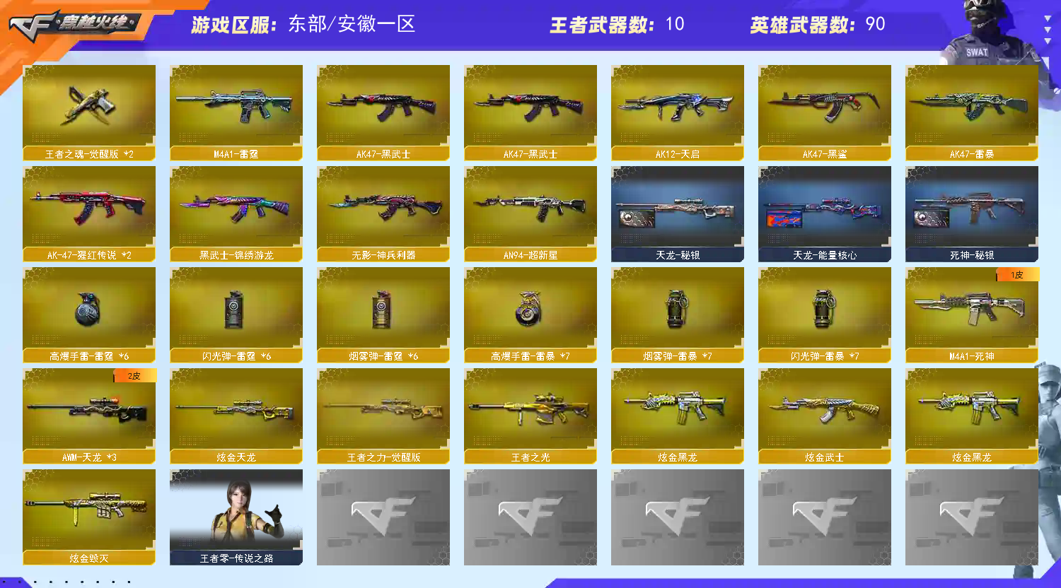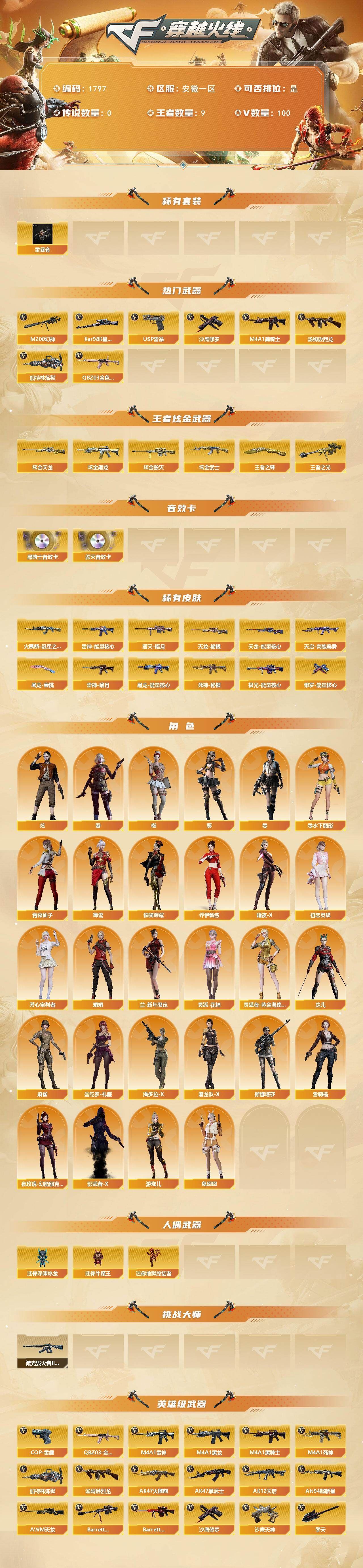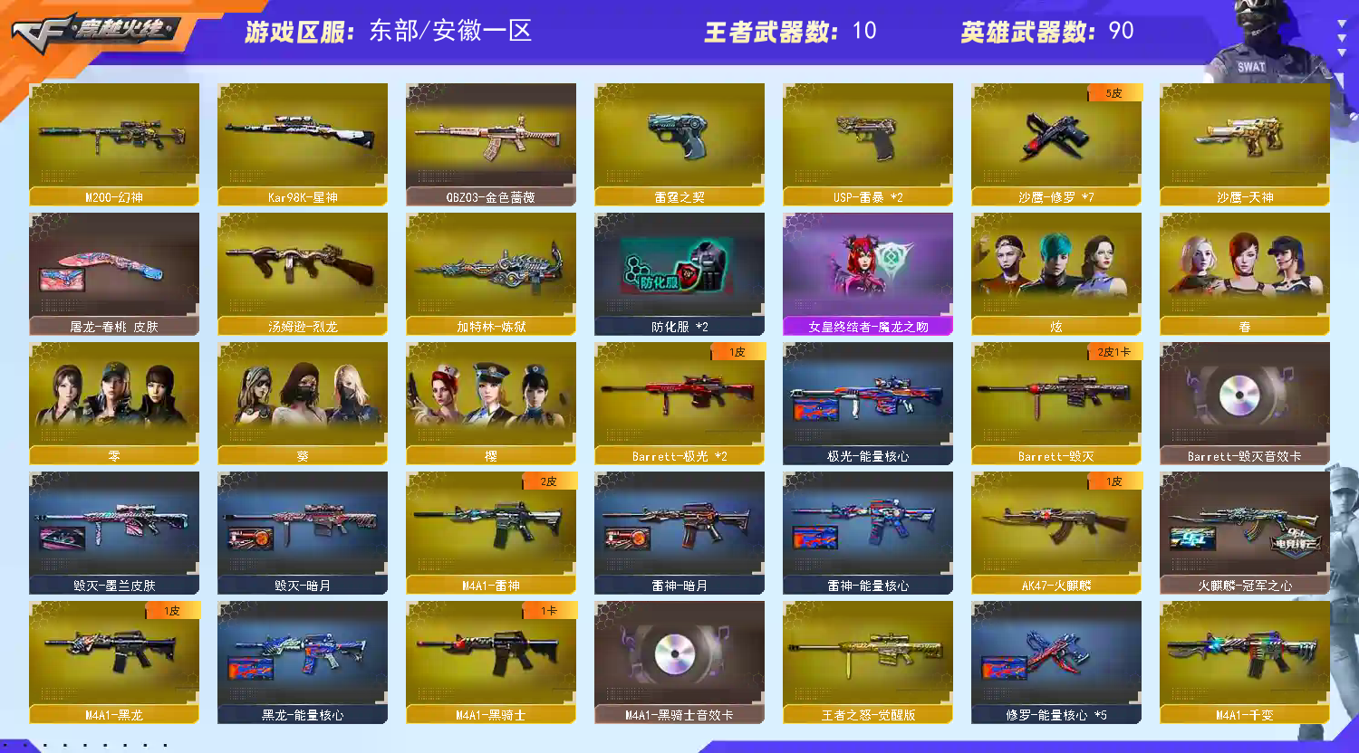 热门武器】:QBZ03-金色蔷薇,M200-幻神,Kar98K-星神,M4A1-黑骑士,汤姆逊-烈龙,加特林-炼狱,USP-雷暴*2,沙鹰-修罗*7【稀有套装】:雷暴套【王者炫金武器】:王者之光,王者之锋*2,炫金黑龙,炫金武士,炫金毁灭,炫金天龙【音效卡】:M4A1-黑骑士音效卡,Barrett-毁灭音效卡【皮肤】:雷神-暗月,雷神-能量核心,火麒麟-冠军之心,毁灭-暗月,黑龙-能量核心,死神-秘银,天启-高能霹雳 皮肤,天龙-秘银,天龙-能量核心,极光-能量核心,修罗-能量核心*5,屠龙-春桃 皮肤【角色】:零,葵,樱,炫,春,乔伊教练,暗夜-X,初恋灵狐,芳心审判者,娟娟,兰-新年限定,零-水下丽影,灵狐-花神,灵狐者-黄金海岸,龙儿,麻雀,曼陀罗-礼服,潘多拉-X,潜龙队-X,青霞仙子,蜀雪,铁骑荣耀,兔囡囡,新娜塔莎,雪莉杨,夜玫瑰-幻能朋克,影武者-X,游珑儿【人偶武器】:迷你地狱终结者,迷你深渊冰龙,迷你牛魔王【挑战大师】:激光毁灭者III-白马银枪【英雄级武器】:M4A1-千变,AK47-火麒麟,M4A1-黑龙,M4A1-雷神,M4A1-黑骑士,M4A1-死神,AK47-黑武士,AK12-天启,AN94-超新星,AK47-黑鲨,M4A1-雷霆,AK47-雷暴,无影-神兵利器,黑武士-锦绣游龙,QBZ03-金色蔷薇,AK-47-猩红传说*2,AWM-天龙*3,Barrett-毁灭,Barrett-极光*2,M200-幻神,Kar98K-星神,王者之怒-觉醒版,王者之力-觉醒版,加特林-炼狱,汤姆逊-烈龙,沙鹰-修罗*7,沙鹰-天神,USP-雷暴*2,COP-雷霆,王者之魂-觉醒版*2,屠龙*5,龙啸*2,擎天,麒麟刺,斩神刀-雷暴,王者之击-觉醒版,王者之刺-觉醒版,高爆手雷-雷霆*6,高爆手雷-雷暴*7,闪光弹-雷霆*6,闪光弹-雷暴*7,烟雾弹-雷霆*6,烟雾弹-雷暴*7【道具】:炫彩背包,超级背包,女皇终结者-魔龙之吻,绿色巨人,灵魂忍者,迷雾幽灵,夺命之镰,防化服*2,星辰流光-枪王排位,枪王排位28赛季金色流光,防弹头盔*4,防弹衣*4,C4工具钳*4,手雷包*4;USP-雷暴,QBZ03-金色蔷薇,M200-幻神,Kar98K-星神,