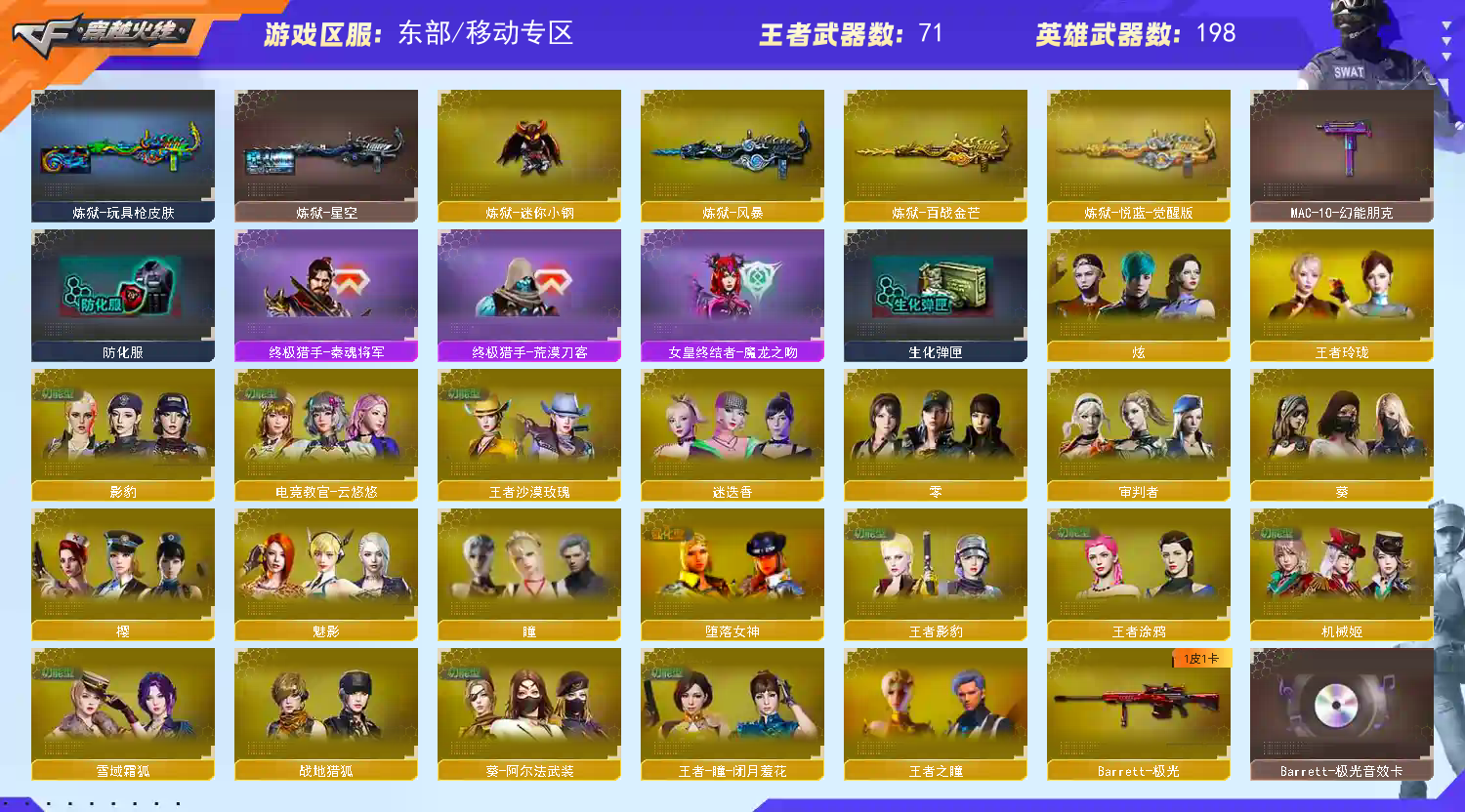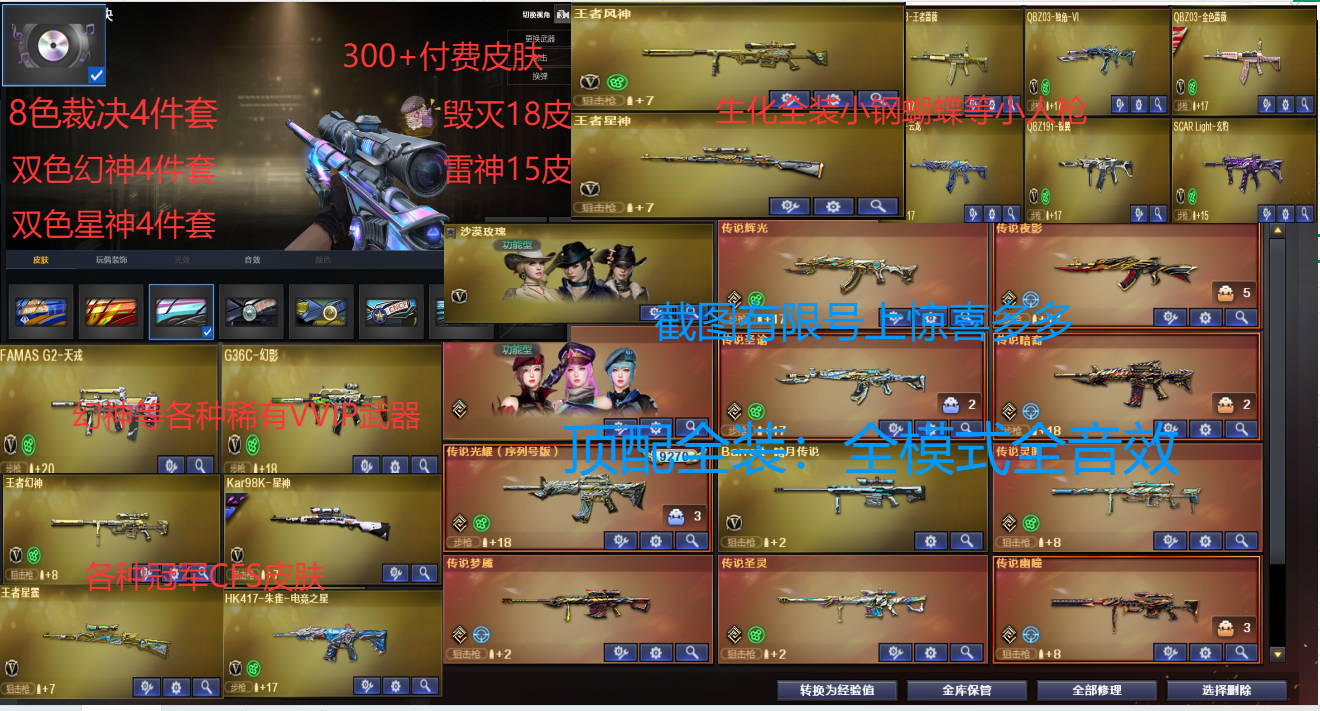 ⑩传说星骇幽瞳灵眸圣谕:幻影天戎八面银翼蝴蝶刀【⑧皮裁决幻神星神4件套】满配音效顶配生化炎龙3色蝴蝶 移动专区东部超精品可排位爆破生化双全装账号,6盘6烈 2月20日新增:冠军之特,荣耀之锋 主武器:,异变清道夫蛇影双娇×2,FAMAS G2-天戎,QBZ03-天罚,传说幽曈,QBZ191银翼游侠,G36C幻影,火麒麟,雷神×2,白虎,M4A1幻灵,无影-神兵利器,QBZ金色蔷薇,觉醒版王者之影,觉醒版王者之武,黑骑士海王,毁灭,裁决,幻神,星神,巴雷特暗夜传说,炼狱,炼狱风暴,AA12雷霆,火麒麟绝迹,觉醒版王者凰鸣,M14EB4冠军金牛,烈龙×6,盘龙×6,巴雷特金色蔷薇,觉醒版王者之势,极光,AK47雷暴,黑龙,M4A4堕天神,巴雷特零水下丽影,AN94超新星,AK12天启,M4A1黑骑士 副武器:柯尔特-荣耀世冠EP,EPUSP雷暴×7,COP雷霆,修罗,COP幻灵×2,冠军之特×6,COP白鲨,天神×2,柯尔特无冕之王,COP堕天神×3,柯尔特竞技荣光,传说幽冥,柯尔特荣耀世冠白鲨2023 近身武器:炽芒蝶刃×3,幻灵之锋,擎天云海游龙,觉醒版王者之锋,觉醒版王者之啸,屠龙×4,迷你宝贝,冠军之刃×2,尼泊尔雷霆,斩神刀雷暴,龙啸堕天神,麒麟刺堕天神 投掷武器:幻灵套投掷物×7套,雷暴套投掷物×7套,雷霆套投掷物×5套,堕天神套投掷物×7套,烟雾弹白鲨世冠2023,玄豹套投掷物×5套 角色:妮妮(爆破四防),传说星骸(爆破四防),传说影煞(生化四防),王者葵貂蝉(爆破四防),王者葵惊若翩鸿(爆破四防),王者玲珑小乔(生化四防),影豹(生化四防),岚兮儿(爆破四防),龙儿小淘气(爆破三防),新灵狐者(爆破三防),暗夜审判(爆破三防),灵动武士(爆破三防),春(爆破三防),炫(爆破三防),迷迭香(爆破三防),司雨(爆破三防),星际战将(爆破三防),关小雨(爆破三防),炽天使(爆破双防) 皮肤:幻神-YZK-2024MVP,白虎-虎牙,QBZ03-金色蔷薇-拼搏,幻神-荣耀世冠EP,白虎-白鲨-CFPLS23冠军,裁决巅峰荣耀,幻神-AG-CFPL S24冠军,毁灭魔灵,幻神冠军之幻,星神冠军之星,雷神烈虎,白虎-AG-CFPLS20冠军,毁灭风暴,雷神LGDS18冠军,幻神荣耀世冠白鲨,QBZ03冠军之薇,QBZ03荣耀世冠白鲨,QBZ03AGS19冠军,雷神耀金,雷神巅峰荣耀,QBZ巅峰荣耀,幻神宠儿-2021MVP(幻神宠儿),幻神N9-2022MVP(幻神念旧),雷神-宠儿-2019MVP(雷神宠儿),雷神-传奇N9(雷神N9),毁灭-AG-CFPLS15冠军,白虎冠军之虎,雷神荣耀之魄,屠龙荣耀之锋×3,屠龙星火燎原,白虎巅峰荣耀,幻神AG,幻神星火小队签名臻藏版,QBZ宠儿,QBZCFS2024,毁灭CFS2018,幻神Heartshot(幻神女团),幻神欧欧,QBZ量子蔷薇,幻影破浪逐光,雷神荣耀之魄CFPL十周年臻藏版,炽芒蝶刃冠军炽芒,毁灭SV,幻神星耀,屠龙星耀,裁决流光秘银,幻神荣耀世冠白鲨2023,炽芒蝶刃荣耀世冠白鲨2023,火麒麟巅峰荣耀,毁灭荣耀之怒,屠龙巅峰荣耀,雷神拼搏 音效卡:裁决音效卡,幻神音效卡,白虎音效卡,星神音效卡,毁灭音效卡,金色蔷薇音效卡,黑骑士音效卡,天罚音效卡 喜欢的老板可以收藏此账号,会不断更新新装备! 上号时请勿移动鼠标,上号时请勿移动鼠标,上号时请勿移动鼠标❗❗❗ 非账号问题需要维权请勿填写账号问题,可填写其他!感谢各位老板配合❗❗❗ 所有描述与实际均相符,如恶意维权账号问题或账号异常,一律拉黑处理❗❗❗;USP-雷暴,柯尔特-无冕之王,荣耀世冠-柯尔特,柯尔特-荣耀世冠白鲨2023,柯尔特-冠军之特,炽芒蝶刃,沙漠玫瑰,