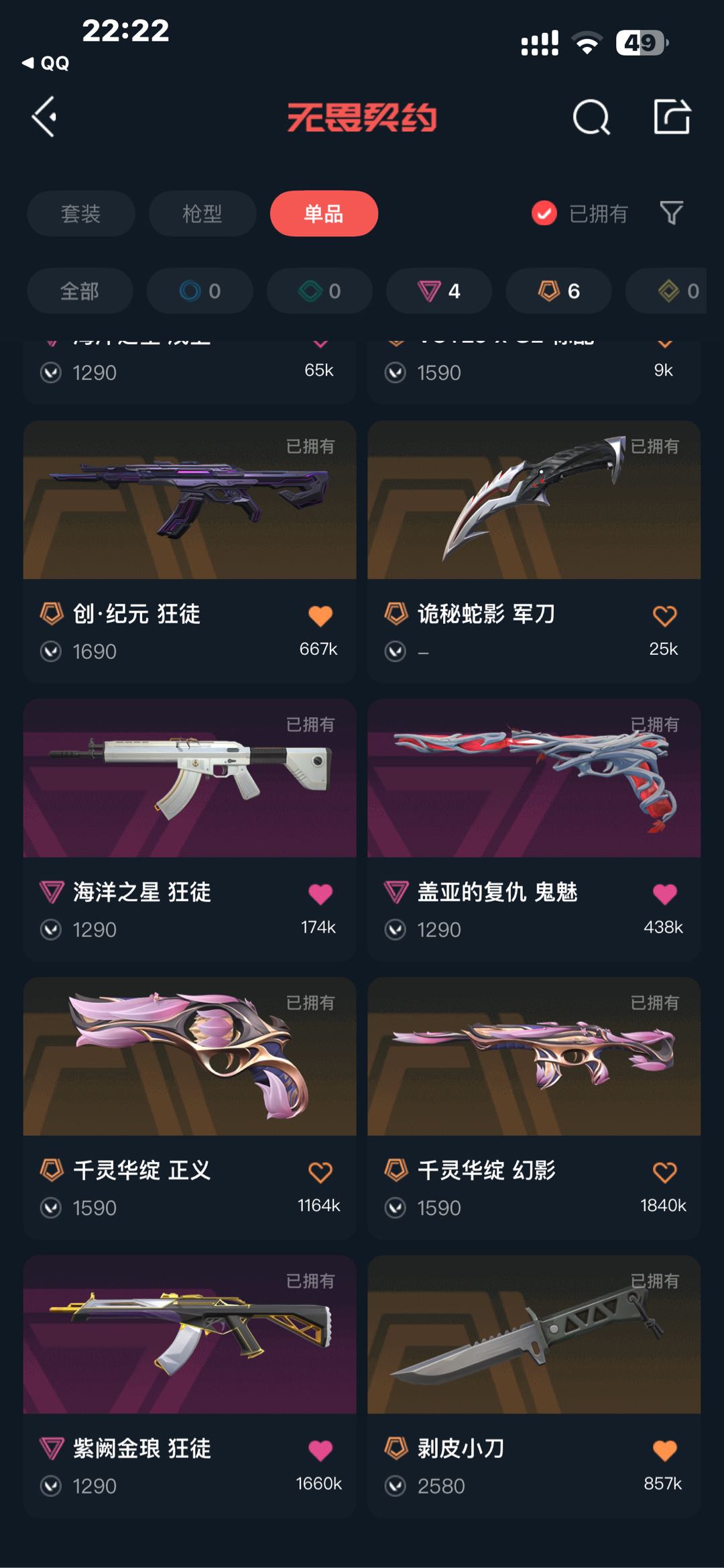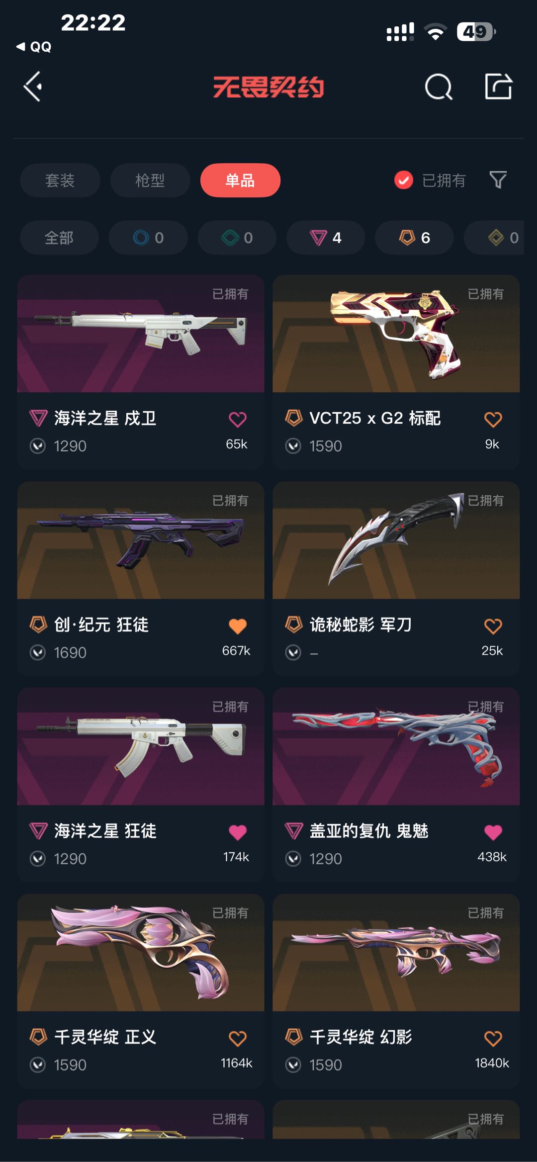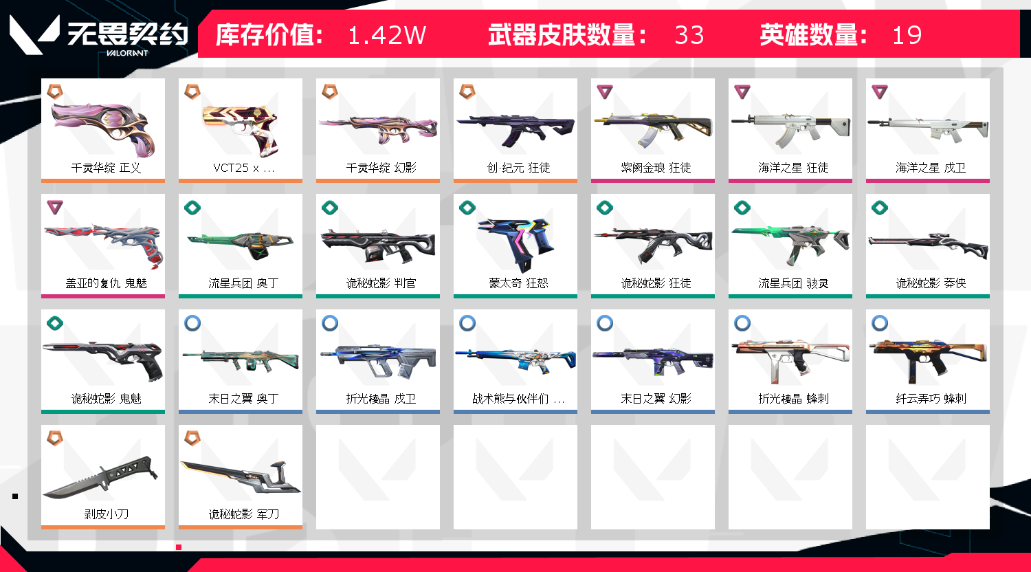 VCT标配⭐金狼狂徒⭐创纪元狂徒⭐剥皮小刀⭐千灵华绽幻影⭐海洋之星幻影和茂卫⭐千灵华绽正义⭐盖亚鬼魅