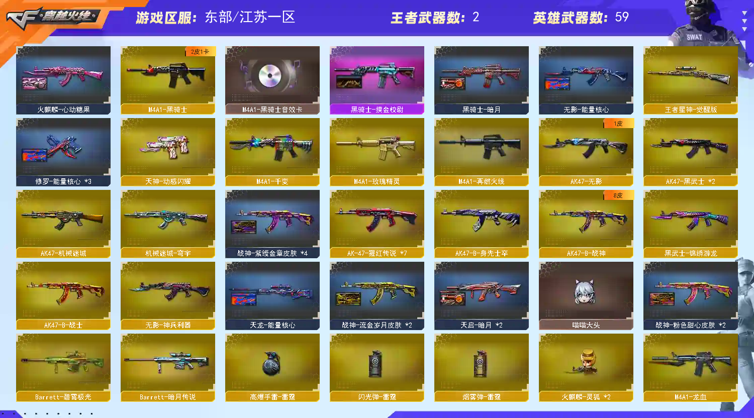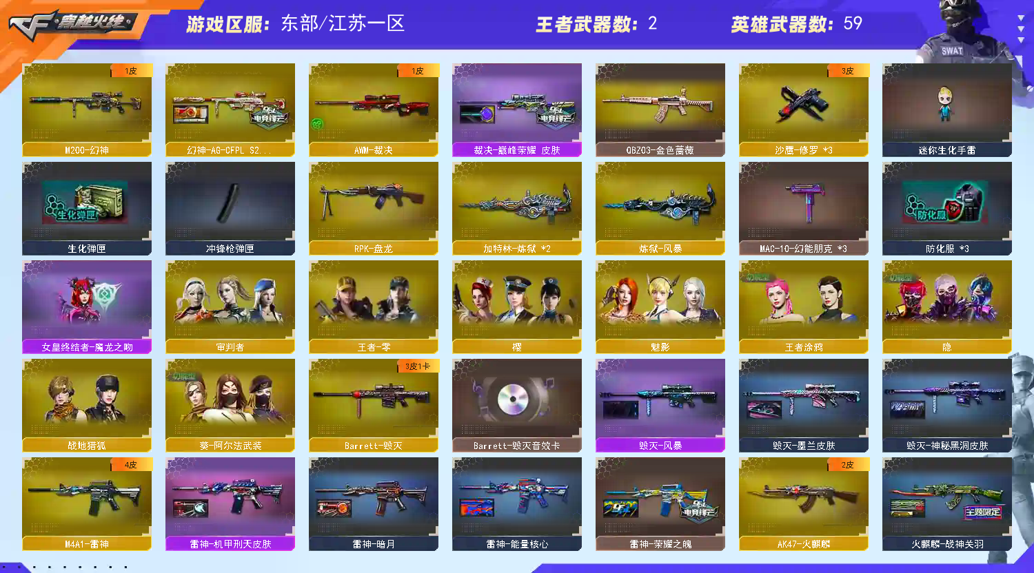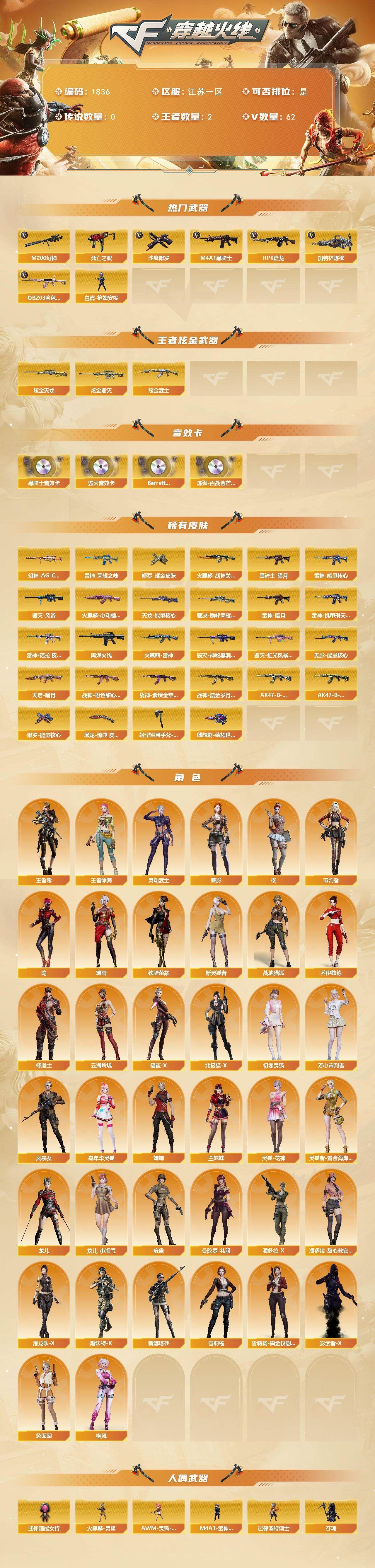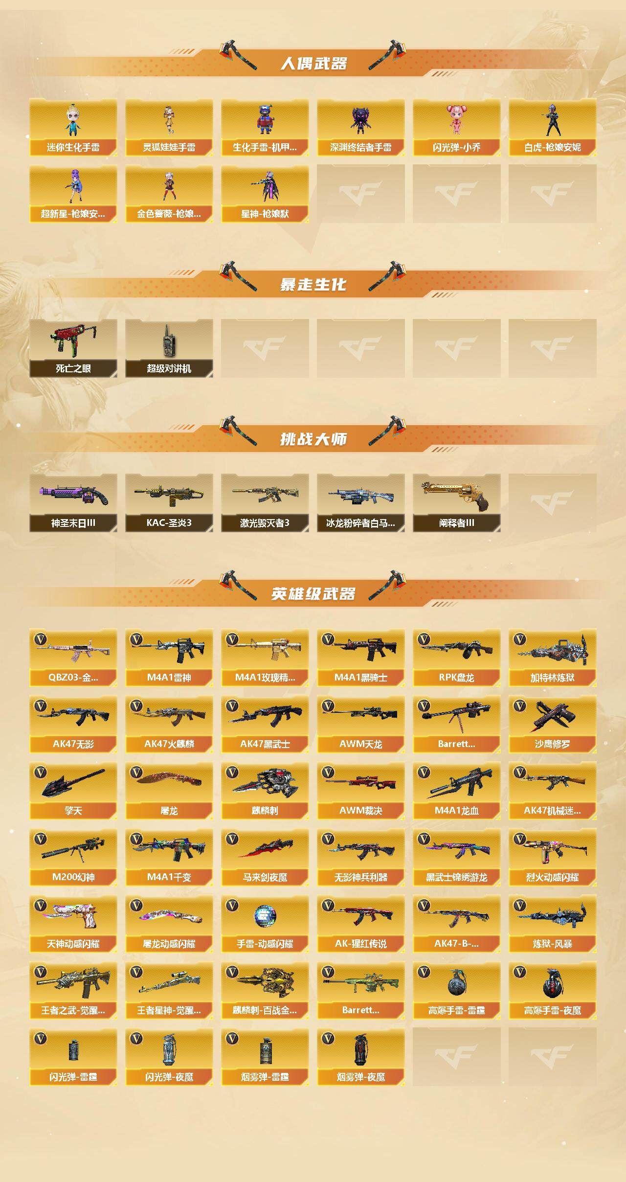 【热门武器】:QBZ03-金色蔷薇,M200-幻神,死亡之眼,M4A1-黑骑士,RPK-盘龙,加特林-炼狱*2,白虎-枪娘安妮,沙鹰-修罗*3【王者炫金武器】:炫金武士,炫金毁灭,炫金天龙【音效卡】:M4A1-黑骑士音效卡,Barrett-毁灭音效卡,Barrett-碧霄极光音效卡,炼狱-百战金芒-庆典舞曲音效卡【皮肤】:幻神-AG-CFPL S24冠军 皮肤,裁决-巅峰荣耀 皮肤,雷神-暗月,雷神-能量核心,雷神-荣耀之魄,雷神-机甲刑天皮肤,雷神-诺拉 皮肤,M4A1-再燃火线,火麒麟-雷神,火麒麟-战神关羽,火麒麟-心动糖果,毁灭-风暴,毁灭-神秘黑洞皮肤,毁灭-虹光风暴 皮肤,黑骑士-暗月,无影-能量核心,天启-暗月*2,战神-粉色甜心皮肤*2,战神-紫绶金章皮肤*4,战神-流金岁月皮肤*2,AK47-B-常胜将军-刘备,AK47-B-常胜将军-孙权*2,天龙-能量核心,修罗-能量核心*3,修罗耀金皮肤,屠龙-惊鸿 皮肤,轻型军用手斧-再燃火线,麒麟刺-荣耀世冠白鲨【角色】:樱,魅影,隐,审判者,战地猎狐,王者-零,王者涂鸦,乔伊教练,修道士,云海玲珑,暗夜-X,北极狐-X,初恋灵狐,芳心审判者,风暴女,嘉年华灵狐,疾风,娟娟,兰妹妹,灵动武士,灵狐-花神,灵狐者-黄金海岸,龙儿,龙儿-小淘气,麻雀,曼陀罗-礼服,潘多拉-X,潘多拉-甜心教官,潜龙队-X,斯沃特-X,蜀雪,铁骑荣耀,兔囡囡,新灵狐者,新娜塔莎,雪莉杨,雪莉杨-摸金校尉,影武者-X【人偶武器】:火麒麟-灵狐*2,M4A1-雷神-精英刀锋,白虎-枪娘安妮,超新星-枪娘安琪儿,金色蔷薇-枪娘阿敏,星神-枪娘默,AWM-灵狐-15周年嘉年华,迷你波特博士,夺魂,迷你生化手雷,生化手雷-机甲核心,深渊终结者手雷,闪光弹-小乔*2,迷你超能女侍,灵狐娃娃手雷【暴走生化】:死亡之眼,超级对讲机【挑战大师】:冰龙粉碎者-白马银枪*2,激光毁灭者III*3,KAC-圣炎切割者III,神圣爆裂者-末日III*3,阐释者III【英雄级武器】:M4A1-千变,AK47-火麒麟,M4A1-雷神,M4A1-黑骑士,AK47-无影,AK47-黑武士*2,AK47-机械迷城,M4A1-龙血,无影-神兵利器,黑武士-锦绣游龙,M4A1-玫瑰精灵,QBZ03-金色蔷薇,烈火-动感闪耀,王者之武-觉醒版,AK-47-猩红传说*7,AK47-B-战神,AWM-天龙,Barrett-毁灭,AWM-裁决,M200-幻神,王者星神-觉醒版,RPK-盘龙,加特林-炼狱*2,炼狱-风暴,沙鹰-修罗*3,天神-动感闪耀,屠龙*3,马来剑-夜魔,擎天*2,麒麟刺,屠龙-动感闪耀,麒麟刺-百战金芒,高爆手雷-雷霆,高爆手雷-夜魔,手雷-动感闪耀,闪光弹-雷霆,闪光弹-夜魔,烟雾弹-雷霆,烟雾弹-夜魔,Barrett-碧霄极光【道具】:BS战队炫彩背包,云山科技背包,全能枪王背包,战舰背包,炫彩背包,百战金芒炫彩背包,超级背包*3,雪域霜狐炫彩背包,女皇终结者-魔龙之吻,救世主-黑桃战神,绿色巨人,灵魂忍者*2,变异宝贝,迷雾幽灵*2,生化弹匣,夺命之镰,防化服*3,金色流光-枪王排位*2,星辰流光-枪王排位,流光-鎏金之域,枪王排位28赛季金色流光,语音特效-盛典烟火,语音特效-怀旧,雪域霜狐表情,萌萌小葵表情,电玩兔兔表情,动感闪耀表情,CFPL选手表情-第1套,EP战队名片,C4-红龙,防弹头盔*10,防弹衣*10,C4工具钳*7,手雷包*5【特殊枪械】:1黑骑士,1盘龙,2炼狱】;