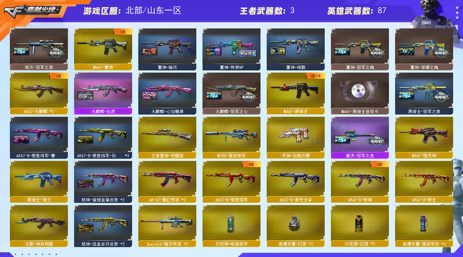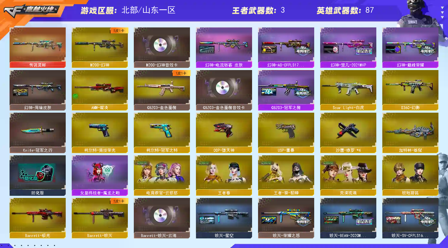 亮点解析 幻神5皮带卡 冠军套 武器齐全 】【传说灵眸 】【m200幻神+幻神音效卡+电流骇客+ag17冠军+宠儿+周瑜+巅峰荣耀 +冠军之特+冠军之刃】【m200竞技荣光套+usp雷暴+四防云悠悠】【王者星神】【g36c幻影】【scar白虎】【qbz金色蔷薇+卡+冠军之薇 】【火麒麟+冠军之心 】【雷神+n9+荣耀之魄+冠军之魄】【黑骑士+卡+冠军之势 】【毁灭+bean+荣耀之怒+冠军之怒 】【极光】【裁决】【堕天神套装/竞技荣光套装】【武器:堕天神 海王 炼狱 】【9手枪:修罗*4 雷暴 堕天神 竞技荣光 冠军之特 】【9刀具:屠龙 擎天 堕天神*3 幻灵之峰 竞技荣光 】;USP-雷暴,柯尔特-冠军之特,Knife-冠军之刃,电竞教官-云悠悠,QBZ03-金色蔷薇,G36C-幻影,M200-幻神,