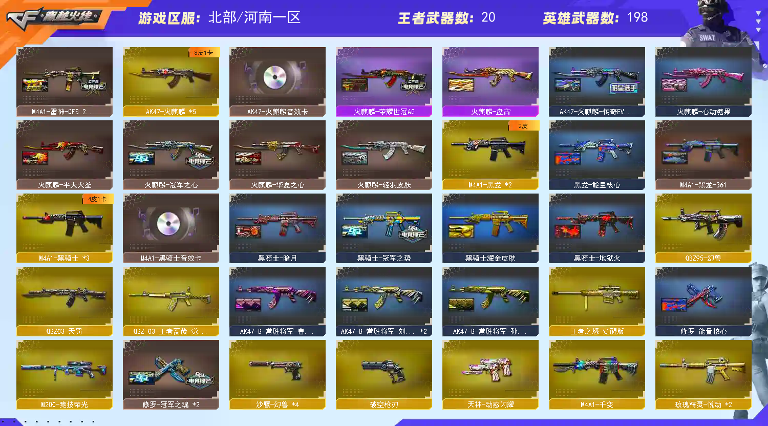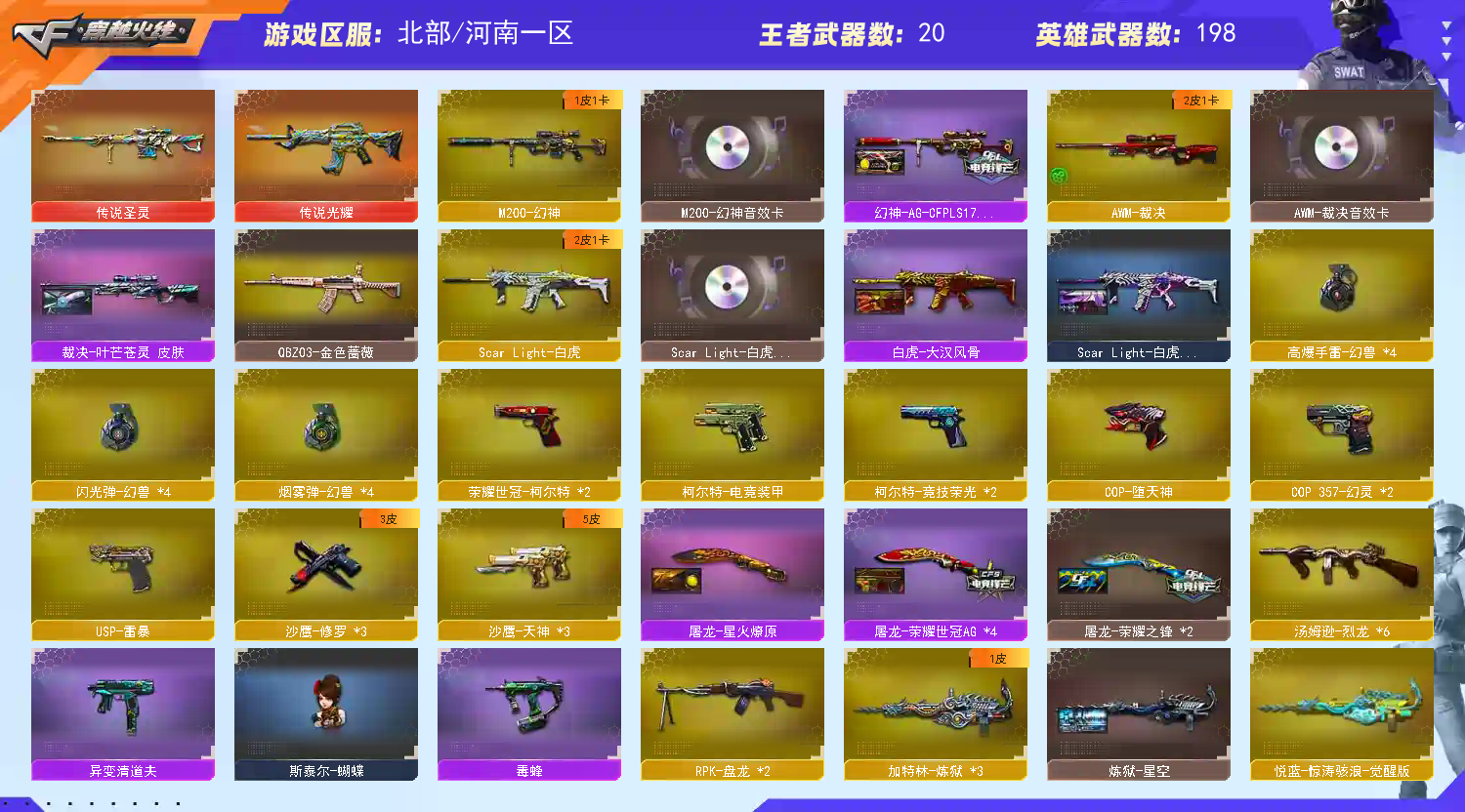 各位老板,上不去号的重启上号器给如有频繁登录,关闭Wegame,重新登录上号器,本账号已经在公安局做了虚以财产登记。若是因为外挂行为导致账号被封。u号zu实ming制的。还有游戏ip登录记录,不管你在哪都能找到你你,最后造成的财产损失,不是你承担就是你家人承担。切勿以身犯法。文明游戏,挂机拉黑 请老板完成对局后再下线.祝老板游戏愉快把把mvp;USP-雷暴,荣耀世冠-柯尔特,电竞教官-云悠悠,RPK-盘龙,QBZ03-金色蔷薇,M200-幻神,Scar Light-白虎,