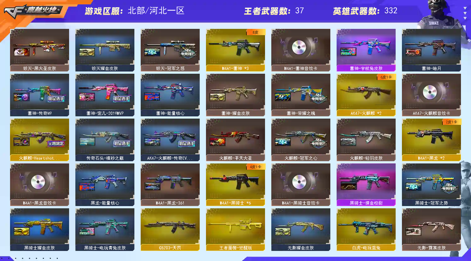 332-传说女帝-传说幽瞳【幻神-幻神宠儿-幻神冠军之幻-幻神女团-幻神欧欧-幻神音效卡-王者幻神】星神-星神音效卡-星神巅峰荣耀 【主武器】 传说光耀-传说暗裔-传说辉光-雷霆-雷暴-青龙-堕天神-朱雀-白虎-夜魔-幻灵-玄武-g36c幻影-qbz金色蔷薇 【狙】 传说幽瞳-毁灭-极光-裁决-幻神-星神-竞技荣光-王者幻神-王者风神 【生化】 6盘龙-6烈龙-蝴蝶-炼狱-毒蜂 【手枪】 传说幽冥-修罗-天神-cop雷霆-usp雷暴-cop堕天神-cop幻灵-柯尔特竞技荣光-荣耀世冠柯尔特-cop白鲨 【刀】 屠龙-龙啸-擎天-麒麟刺-斩神刀雷暴-炽芒蝶刃-荣耀世冠雷神-黄金鲨臂 【角色】 传说女帝-云悠悠-关小雨-沙漠玫瑰-晴雅-王者雨墨-王者岚兮儿-雾萌萌-鹰-影豹-雨棠-隼 【音效卡】 星神音效卡-极光音效卡-黑龙音效卡-雷神音效卡-黑骑士音效卡-白虎音效卡-火麒麟音效卡-毁灭音效卡-裁决音效卡-qbz音效卡 【皮肤】 毁灭星耀-毁灭哈拉少-火麒麟哈拉少-qbz宠儿-流光秘银-星神巅峰荣耀-横秒之点-冠军之势-qbz白鲨-毁灭AG-火麒麟even-毁灭绿豆-雷神宠儿-雷神n9-白虎暗星-冠军之心-雷神白鲨-冠军之怒-荣耀之魄-荣耀之锋;USP-雷暴,荣耀世冠-柯尔特,传说幽冥,柯尔特-冠军之特,炽芒蝶刃,Knife-冠军之刃,沙漠玫瑰,