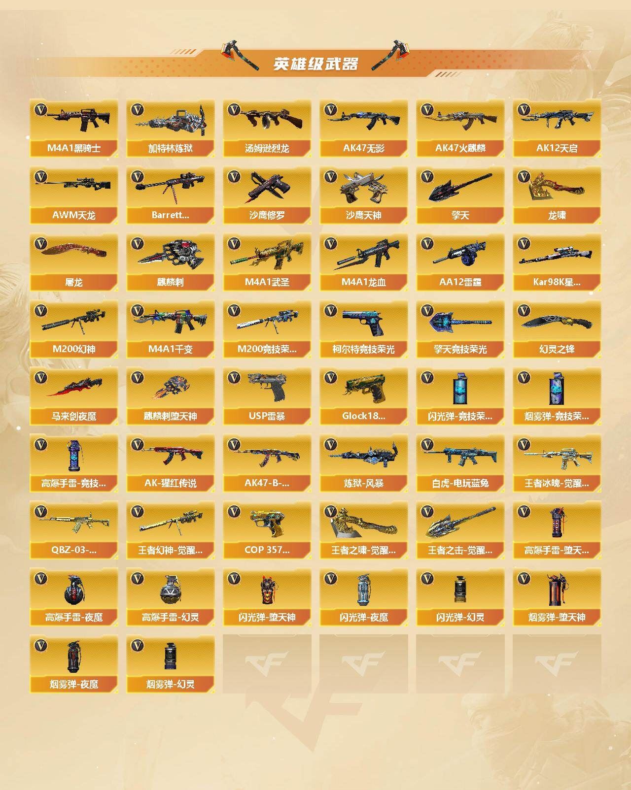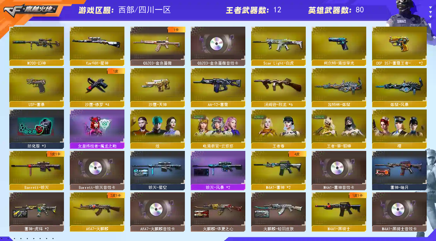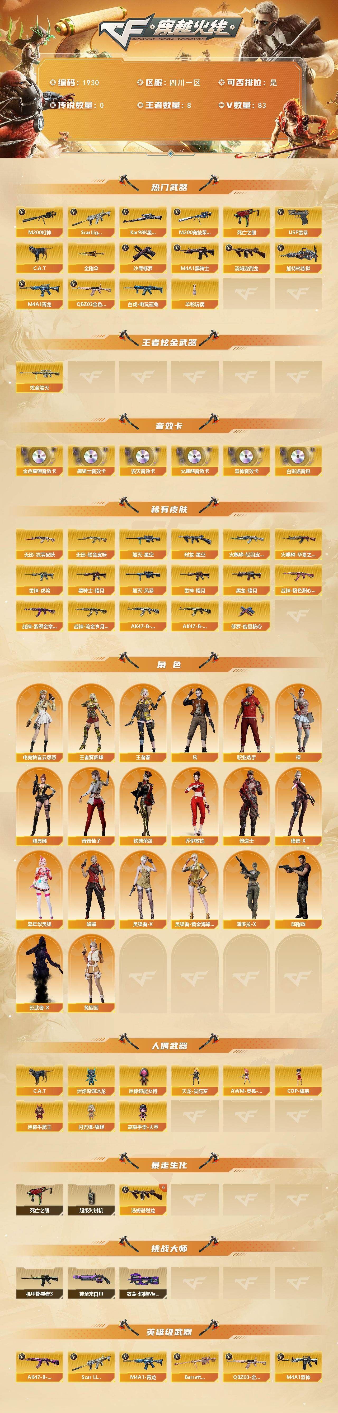 【热门武器】:QBZ03-金色蔷薇,Scar Light-白虎,M4A1-青龙,M200-幻神,M200-竞技荣光,死亡之眼,白虎-电玩蓝兔,Kar98K-星神,C.A.T,M4A1-黑骑士,汤姆逊-烈龙*6,加特林-炼狱,羊驼玩偶,USP-雷暴,沙鹰-修罗*4,金刚伞【王者炫金武器】:炫金毁灭【音效卡】:AK47-火麒麟音效卡,M4A1-雷神音效卡,M4A1-黑骑士音效卡,Barrett-毁灭音效卡,QBZ03-金色蔷薇音效卡,白鲨语音包【皮肤】:烈龙-星空,雷神-暗月,雷神-虎将*2,火麒麟-华夏之心,火麒麟-轻羽皮肤,毁灭-星空,毁灭-风暴*2,黑龙-暗月,黑骑士-暗月,无影耀金皮肤,无影-霓裳皮肤,战神-粉色甜心皮肤*2,战神-紫绶金章皮肤*2,战神-流金岁月皮肤,AK47-B-常胜将军-刘备,AK47-B-常胜将军-孙权,修罗-能量核心【角色】:樱,炫,电竞教官-云悠悠,王者-葵-貂蝉,王者春,乔伊教练,修道士,暗夜-X,嘉年华灵狐,娟娟,灵狐者-X,灵狐者-黄金海岸,潘多拉-X,邱刚敖,青霞仙子,铁骑荣耀,兔囡囡,影武者-X,职业选手,雅典娜【人偶武器】:天龙-曼陀罗,AWM-灵狐-15周年嘉年华,COP-旗袍,C.A.T,迷你深渊冰龙,迷你牛魔王,闪光弹-貂蝉,高爆手雷-大乔,迷你超能女侍【暴走生化】:死亡之眼,超级对讲机【挑战大师】:致命乱世-超越Max,机甲撕裂者III,神圣爆裂者-末日III【英雄级武器】:M4A1-千变,AK47-火麒麟,M4A1-雷神*2,M4A1-黑骑士,AK47-无影,AK12-天启,M4A1-武圣,M4A1-龙血,M4A1-青龙,Scar Light-白虎,QBZ03-金色蔷薇,AK-47-猩红传说*3,AK47-B-战神,王者冰魄-觉醒版,AK47-B-常胜将军,QBZ-03-王者蔷薇-觉醒版,白虎-电玩蓝兔,AWM-天龙,Barrett-毁灭,M200-幻神,Kar98K-星神,M200-竞技荣光,Barrett-金色蔷薇,王者幻神-觉醒版,加特林-炼狱,炼狱-风暴,汤姆逊-烈龙*6,AA-12-雷霆,沙鹰-修罗*4,沙鹰-天神,USP-雷暴,COP 357-雷霆王者-觉醒版*2,柯尔特-竞技荣光,Glock18-武圣,屠龙*4,龙啸,麒麟刺-堕天神,马来剑-夜魔,擎天*2,麒麟刺,幻灵之锋,擎天-竞技荣光,王者之啸-觉醒版,王者之击-觉醒版,高爆手雷-堕天神,高爆手雷-夜魔,高爆手雷-幻灵*3,高爆手雷-竞技荣光*2,闪光弹-堕天神,闪光弹-夜魔,闪光弹-幻灵,闪光弹-竞技荣光*4,烟雾弹-堕天神,烟雾弹-夜魔,烟雾弹-幻灵*2,烟雾弹-竞技荣光*3【道具】:云山科技背包,冰冰背包-猛男专用,女皇终结者-背包,战舰背包,炫彩背包,背包-洛丽塔,超级背包*2,女皇终结者-魔龙之吻,绿色巨人,灵魂忍者,变异宝贝,迷雾幽灵,夺命之镰,防化服*3,枪王排位29赛季金色流光,电玩兔兔表情,防弹头盔*3,防弹衣*3,C4工具钳*3,手雷包*6【特殊枪械】:1白虎,1黑骑士,6烈龙,1炼狱】;USP-雷暴,电竞教官-云悠悠,QBZ03-金色蔷薇,M200-幻神,Scar Light-白虎,Kar98K-星神,