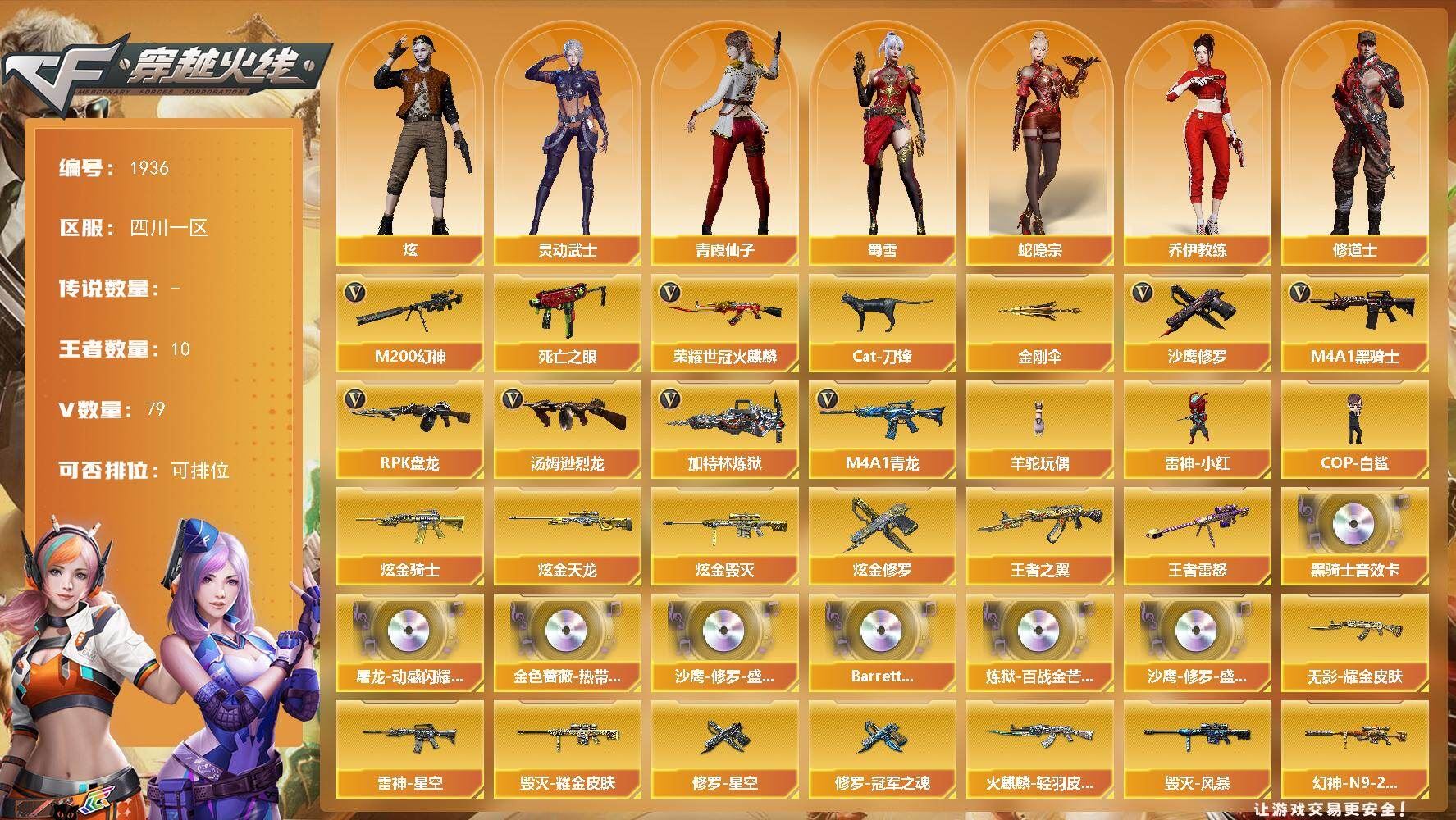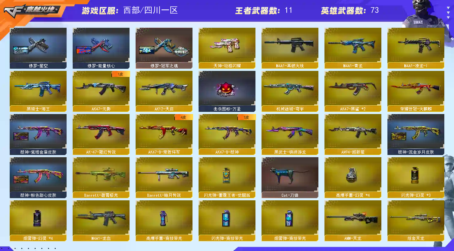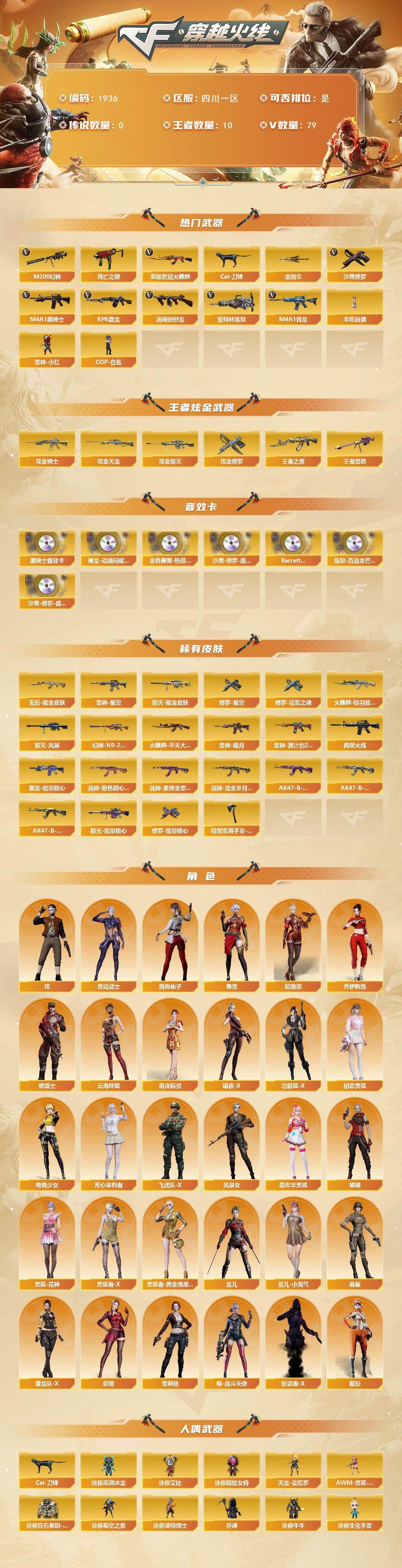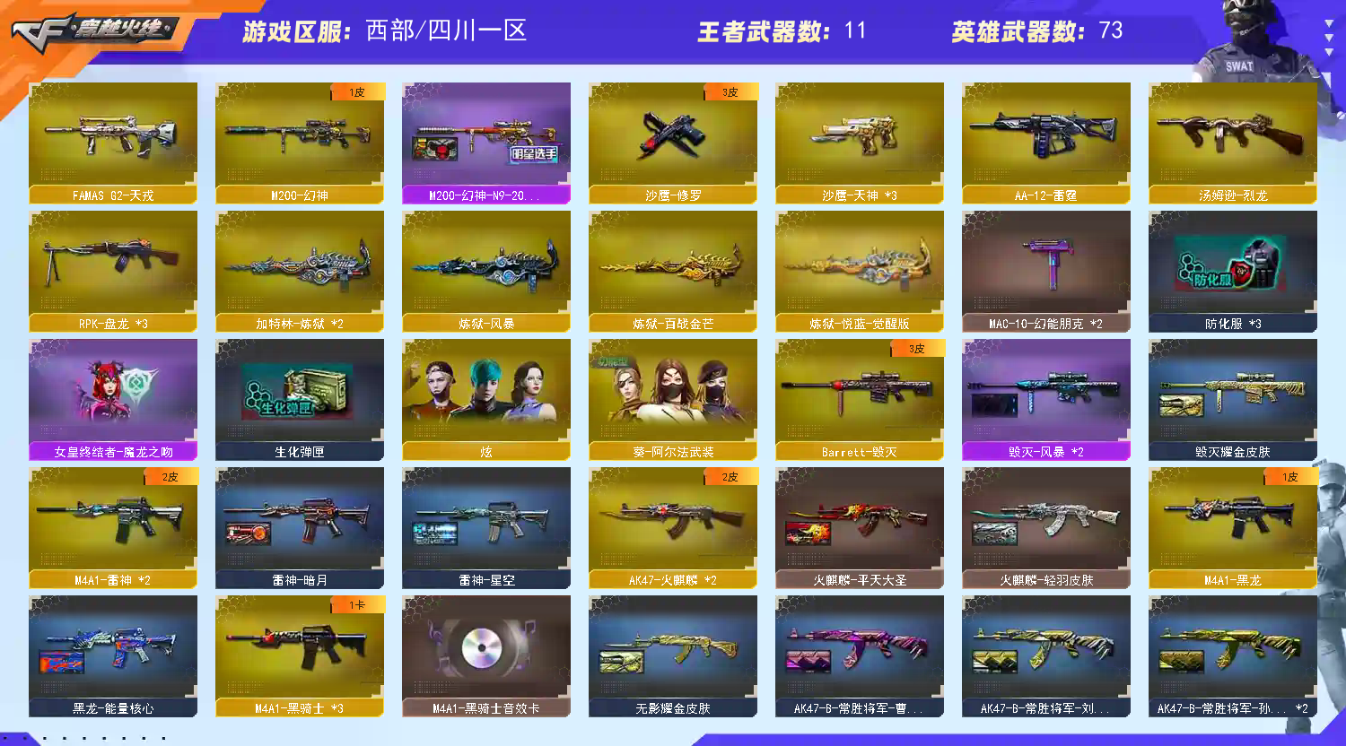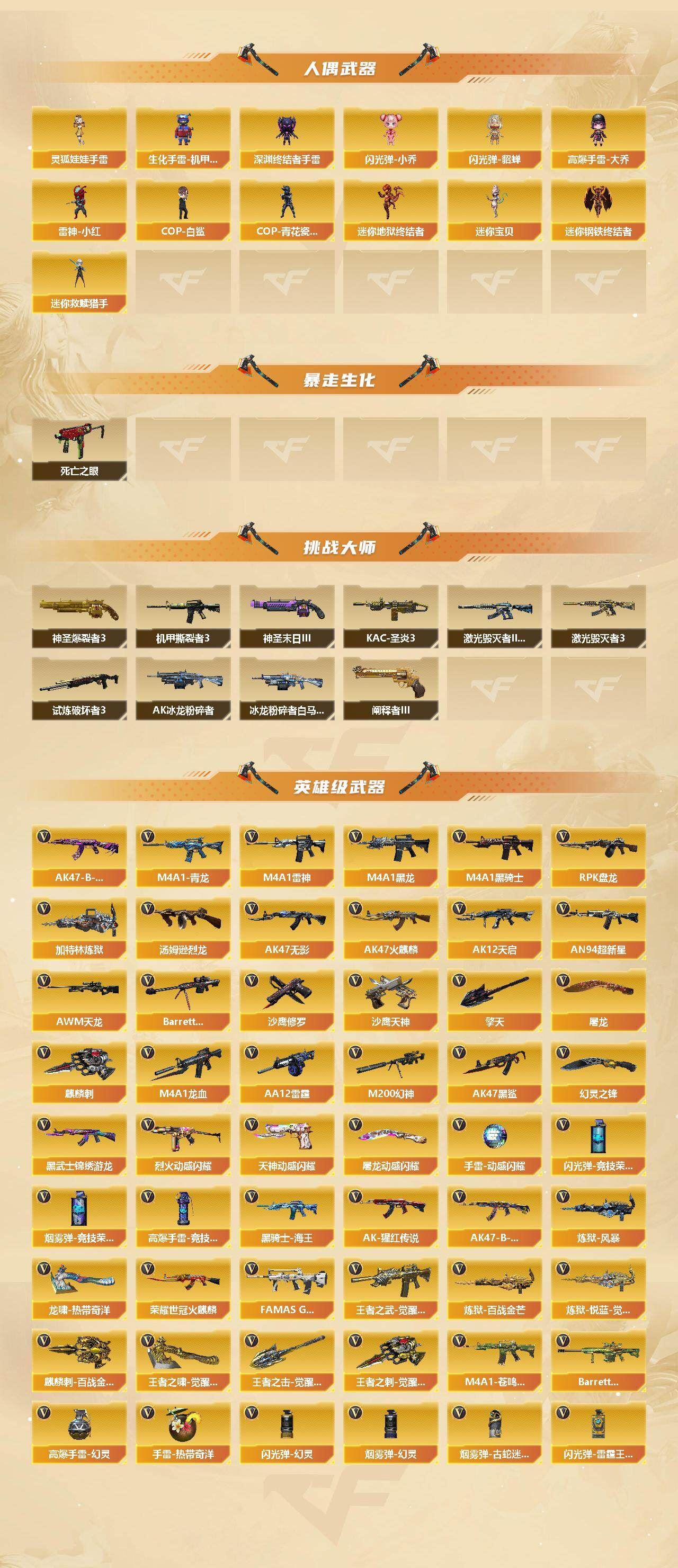 【热门武器】:M4A1-青龙,M200-幻神,死亡之眼,荣耀世冠-火麒麟,Cat-刀锋,M4A1-黑骑士*3,汤姆逊-烈龙,RPK-盘龙*3,加特林-炼狱*2,羊驼玩偶,雷神-小红,COP-白鲨,沙鹰-修罗,金刚伞【王者炫金武器】:王者之翼,王者雷怒,炫金骑士,炫金毁灭,炫金天龙,炫金修罗【音效卡】:屠龙-动感闪耀 音效卡,QBZ03-金色蔷薇-热带奇洋音效卡,M4A1-黑骑士音效卡,沙鹰-修罗-盛典舞曲音效卡*2,Barrett-碧霄极光音效卡,炼狱-百战金芒-庆典舞曲音效卡【皮肤】:M200-幻神-N9-2022MVP,雷神-暗月,雷神-星空,雷神-源计划2.0专属 皮肤,M4A1-再燃火线,火麒麟-轻羽皮肤,火麒麟-平天大圣,毁灭耀金皮肤,毁灭-风暴*2,黑龙-能量核心,无影耀金皮肤,战神-粉色甜心皮肤,战神-紫绶金章皮肤,战神-流金岁月皮肤,AK47-B-常胜将军-曹操,AK47-B-常胜将军-刘备,AK47-B-常胜将军-孙权*2,极光-能量核心,修罗-能量核心,修罗-星空,修罗-冠军之魂,轻型军用手斧-再燃火线【角色】:炫,蛇隐宗,奇洋探员,乔伊教练,修道士,云海玲珑,暗夜-X,北极狐-X,初恋灵狐,电竞少女,芳心审判者,飞虎队-X,风暴女,嘉年华灵狐,娟娟,灵动武士,灵狐-花神,灵狐者-X,灵狐者-黄金海岸,龙儿,龙儿-小淘气,麻雀,潜龙队-X,青霞仙子,蛇姬,蜀雪,雪莉杨,樱-战斗天使,影武者-X,智影【人偶武器】:雷神-小红,COP-白鲨,天龙-曼陀罗,迷你宝贝*2,迷你钢铁终结者,迷你救赎猎手,迷你地狱终结者,AWM-灵狐-15周年嘉年华,Cat-刀锋,迷你深渊冰龙,迷你裂空之翼,迷你波特博士,夺魂,迷你牛牛,迷你生化手雷,生化手雷-机甲核心,深渊终结者手雷,闪光弹-小乔,闪光弹-貂蝉,高爆手雷-大乔,COP-青花瓷-斯沃特精英,迷你艾比,迷你超能女侍,迷你巨石泰坦-魔花研究所,灵狐娃娃手雷【暴走生化】:死亡之眼【挑战大师】:神圣爆裂者III,AK47-冰龙粉碎者,冰龙粉碎者-白马银枪*2,激光毁灭者III-白马银枪*2,激光毁灭者III,机甲撕裂者III,试炼破坏者III,KAC-圣炎切割者III,神圣爆裂者-末日III,阐释者III【英雄级武器】:AK47-火麒麟*2,M4A1-黑龙,M4A1-雷神*2,M4A1-黑骑士*3,AK47-无影,AK12-天启,AN94-超新星,AK47-黑鲨*2,M4A1-龙血,M4A1-青龙,黑武士-锦绣游龙,FAMAS G2-天戎,烈火-动感闪耀,王者之武-觉醒版,AK-47-猩红传说,AK47-B-战神,黑骑士-海王,AK47-B-常胜将军,荣耀世冠-火麒麟,AWM-天龙,Barrett-毁灭,M200-幻神,RPK-盘龙*3,加特林-炼狱*2,炼狱-百战金芒,炼狱-风暴,炼狱-悦蓝-觉醒版,汤姆逊-烈龙,AA-12-雷霆,沙鹰-修罗,沙鹰-天神*3,天神-动感闪耀,屠龙,擎天,麒麟刺,幻灵之锋*2,屠龙-动感闪耀,龙啸-热带奇洋,麒麟刺-百战金芒,王者之啸-觉醒版*2,王者之击-觉醒版,王者之刺-觉醒版,高爆手雷-幻灵*4,高爆手雷-竞技荣光,手雷-动感闪耀,手雷-热带奇洋,闪光弹-幻灵*3,闪光弹-竞技荣光,闪光弹-雷霆王者-觉醒版,烟雾弹-幻灵*4,烟雾弹-竞技荣光,烟雾弹-古蛇迷踪,M4A1-苍鸣雷神,Barrett-碧霄极光【道具】:BS战队炫彩背包,CFS限定背包,冰冰背包,奇洋探员-海龟背包,女皇终结者-背包,炫彩背包,百战金芒炫彩背包,超级背包*2,女皇终结者-魔龙之吻,黄金生化钩,绿色巨人,灵魂忍者,变异宝贝,迷雾幽灵*2,生化弹匣,夺命之镰,防化服*3,金色流光-枪王排位*2,星辰流光-枪王排位,巅峰赛先锋-金色流光,流光-鎏金之域,枪王排位28赛季金色流光,枪王排位29赛季金色流光,语音特效-盛典烟火,萌萌小葵表情,电玩兔兔表情,热带奇洋表情,动感闪耀表情,C4-沙漠,防弹头盔*4,防弹衣*5,C4工具钳*5,手雷包*5【特殊枪械】:3黑骑士,1烈龙,3盘龙,2炼狱,;RPK-盘龙,M200-幻神,