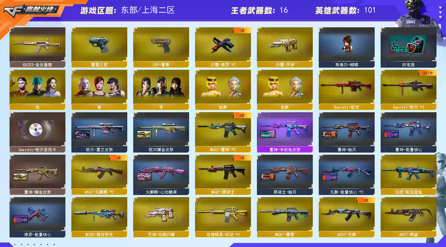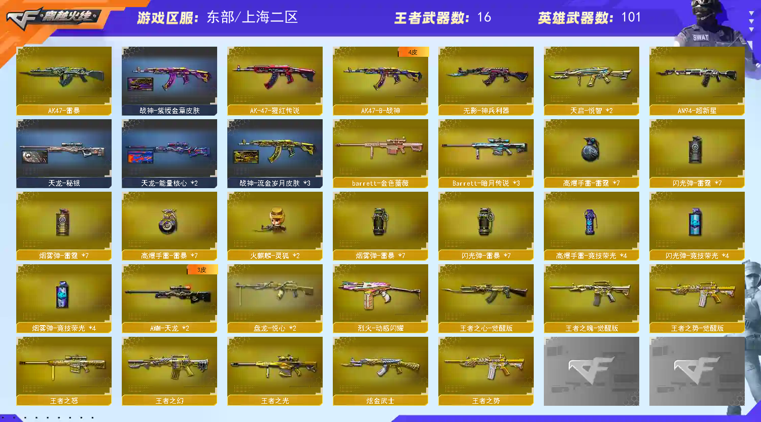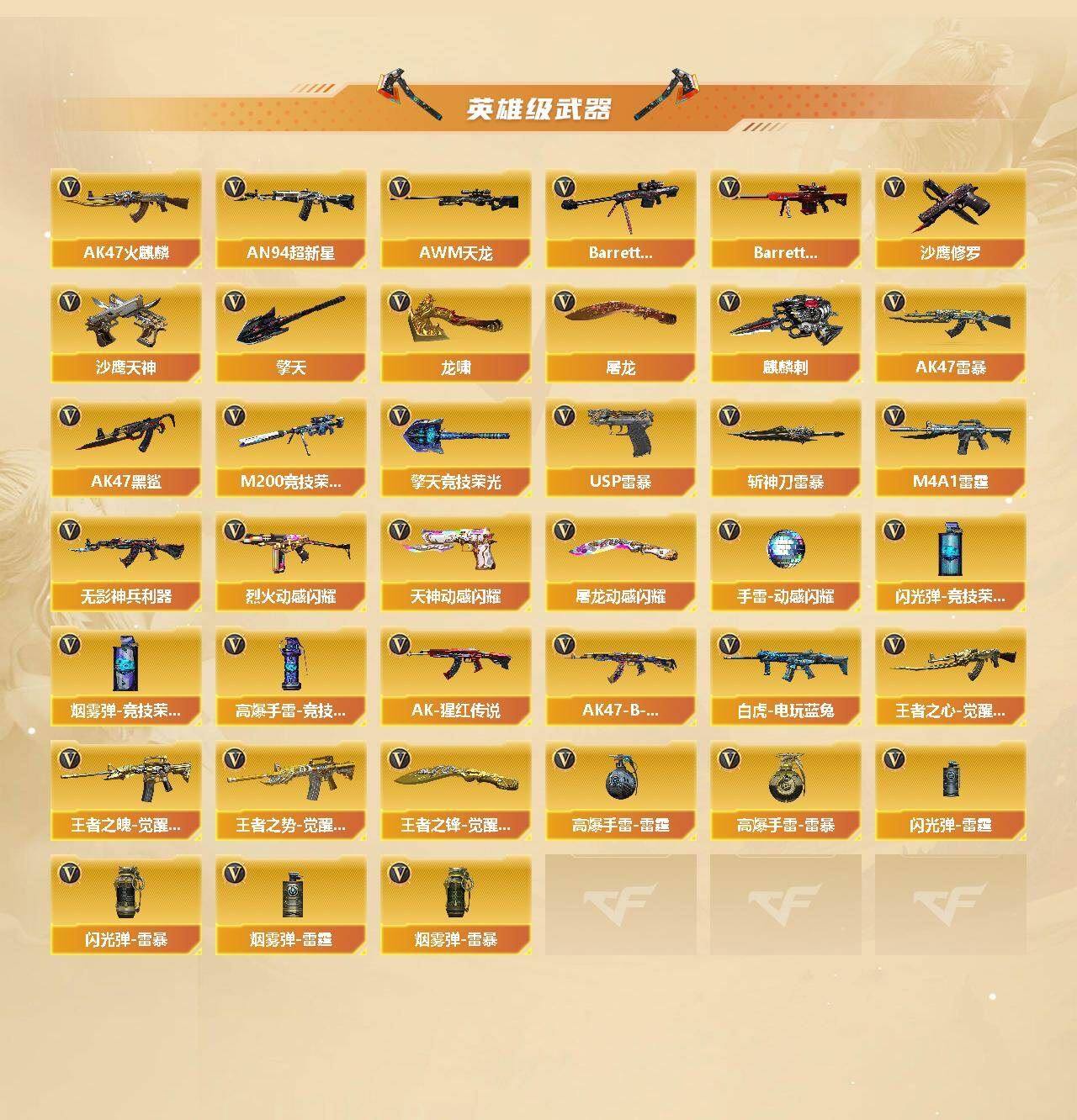 【热门武器】:QBZ03-金色蔷薇,M200-竞技荣光,死亡之眼,白虎-电玩蓝兔,M4A1-黑骑士,斯泰尔-蝴蝶,USP-雷暴,沙鹰-修罗*2【王者炫金武器】:天启-悦智*2,王者之幻,王者之势,玫瑰精灵-悦动*3,王者之光,王者之怒,盘龙-悦心*2,炫金武士【音效卡】:Barrett-毁灭音效卡【皮肤】:雷神-暗月,雷神-能量核心,雷神-耀金皮肤,雷神-宇航兔皮肤,火麒麟-心动糖果,毁灭耀金皮肤,黑龙-能量核心,黑骑士-暗月,无影-能量核心*2,AK47-黑武士-361,战神-紫绶金章皮肤,战神-流金岁月皮肤*3,天龙-秘银,天龙-能量核心*2,修罗-能量核心【角色】:零,炫,春,狐影,乔伊教练,空,芳心审判者,风暴女,虎妞,嘉年华灵狐,娟娟,灵狐者-X,灵狐者-黄金海岸,潘多拉-X,斯沃特-X,铁骑荣耀,影武者-X【人偶武器】:火麒麟-灵狐*2,斯泰尔-蝴蝶,AWM-灵狐-15周年嘉年华,COP-旗袍,迷你裂空之翼*2,迷你波特博士,迷你火种,迷你超能女侍【暴走生化】:黑龙吞噬者,死亡之眼,超级对讲机【挑战大师】:神圣爆裂者III,冰龙粉碎者-白马银枪*2,VEPR-12-金魔,激光毁灭者III,机甲撕裂者III,阐释者III*2【英雄级武器】:AK47-火麒麟*2,M4A1-雷神*3,M4A1-黑骑士,AK47-无影,AN94-超新星,AK47-黑鲨,M4A1-雷霆,AK47-雷暴,无影-神兵利器,QBZ03-金色蔷薇,烈火-动感闪耀,王者之心-觉醒版,王者之魄-觉醒版,王者之势-觉醒版,AK-47-猩红传说,AK47-B-战神,白虎-电玩蓝兔,AWM-天龙*2,Barrett-毁灭*3,Barrett-极光,M200-竞技荣光,Barrett-金色蔷薇,沙鹰-修罗*2,沙鹰-天神,USP-雷暴,COP-雷霆,天神-动感闪耀,屠龙*2,龙啸*2,擎天*2,麒麟刺,擎天-竞技荣光,屠龙-动感闪耀,斩神刀-雷暴,王者之锋-觉醒版,高爆手雷-雷霆*7,高爆手雷-雷暴*7,高爆手雷-竞技荣光*4,手雷-动感闪耀,闪光弹-雷霆*7,闪光弹-雷暴*7,闪光弹-竞技荣光*4,烟雾弹-雷霆*7,烟雾弹-雷暴*7,烟雾弹-竞技荣光*4【道具】:炫彩背包,虎牙炫彩背包,黄金超能特工背包,哔哩哔哩名片,夺命之镰,防化服,金色流光-枪王排位,电玩兔兔表情,动感闪耀表情,EP战队名片,防弹头盔,防弹衣,C4工具钳,手雷包【特殊枪械】:1黑骑士,1蝴蝶斯泰尔【稀有套装】:雷暴套,雷霆套;USP-雷暴,QBZ03-金色蔷薇,