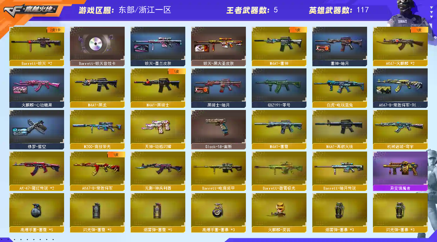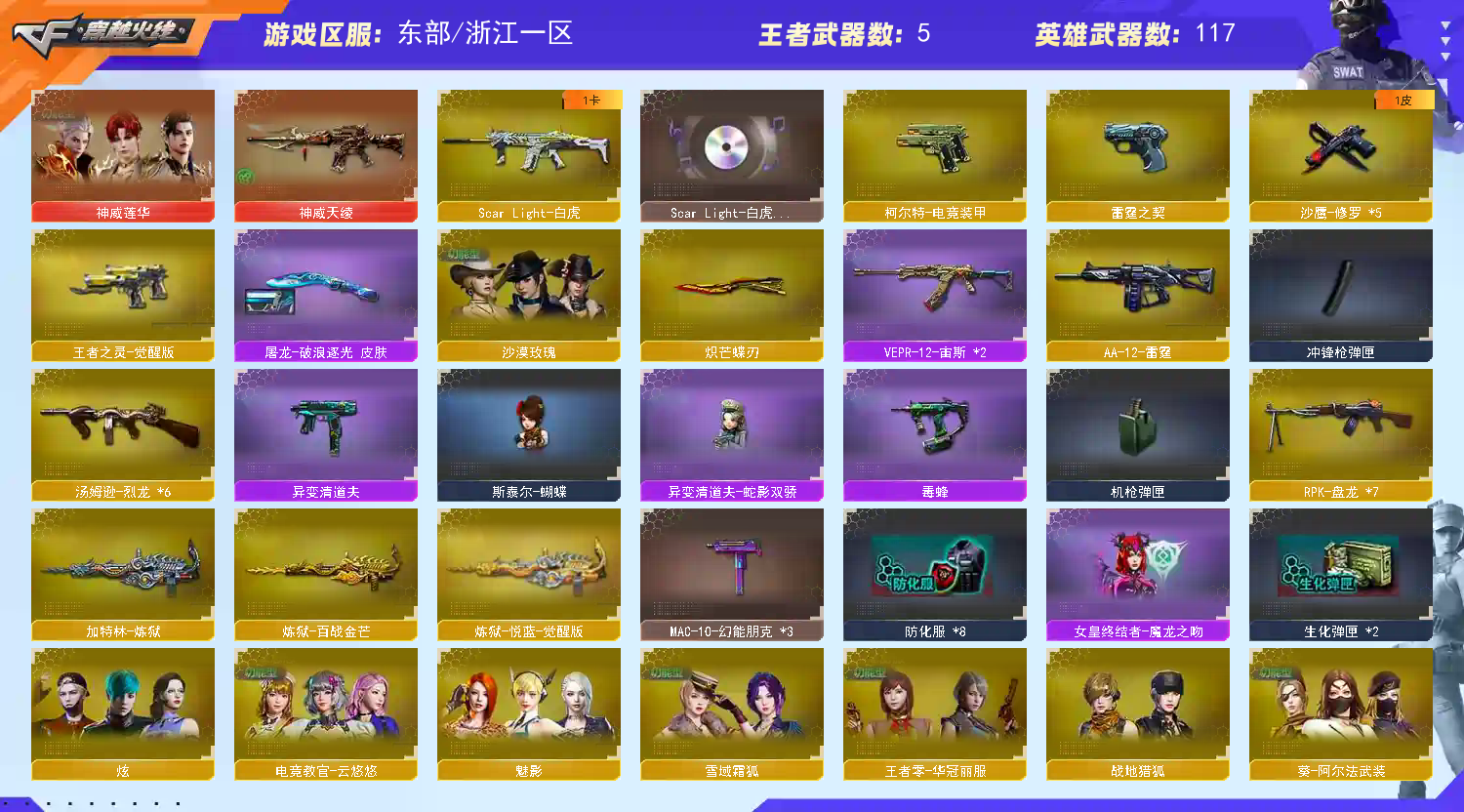 首页 > 租号大厅 > 穿越火线 > 电信区/浙江一区 > 117v❤️神威莲华+天绫❤️6烈龙斯泰尔蝴蝶+宙斯+清道夫小人枪❤️白虎三件套❤️6盘龙炼狱套装