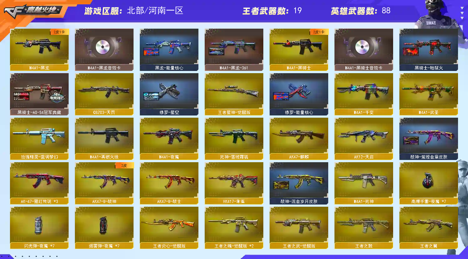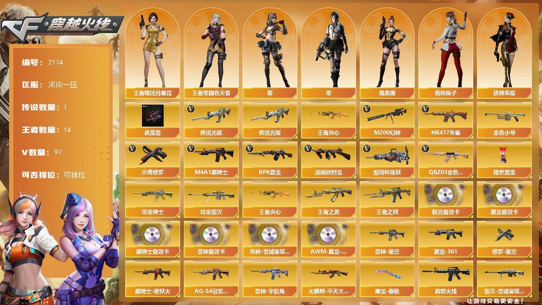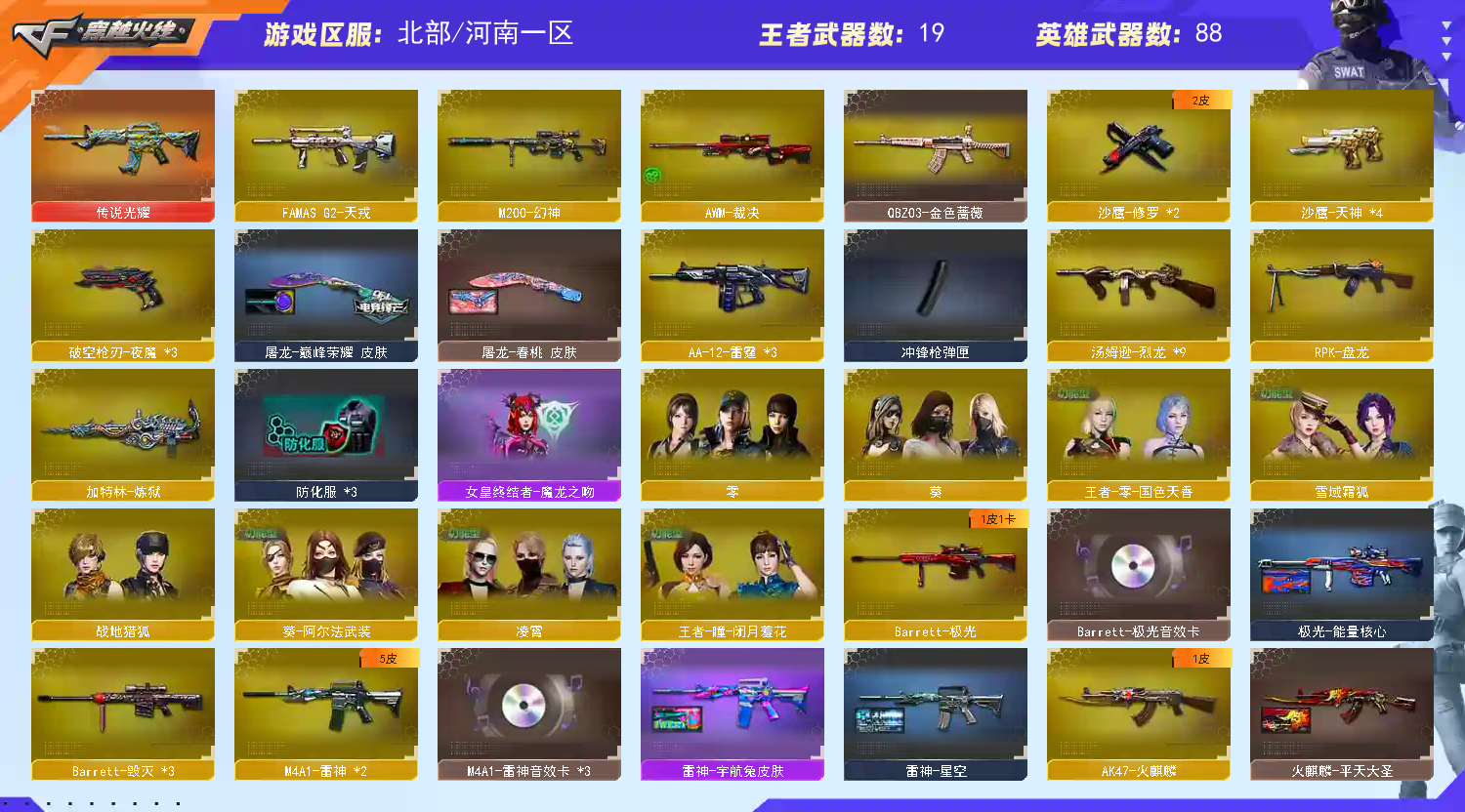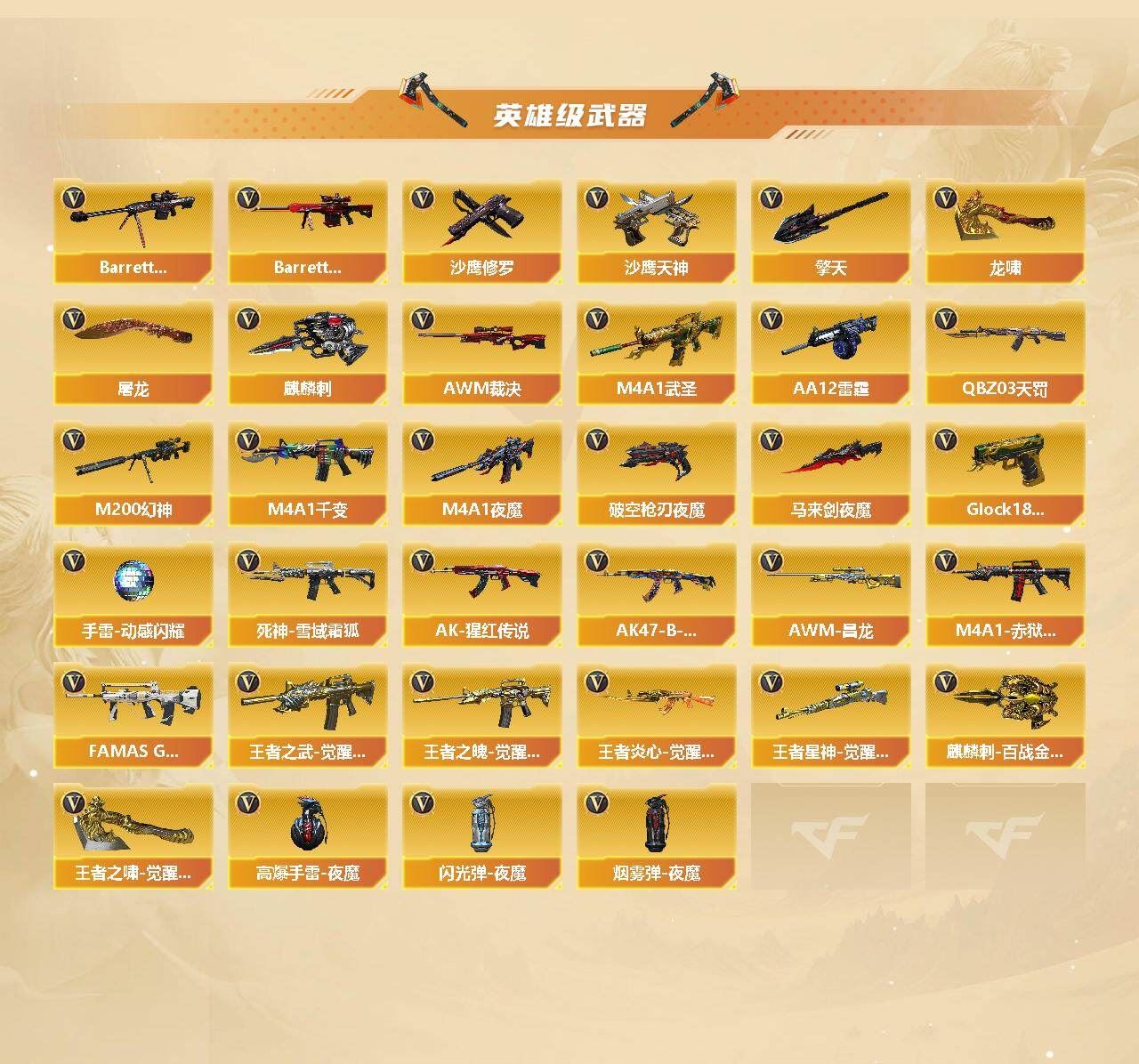 【传说武器】:传说光耀【热门武器】:传说光耀,QBZ03-金色蔷薇,HK417-朱雀,M200-幻神,王者炎心*3,金色小号,M4A1-黑骑士,汤姆逊-烈龙*9,RPK-盘龙,加特林-炼狱,降世魔童,沙鹰-修罗*2【王者炫金武器】:王者炎心*3,王者之戮,王者之翼,炫金骑士,炫金毁灭【音效卡】:M4A1-雷神音效卡*3,M4A1-黑龙音效卡,M4A1-黑骑士音效卡,Barrett-极光音效卡,死神-雪域霜狐-怀旧音效卡,AWM-昌龙-怀旧音效卡【皮肤】:雷神-星空,雷神-宇航兔皮肤,M4A1-再燃火线,火麒麟-平天大圣,毁灭-雪域霜狐 皮肤,毁灭-英雄计划 皮肤,黑龙-能量核心,M4A1-黑龙-361,黑骑士-地狱火,黑骑士-AG-S4冠军典藏,战神-紫绶金章皮肤,战神-流金岁月皮肤,极光-能量核心,修罗-能量核心,修罗-星空,屠龙-春桃 皮肤,屠龙-巅峰荣耀 皮肤,轻型军用手斧-再燃火线【角色】:零,葵,凌霄,战地猎狐,王者-瞳-闭月羞花,王者-零-国色天香,雪域霜狐,暗夜-X,芳心审判者,风暴女,兰-新年限定,潘多拉-甜心教官,潜龙队-X,青霞仙子,铁骑荣耀,雪莉杨,雅典娜【人偶武器】:生化手雷-机甲核心*2,闪光弹-小乔,降世魔童【挑战大师】:神圣爆裂者III*2,VEPR-12-金魔,神圣爆裂者-末日III【英雄级武器】:M4A1-千变,AK47-火麒麟,AK47-麒麟,M4A1-黑龙,M4A1-雷神*2,M4A1-黑骑士,M4A1-死神,AK12-天启,M4A1-武圣,HK417-朱雀,M4A1-夜魔,QBZ03-天罚,FAMAS G2-天戎,死神-雪域霜狐,QBZ03-金色蔷薇,王者之武-觉醒版,王者之魄-觉醒版*2,AK-47-猩红传说*3,AK47-B-战神,王者炎心-觉醒版,Barrett-毁灭*3,Barrett-极光,AWM-裁决,M200-幻神,王者星神-觉醒版,RPK-盘龙,加特林-炼狱,汤姆逊-烈龙*9,AA-12-雷霆*3,沙鹰-修罗*2,沙鹰-天神*4,破空枪刃-夜魔*3,Glock18-武圣,屠龙,龙啸,马来剑-夜魔,擎天,麒麟刺,麒麟刺-百战金芒,王者之啸-觉醒版*4,高爆手雷-夜魔*7,手雷-动感闪耀,闪光弹-夜魔*7,烟雾弹-夜魔*7,M4A1-赤狱骑士,AWM-昌龙【道具】:云山科技背包,冰冰背包-猛男专用,炫彩背包,百战金芒炫彩背包,背包-洛丽塔,超级背包,雪域霜狐炫彩背包,女皇终结者-魔龙之吻,救世主-黑桃战神,黄金生化钩,绿色巨人,灵魂忍者,迷雾幽灵*2,夺命之镰,防化服*3,星辰流光-枪王排位,流光-鎏金之域,枪王排位29赛季金色流光,语音特效-怀旧,雪域霜狐表情,萌萌小葵表情,EP战队名片,C4-红龙,防弹头盔*6,防弹衣*7,C4工具钳*5,手雷包*4【特殊枪械】:1黑骑士,6烈龙,1盘龙,1炼狱【稀有套装】:夜魔套,;RPK-盘龙,QBZ03-金色蔷薇,M200-幻神,