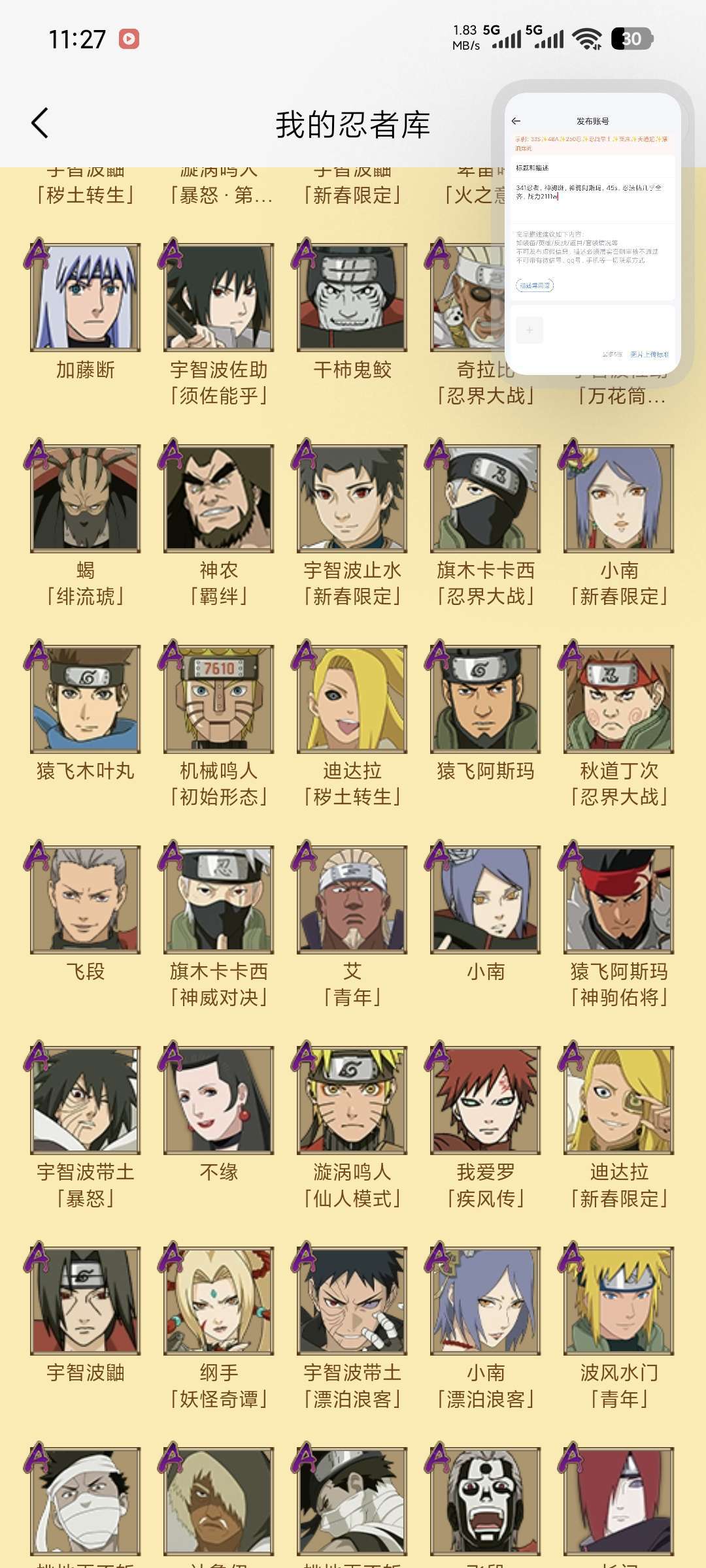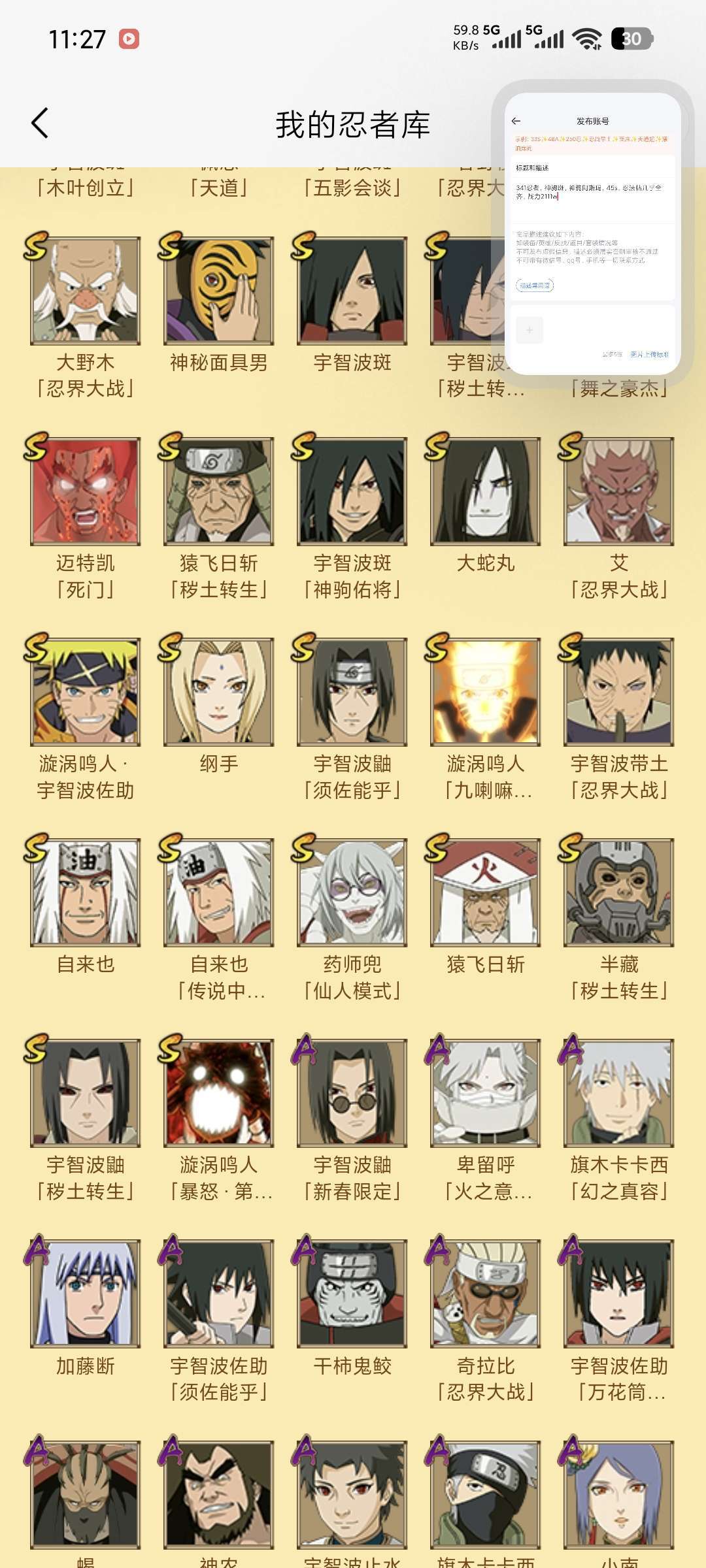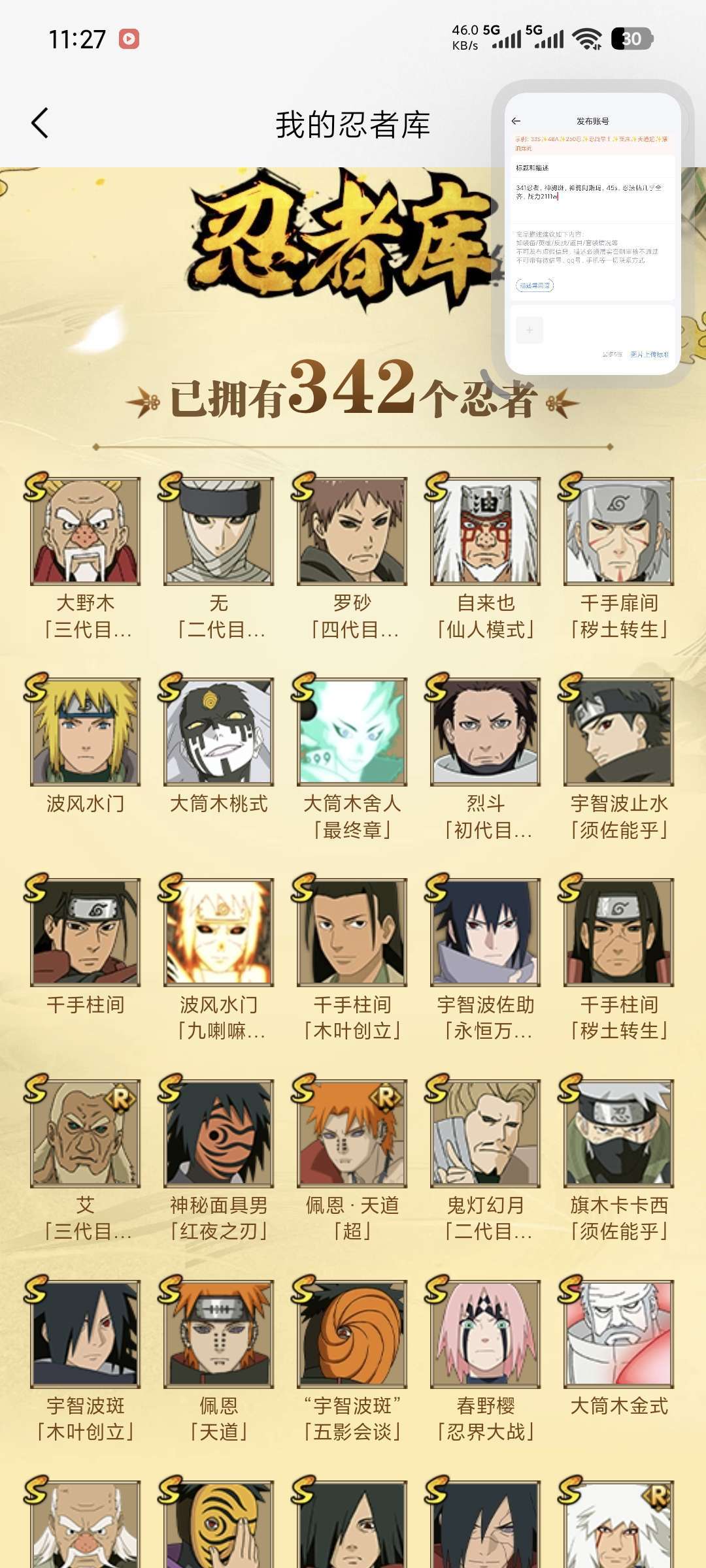 341忍者,神驹斑,神驹阿斯玛,45s,忍法帖几乎全齐,高招从秽土斑后门都有,前面的补了不少,战力2111w