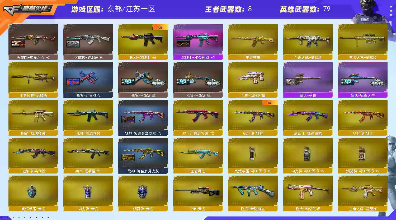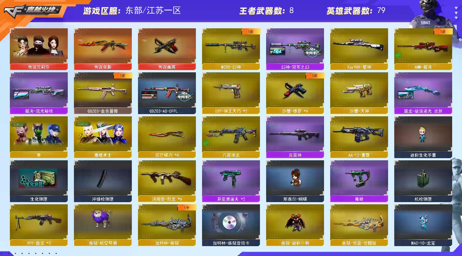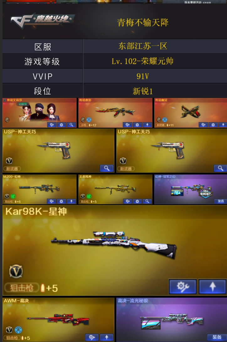 商品标题】:东部江苏一区-91V-可二次实名-【Lv.102-荣耀元帅】-【段位:新锐1】 【稀有武器】:传说夜影/传说幽冥/M200-幻神/Kar98K-星神/八面凌龙/USP-神工天巧(2)/天神-动感闪耀/修罗-古蛇迷踪/QBZ03-金色蔷薇/AK47-火麒麟(2)/M4A1-雷神/M4A1-黑骑士(6)/Barrett-毁灭/AWM-裁决/RPK-盘龙(3)/加特林-炼狱/汤姆逊-烈龙(6)/AA-12-雷霆/炽芒蝶刃(4)/唐刀-神工天巧/云龙扇 【王者武器】:白虎之魄-觉醒版/王者之怒-觉醒版/王者风神-觉醒版/王者芳薇 【热门角色】:传说艾莉莎/关小雨/晴雅/隐/雨墨/岚兮儿/隼/奇洋探员/乔伊教练/蛇隐宗/王者沙漠玫瑰/炽天使/女主播/兔囡囡 【热门音效卡】:加特林-炼狱音效卡/M4A1-雷神音效卡/AK47-火麒麟音效卡 【热门皮肤】:幻神-冠军之幻/M4A1-雷神-巅峰荣耀皮肤/擎天-冠军之击/屠龙-破浪逐光皮肤/裁决-流光秘银/火麒麟-大唐荣光/毁灭-直播专属/QBZ03-AG-CFPLS19冠军/雷神-传奇N9/雷神-冠军之魄/龙啸-冠军之啸 【其他亮点】:斯泰尔-蝴蝶/炼狱-迷你小钢/毒蜂/异变清道夫(2)/Scar Light-马枪/MAC-10-龙宝/黄金猫猫手套-白鲨 (截图展示段位不代表实际段位,如赛季更新等不可抗拒因素发生变化,其余道具看截图或咨询客服);