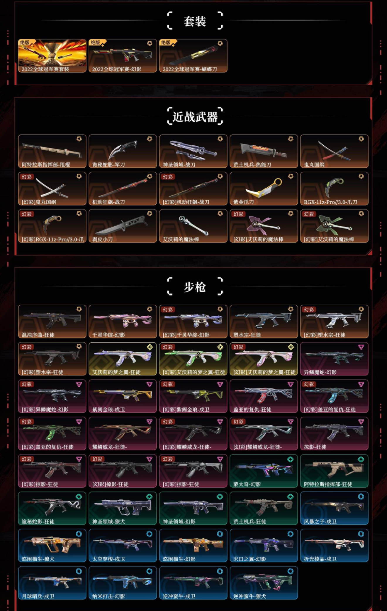 【拥有套装】2022全球冠军赛套装(2022全球冠军赛-幻影,2022全球冠军赛-蝴蝶刀) 【拥有近战武器】阿特拉斯指挥部-甩棍,诡秘蛇影-军刀,神圣领域-战刀,荒土机兵-热能刀,鬼丸国纲,机动狂飙-战刀,紫金爪刀,RGX-11z-Pro//3.0-爪刀,剥皮小刀,艾沃莉的魔法棒, 【拥有步枪】混沌序曲-狂徒,千灵华绽-幻影,塑水宗-狂徒,艾沃莉的梦之翼-狂徒,异鳞魔蛇-幻影,紫阙金琅-戍卫,盖亚的复仇-狂徒,耀鳞威龙-狂徒-,掠影-狂徒,蒙太奇-幻影,阿特拉斯指挥部-狂徒,诡秘蛇影-狂徒,神圣领域-獠犬,神圣领域-幻影,荒土机兵-狂徒,风暴之子-戍卫,悠闲猫生-獠犬,太空穿梭-戍卫,悠闲猫生-幻影,末日之翼-幻影,折光棱晶-戍卫,月球哨兵-戍卫,逆冲蛮牛-戍卫,逆冲蛮牛-獠犬, 【拥有狙击枪】千灵华绽-冥驹,归零者-冥驹,阿特拉斯指挥部-莽侠,诡秘蛇影-莽侠,荒土机兵-冥驹,超集系统-飞将,悠闲猫生-飞将,末日之翼-飞将,星云暗涌-冥驹,月球哨兵-莽侠, 【拥有机枪】神圣领域-战神,太空穿梭-战神,末日之翼-奥丁,神罚-奥丁, 【拥有冲锋枪】塑水宗-骇灵,蒙太奇-骇灵,阿特拉斯指挥部-骇灵,荒土机兵-骇灵,折光棱晶-蜂刺,星云暗涌-骇灵,星云暗涌-蜂刺, 【拥有霰弹枪】千灵华绽-判官,诡秘蛇影-判官,风暴之子-雄鹿,太空穿梭-判官,月球哨兵-雄鹿,逆冲蛮牛-雄鹿 【拥有手枪】千灵华绽-正义,塑水宗-正义,艾沃莉的梦之翼-鬼魅,天界神兵-鬼魅,紫阙金琅-标配,阿特拉斯指挥部-标配,日耀风暴-正义,诡秘蛇影-鬼魅,神圣领域-狂怒,荒土机兵-标配,超限闪存-正义,超集系统-标配,风暴之子-正义,太空穿梭-正义,悠闲猫生-短炮,末日之翼-短炮,折光棱晶-标配,星云暗涌-鬼魅,月球哨兵-正义,逆冲蛮牛-狂怒, 【稀有挂件】V25第三幕黄金挂饰,第九季黄金挂饰,终章猫猫木乃伊挂饰,猫猫木乃伊挂饰,熔岩灯挂饰 【卡面信息】分崩离析卡面,双城之战拥抱卡面,;紫金爪刀,剥皮小刀,盖亚的复仇 狂徒,掠影 狂徒,异鳞魔蛇 幻影,混沌序曲 狂徒,塑水宗 狂徒,