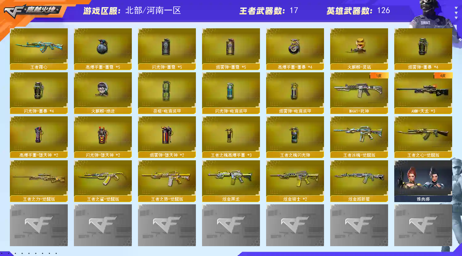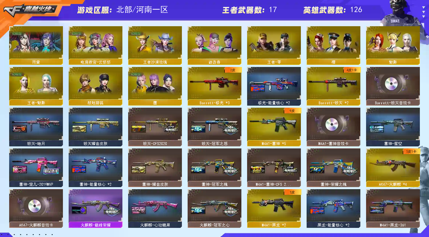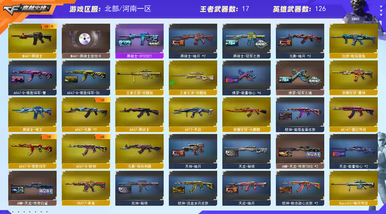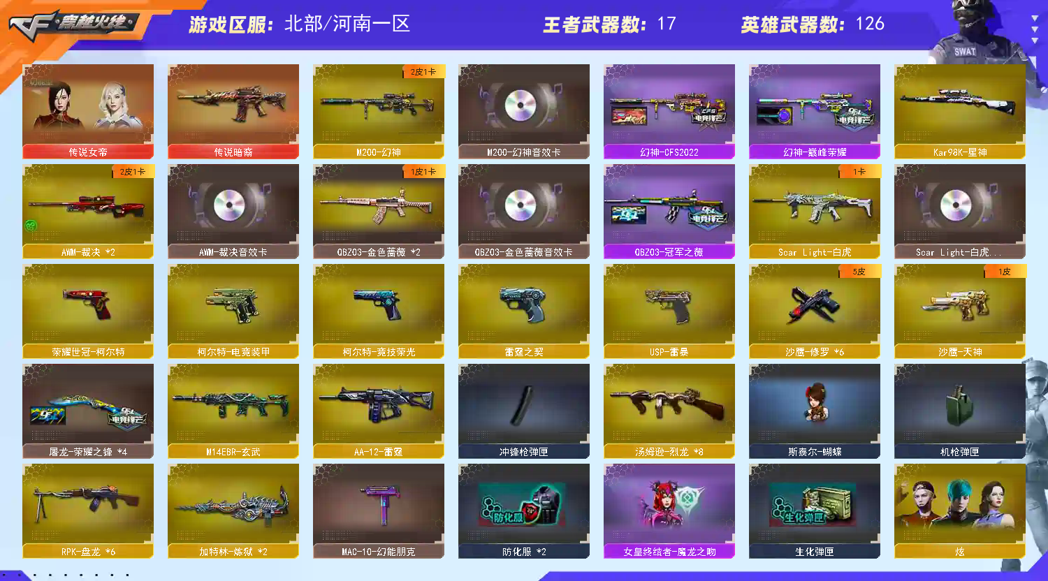 【传说女帝】【M200-幻神+音效卡+幻神-CFS2022+幻神-巅峰荣耀】【Kar98K-星神】【传说暗裔】【ScarLight-白虎+音效卡】【QBZ03-金色蔷薇+音效卡+冠军之武】【生化 6盘龙 2炼狱 6烈龙 蝴蝶 死亡之眼 猫猫手套白鲨】【裁决+音效卡】【Barrett-毁灭+音效卡+毁灭-冠军之怒】【极光】【荣耀世冠套】【AK47-火麒麟+音效卡+火麒麟-冠军之心】【黑龙】【M4A1-雷神+雷神-宠儿+雷神-荣耀之魄+雷神-白鲨14冠军+雷神-冠军之魄】【黑骑士+音效卡+黑骑士-冠军之势】【王者之心 王者之势 王者之鲨 王者冰魄 王者之力 王者之决】【无影 死神 黑武士 天启 hk417-朱雀 玄武】【13手枪 修罗*6 天神 cop雷霆 usp雷暴 荣耀世冠-柯尔特】【16近战 屠龙*5 龙啸*3 擎天 麒麟刺 斩神刀雷暴 王者之锋】【手雷 雷霆雷 雷暴雷 堕天神 电竞装甲】【四防 云悠悠 王者魅影 王者沙漠玫瑰】【幻神音效卡 裁决音效卡 QBZ03-金色蔷薇音效卡 ScarLight-白虎音效卡 M4A1-雷神音效卡】;USP-雷暴,荣耀世冠-柯尔特,传说女帝,电竞教官-云悠悠,王者沙漠玫瑰,RPK-盘龙,QBZ03-金色蔷薇,