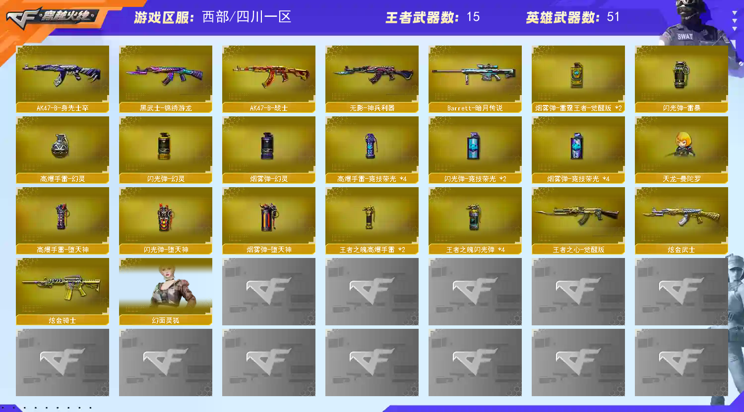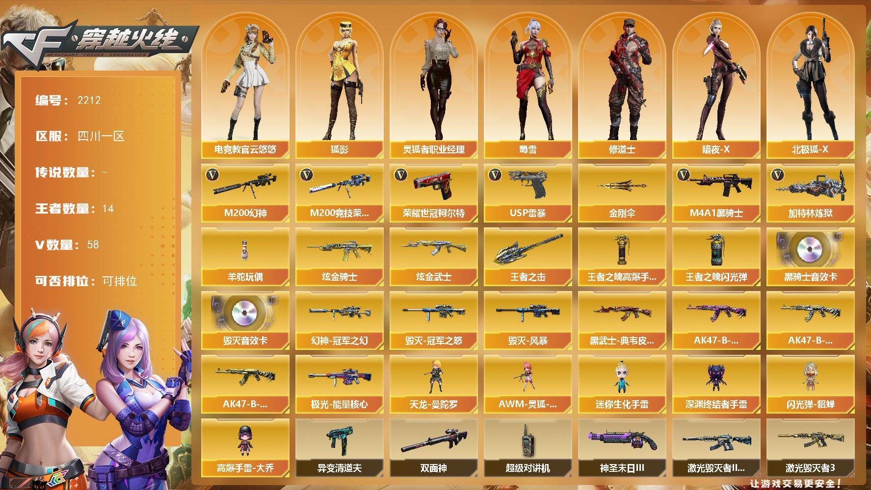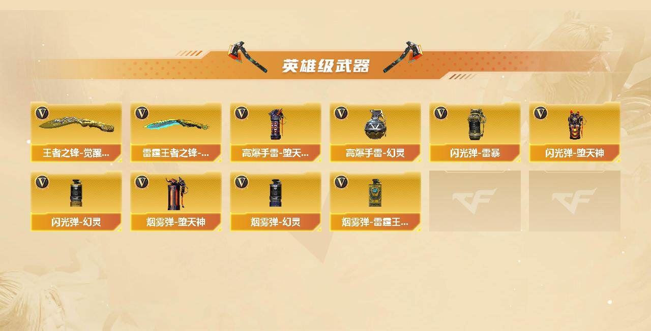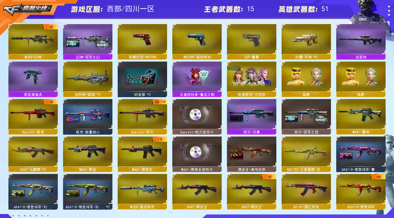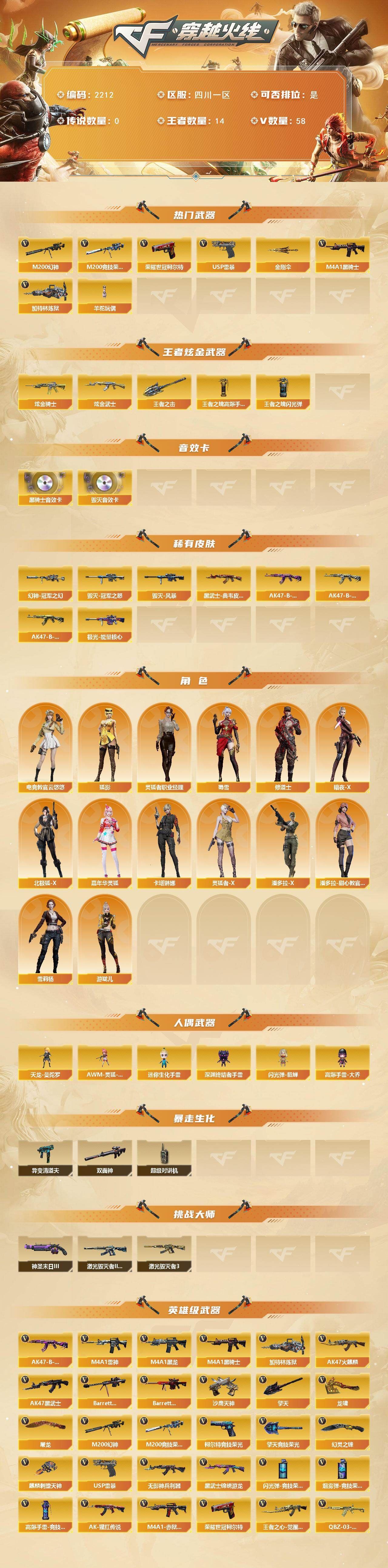 【热门武器】:M200-幻神,M200-竞技荣光,荣耀世冠-柯尔特,M4A1-黑骑士,加特林-炼狱*2,羊驼玩偶,USP-雷暴,金刚伞【王者炫金武器】:王者之击,炫金骑士,炫金武士,王者之魄高爆手雷*2,王者之魄闪光弹*4【音效卡】:M4A1-黑骑士音效卡,Barrett-毁灭音效卡【皮肤】:幻神-冠军之幻,毁灭-冠军之怒,毁灭-风暴,黑武士-典韦皮肤,AK47-B-常胜将军-曹操,AK47-B-常胜将军-刘备,AK47-B-常胜将军-孙权*2,极光-能量核心【角色】:电竞教官-云悠悠,狐影,修道士,暗夜-X,北极狐-X,嘉年华灵狐,卡塔琳娜,灵狐者-X,灵狐者-职业经理,潘多拉-X,潘多拉-甜心教官,蜀雪,雪莉杨,游珑儿【人偶武器】:天龙-曼陀罗,AWM-灵狐-15周年嘉年华,迷你生化手雷,深渊终结者手雷,闪光弹-貂蝉,高爆手雷-大乔【暴走生化】:异变清道夫,双面神,超级对讲机【挑战大师】:激光毁灭者III-白马银枪*2,激光毁灭者III*2,神圣爆裂者-末日III【英雄级武器】:AK47-火麒麟*2,M4A1-黑龙,M4A1-雷神,M4A1-黑骑士,AK47-黑武士,无影-神兵利器,黑武士-锦绣游龙,王者之心-觉醒版,AK-47-猩红传说,AK47-B-常胜将军,QBZ-03-王者蔷薇-觉醒版,Barrett-毁灭,Barrett-极光,M200-幻神,M200-竞技荣光,加特林-炼狱*2,沙鹰-天神*3,USP-雷暴,荣耀世冠-柯尔特,柯尔特-竞技荣光,屠龙*2,龙啸,麒麟刺-堕天神,擎天,幻灵之锋,擎天-竞技荣光,王者之锋-觉醒版,雷霆王者之锋-觉醒版,高爆手雷-堕天神,高爆手雷-幻灵,高爆手雷-竞技荣光*4,闪光弹-雷暴,闪光弹-堕天神,闪光弹-幻灵,闪光弹-竞技荣光*2,烟雾弹-堕天神,烟雾弹-幻灵,烟雾弹-竞技荣光*4,烟雾弹-雷霆王者-觉醒版*2,M4A1-赤狱骑士【道具】:全能枪王背包,女皇终结者-背包,炫彩背包,超级背包,女皇终结者-魔龙之吻,救世主-黑桃战神,绿色巨人,灵魂忍者,迷雾幽灵,夺命之镰,防化服*2,金色流光-枪王排位*2,星辰流光-枪王排位,枪王排位28赛季金色流光,枪王排位29赛季金色流光,防弹头盔*4,防弹衣*4,C4工具钳*4,手雷包*4【特殊枪械】:1黑骑士,2炼狱,;USP-雷暴,荣耀世冠-柯尔特,电竞教官-云悠悠,M200-幻神,