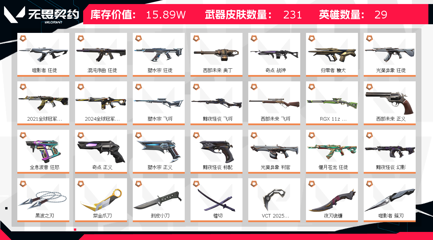 首页 > 租号大厅 > 无畏契约-wegame > wegame/wegame > 【16万库存2330R点】25狂徒15幻影【21+24冠军】显卡VCT爪奇点蝴蝶塑水宗套装