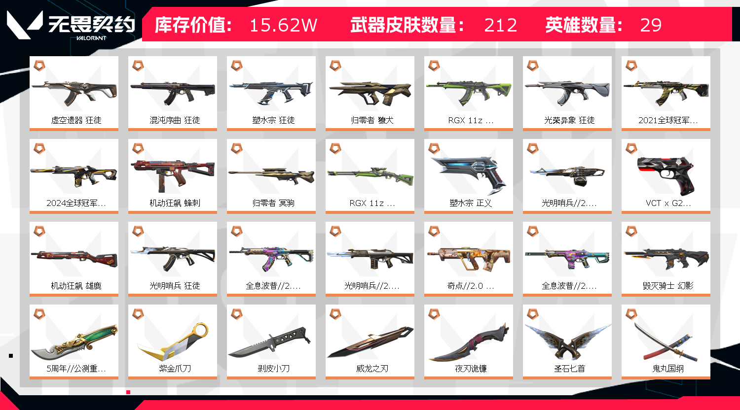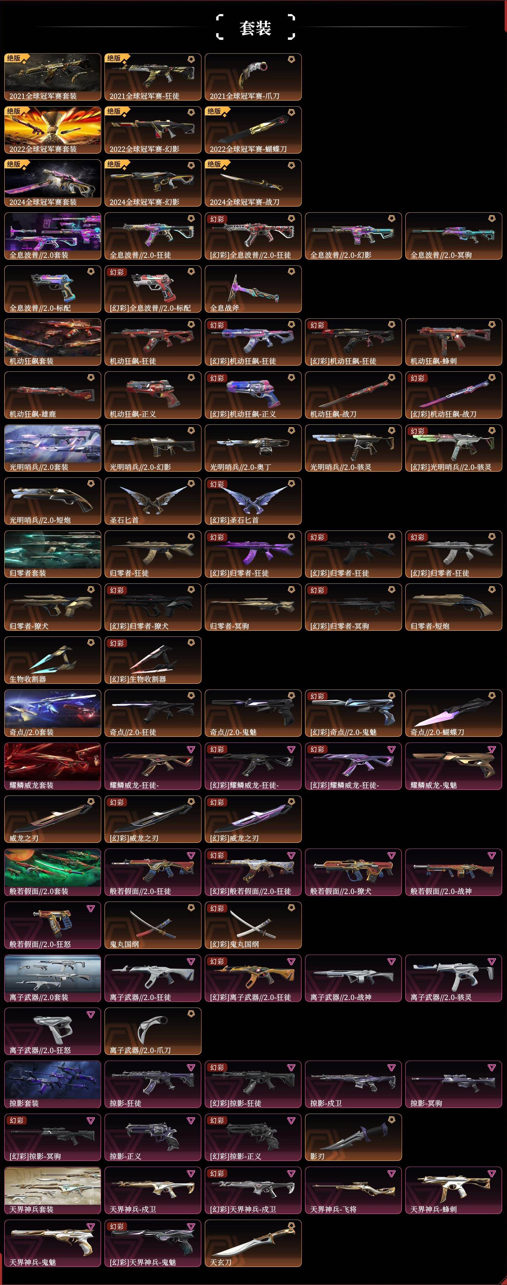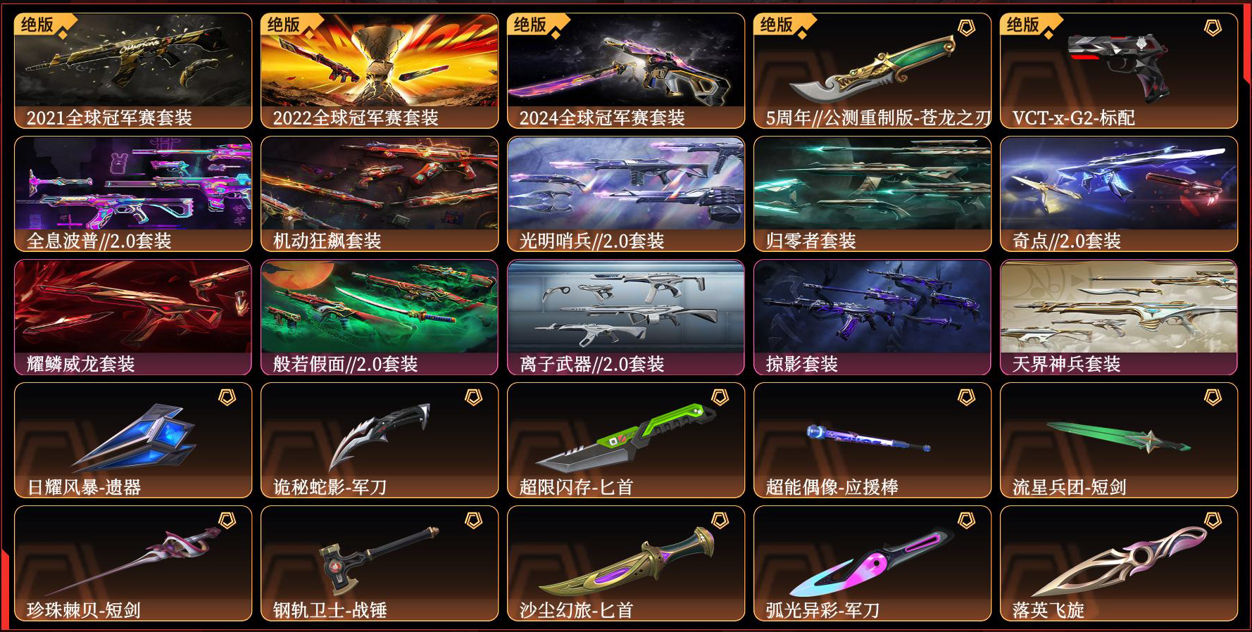 【拥有套装】2022全球冠军赛套装(2022全球冠军赛-幻影,2022全球冠军赛-蝴蝶刀)离子武器//2.0套装(离子武器//2.0-狂徒,离子武器//2.0-战神,离子武器//2.0-骇灵,离子武器//2.0-狂怒,离子武器//2.0-爪刀)全息波普2.0套装(全息波普//2.0-狂徒,全息波普//2.0-幻影,全息波普//2.0-冥驹,全息波普//2.0-标配,全息战斧)奇点2.0套装(奇点//2.0-狂徒,奇点//2.0-鬼魅,奇点//2.0-蝴蝶刀)般若假面2.0套装(般若假面//2.0-狂徒,般若假面//2.0-獠犬,般若假面//2.0-战神,般若假面//2.0-狂怒,鬼丸国纲)机动狂飙套装(机动狂飙-狂徒,机动狂飙-蜂刺,机动狂飙-雄鹿,机动狂飙-正义,机动狂飙-战刀)光明哨兵2.0套装(光明哨兵//2.0-幻影,光明哨兵//2.0-奥丁,光明哨兵//2.0-骇灵,光明哨兵//2.0-短炮,圣石匕首)2024全球冠军赛套装(2024全球冠军赛-幻影,2024全球冠军赛-战刀)2021全球冠军赛套装(2021全球冠军赛-狂徒,2021全球冠军赛-爪刀)归零者套装(归零者-獠犬,归零者-狂徒,归零者-冥驹,归零者-短炮,生物收割器)天界神兵套装(天界神兵-戍卫,天界神兵-飞将,天界神兵-蜂刺,天界神兵-鬼魅,天玄刀)耀鳞威龙套装(耀鳞威龙-狂徒,耀鳞威龙-鬼魅,威龙之刃)掠影套装(掠影-狂徒,掠影-冥驹,掠影-戍卫,掠影-正义,影刃)