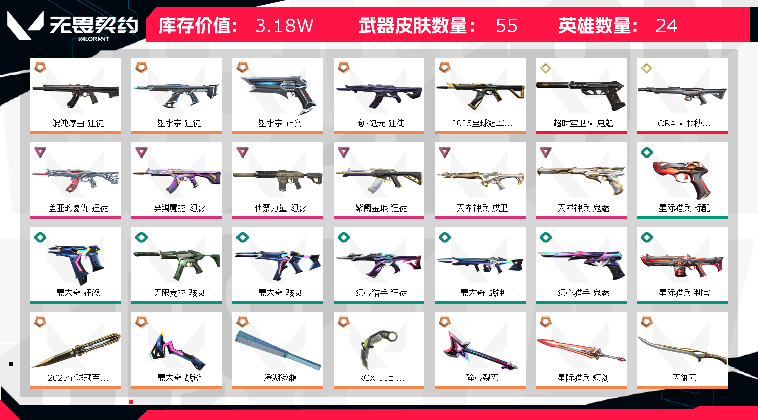 首页 > 租号大厅 > 无畏契约-wegame > wegame/wegame > 3W库存✨25冠军套装✨显卡爪 天御刀 鱼扇✨塑水 混沌 创纪元 盖亚 紫金狂徒✨魔蛇侦察颗秒幻影✨
