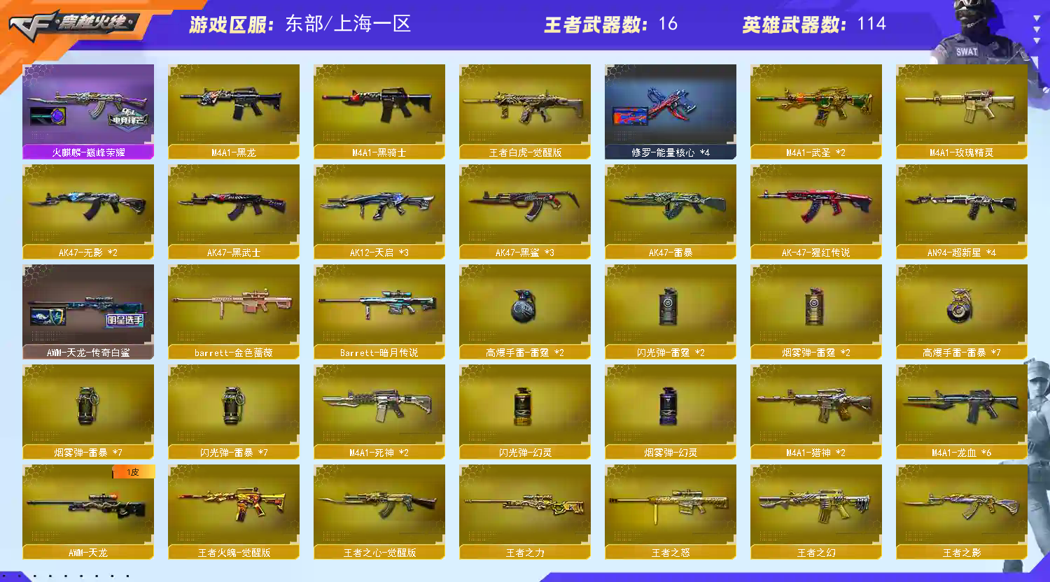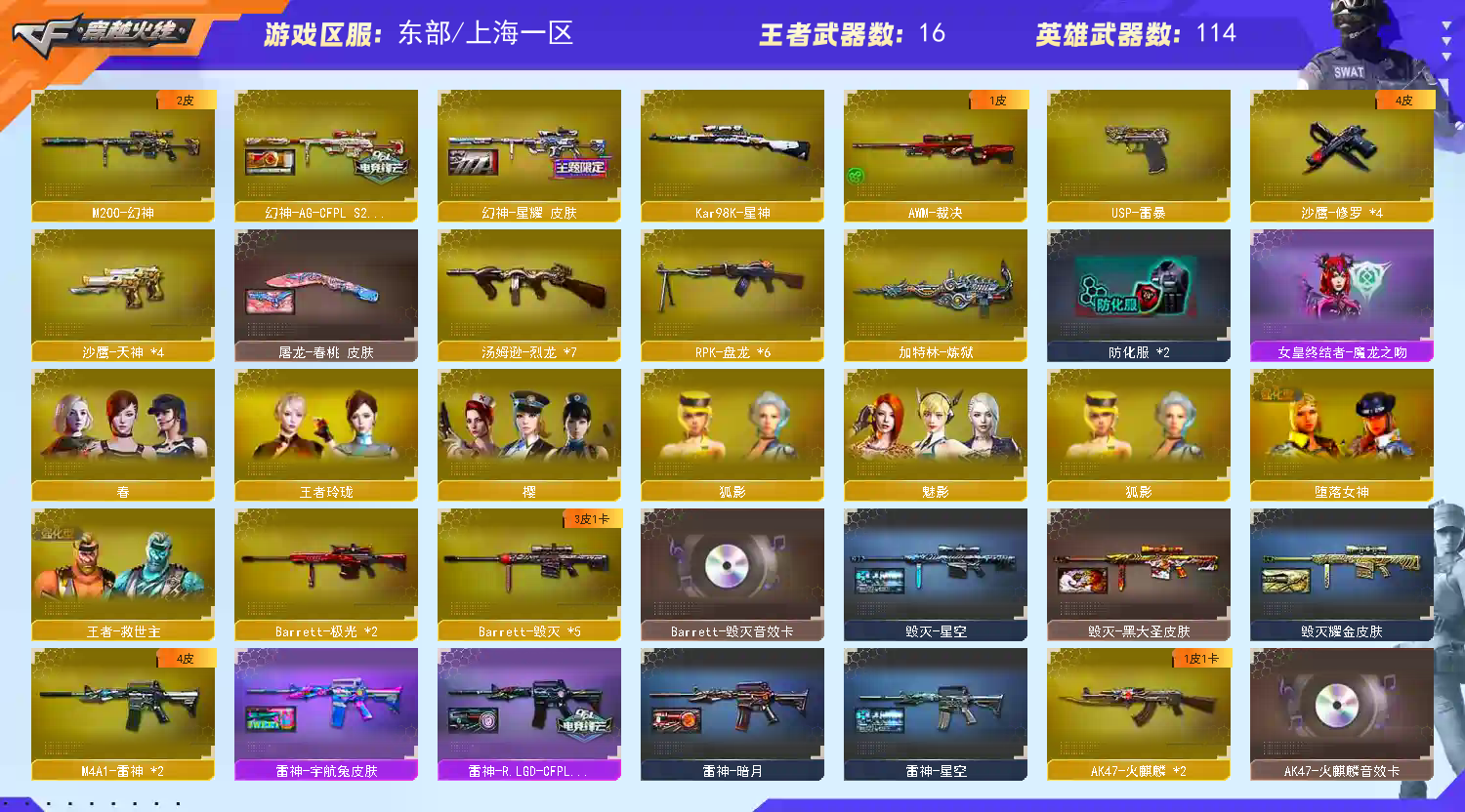 【M200-幻神+ag24冠军+幻神-星耀】【Kar98K-星神】【王者白虎】【生化 6盘龙 炼狱 6烈龙 死亡之眼】【裁决】【Barrett-毁灭+音效卡】【极光】【雷暴套】【AK47-火麒麟+音效卡+巅峰荣耀】【黑龙】【M4A1-雷神+雷神-lgd18冠军】【黑骑士】【王者之心 王者火魄】【无影 死神 黑武士 天启 超新星 黑鲨 龙血 玫瑰精灵】【9手枪 修罗*4 天神*4 usp雷暴】【15近战 屠龙*6 龙啸 麒麟刺*4 斩神刀雷暴 王者之击】【手雷 雷霆雷 雷暴雷】【角色 春 狐影】;USP-雷暴,RPK-盘龙,M200-幻神,Kar98K-星神,